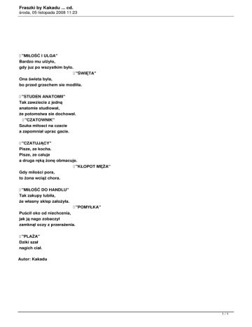 Fraszki by Kakadu ... cd. środa, 05 listopada 2008 11:23 "MIŁOŚĆ I ULGA" Bardzo mu ulżyło, gdy juz po wszystkim było. "ŚWIĘTA" Ona świeta była, bo przed grzechem sie modliła. "STUDEN ANATOMII" Tak zawziecie z jedną anatomie studiował, że potomstwa sie dochował. "CZATOWNIK" Szuka miłosci na czacie a zapomniał uprac gacie. "CZATUJĄCY" Pisze, ze kocha. Pisze, ze całuje a druga ręką żonę obmacuje. "KŁOPOT MĘŻA" Gdy miłości pora, to żona wciąż chora. "MIŁOŚĆ DO HANDLU" Tak zakupy lubiła, że własny sklep założyła. "POMYŁKA" Puścił oko od niechcenia, jak ją nago zobaczył zamknął oczy z przerażenia. "PLAŻA" Dziki szał nagich ciał. Autor: Kakadu 1/1