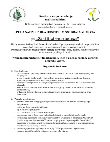 Konkurs na prezentację multimedialną Koło Żarskie Towarzystwa Pomocy im. św. Brata Alberta ogłasza konkurs w ramach akcji: „POLA NADZIEI” DLA HOSPICJUM ŚW. BRATA ALBERTA pn. „Żonkilowi wolontariusze” Kiedy wiosną kwitną żonkilowe „Pola Nadziei” przypominają o akcji hospicyjnej na rzecz ludzi cierpiących, oczekujących naszej pomocy, opieki. Pomagając chorym przekraczamy barierę cierpienia i lęku, dajemy nadzieję na życie w otoczeniu życzliwych ludzi. Wykonaj prezentację, film ukazujący ideę niesienia pomocy osobom potrzebującym. Regulamin konkursu 1. Cele konkursu: • prezentowanie i popularyzowanie twórczości artystycznej młodzieży propagującej idee hospicyjne, • wykorzystanie języka sztuki i technologii komputerowej do prowadzenia dialogu społecznego o potrzebach ludzi chorych i cierpiących, • rozwijanie kreatywności i odwagi w wyrażaniu uczuć w stosunku do osób nieuleczalnie chorych, • kształtowanie postawy otwartości wobec otaczającego świata w aspekcie działalności dobroczynnej, • wdrażanie do korzystania z różnorodnych źródeł informacji z poszanowaniem praw autorskich. 2. Warunki uczestnictwa: • prace do konkursu mogą zgłaszać placówki oświatowe, kulturalne, inne instytucje i organizacje; • ustala się dwie kategorie wiekowe: a) uczniowie gimnazjów, b) uczniowie szkół ponadgimnazjalnych. • prace mogą być wykonywane indywidualnie bądź w zespołach 2-osobowych; • prezentacja zgłoszona do konkursu powinna być wykonana w programie PowerPoint (pakiet programu Microsoft Office) bądź w programie Impress (pakiet OpenOffice) i zapisana w formacie umożliwiającym otwarcie jej bezpośrednio w w/w programach;. • czas trwania prezentacji 5-8 min; • prezentacja powinna być nagrana na płytę DVD i przesłana do organizatora;. • jako nazwę plików należy wpisać swoje nazwisko i imię; • • w prezentacji powinny być zawarte informacje o wykorzystywanych materiałach źródłowych oraz o autorach pracy; kryteria oceniania prac wykonanych indywidualnie i zespołowo są takie same; Pozostałe informacje: • każda płyta powinna zostać czytelnie opisana, należy podać: imię i nazwisko autora, wiek i kategorię wiekową, telefon kontaktowy, nazwę i adres szkoły lub placówki, telefon kontaktowy, e-mail, imię i nazwisko nauczyciela/opiekuna;. • prace należy dostarczyć do dnia 9 maja 2016 r. do siedziby Hospicjum św. Brata Alberta, ul. Pszenna 2, 68-200 Żary (teren Szpitala na Wyspie); • Termin podsumowania konkursu –22.05.2015 (o wynikach, godzinie i miejscu wystawy powiadomimy laureatów telefonicznie lub drogą elektroniczną). Uwagi końcowe: • Prace zgłoszone do konkursu przechodzą na własność organizatora. • Organizator zastrzega sobie prawo prezentacji, publikacji i reprodukowania prac konkursowych w prasie, w Internecie oraz wykorzystania ich w inny sposób w celach promocyjnych organizatora, bez wypłacania honorariów autorskich. • Udział w konkursie jest równoznaczny z akceptacją warunków regulaminu oraz zgodą na przetwarzanie danych osobowych [rzez uczestnika konkursu lub w przypadku osób niepełnoletnich przez ich prawnych opiekunów dla potrzeb promocyjnych zgodnie z Ustawą o ochronie danych osobowych z dn. 29.08.1997r. (Dz. U. z 2015 r. poz. 2135, z późn. zm.). • Organizator nie odpowiada za uszkodzenia lub zniszczenia prac podczas przesyłania lub transportu. Informacji w sprawie konkursu udzielają: Agnieszka Fetzka – koordynator wolontariatu Hospicjum oraz Małgorzata Rusak – lider wolontariatu akcyjnego Hospicjum: poprzez e-mail: [email protected] poprzez facebook: Hospicjum św. Brata Alberta w Żarach telefonicznie: 68 475 76 48, 531 939 016 lub osobiście w siedzibie Hospicjum św. Brata Alberta w Żarach ul. Pszenna 2 (teren „Szpitala na Wyspie”), w każdy poniedziałek w godzinach 11:00 - 15:30
