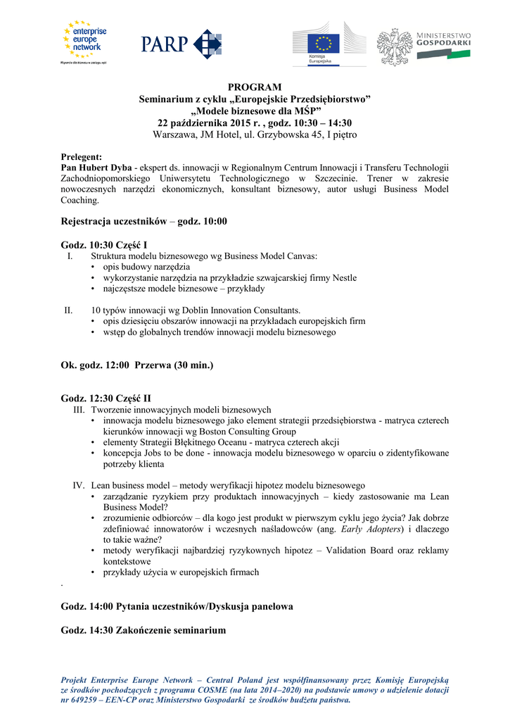 PROGRAM Seminarium z cyklu „Europejskie Przedsiębiorstwo” „Modele biznesowe dla MŚP” 22 października 2015 r. , godz. 10:30 – 14:30 Warszawa, JM Hotel, ul. Grzybowska 45, I piętro Prelegent: Pan Hubert Dyba - ekspert ds. innowacji w Regionalnym Centrum Innowacji i Transferu Technologii Zachodniopomorskiego Uniwersytetu Technologicznego w Szczecinie. Trener w zakresie nowoczesnych narzędzi ekonomicznych, konsultant biznesowy, autor usługi Business Model Coaching. Rejestracja uczestników – godz. 10:00 Godz. 10:30 Część I I. II. Struktura modelu biznesowego wg Business Model Canvas: • opis budowy narzędzia • wykorzystanie narzędzia na przykładzie szwajcarskiej firmy Nestle • najczęstsze modele biznesowe – przykłady 10 typów innowacji wg Doblin Innovation Consultants. • opis dziesięciu obszarów innowacji na przykładach europejskich firm • wstęp do globalnych trendów innowacji modelu biznesowego Ok. godz. 12:00 Przerwa (30 min.) Godz. 12:30 Część II III. Tworzenie innowacyjnych modeli biznesowych • innowacja modelu biznesowego jako element strategii przedsiębiorstwa - matryca czterech kierunków innowacji wg Boston Consulting Group • elementy Strategii Błękitnego Oceanu - matryca czterech akcji • koncepcja Jobs to be done - innowacja modelu biznesowego w oparciu o zidentyfikowane potrzeby klienta IV. Lean business model – metody weryfikacji hipotez modelu biznesowego • zarządzanie ryzykiem przy produktach innowacyjnych – kiedy zastosowanie ma Lean Business Model? • zrozumienie odbiorców – dla kogo jest produkt w pierwszym cyklu jego życia? Jak dobrze zdefiniować innowatorów i wczesnych naśladowców (ang. Early Adopters) i dlaczego to takie ważne? • metody weryfikacji najbardziej ryzykownych hipotez – Validation Board oraz reklamy kontekstowe • przykłady użycia w europejskich firmach . Godz. 14:00 Pytania uczestników/Dyskusja panelowa Godz. 14:30 Zakończenie seminarium Projekt Enterprise Europe Network – Central Poland jest współfinansowany przez Komisję Europejską ze środków pochodzących z programu COSME (na lata 2014–2020) na podstawie umowy o udzielenie dotacji nr 649259 – EEN-CP oraz Ministerstwo Gospodarki ze środków budżetu państwa.