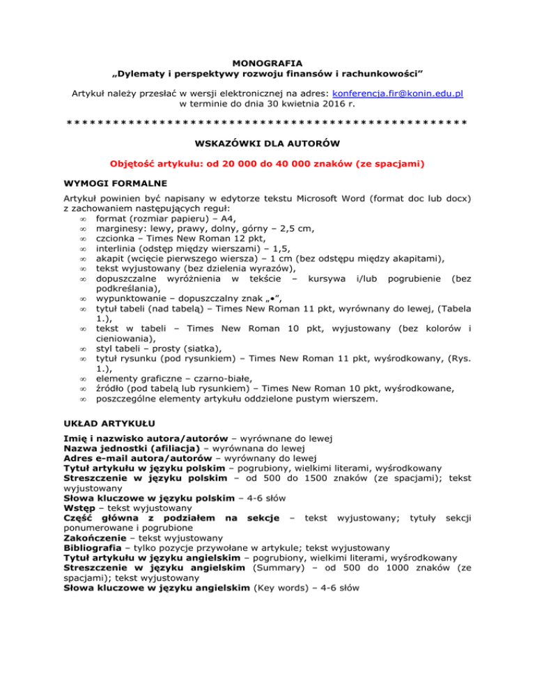 MONOGRAFIA „Dylematy i perspektywy rozwoju finansów i rachunkowości” Artykuł należy przesłać w wersji elektronicznej na adres: [email protected] w terminie do dnia 30 kwietnia 2016 r. **************************************************** WSKAZÓWKI DLA AUTORÓW Objętość artykułu: od 20 000 do 40 000 znaków (ze spacjami) WYMOGI FORMALNE Artykuł powinien być napisany w edytorze tekstu Microsoft Word (format doc lub docx) z zachowaniem następujących reguł: • format (rozmiar papieru) – A4, • marginesy: lewy, prawy, dolny, górny – 2,5 cm, • czcionka – Times New Roman 12 pkt, • interlinia (odstęp między wierszami) – 1,5, • akapit (wcięcie pierwszego wiersza) – 1 cm (bez odstępu między akapitami), • tekst wyjustowany (bez dzielenia wyrazów), • dopuszczalne wyróżnienia w tekście – kursywa i/lub pogrubienie (bez podkreślania), • wypunktowanie – dopuszczalny znak „•”, • tytuł tabeli (nad tabelą) – Times New Roman 11 pkt, wyrównany do lewej, (Tabela 1.), • tekst w tabeli – Times New Roman 10 pkt, wyjustowany (bez kolorów i cieniowania), • styl tabeli – prosty (siatka), • tytuł rysunku (pod rysunkiem) – Times New Roman 11 pkt, wyśrodkowany, (Rys. 1.), • elementy graficzne – czarno-białe, • źródło (pod tabelą lub rysunkiem) – Times New Roman 10 pkt, wyśrodkowane, • poszczególne elementy artykułu oddzielone pustym wierszem. UKŁAD ARTYKUŁU Imię i nazwisko autora/autorów – wyrównane do lewej Nazwa jednostki (afiliacja) – wyrównana do lewej Adres e-mail autora/autorów – wyrównany do lewej Tytuł artykułu w języku polskim – pogrubiony, wielkimi literami, wyśrodkowany Streszczenie w języku polskim – od 500 do 1500 znaków (ze spacjami); tekst wyjustowany Słowa kluczowe w języku polskim – 4-6 słów Wstęp – tekst wyjustowany Część główna z podziałem na sekcje – tekst wyjustowany; tytuły sekcji ponumerowane i pogrubione Zakończenie – tekst wyjustowany Bibliografia – tylko pozycje przywołane w artykule; tekst wyjustowany Tytuł artykułu w języku angielskim – pogrubiony, wielkimi literami, wyśrodkowany Streszczenie w języku angielskim (Summary) – od 500 do 1000 znaków (ze spacjami); tekst wyjustowany Słowa kluczowe w języku angielskim (Key words) – 4-6 słów CYTOWANIA I BIBLIOGRAFIA Powołując się w tekście artykułu na publikacje innych autorów, należy podawać w nawiasie nazwisko i rok w układzie chronologicznym. Przykład: (Kowalski 2005) lub … zdaniem Kowalskiego (2005). Bibliografia powinna zawierać tylko źródła cytowane w artykule. Bibliografię należy zestawić w porządku alfabetycznym stosując standardy APA. Przykład: Adamowicz, M. (2003). Strategie rozwoju lokalnego. Aspekty instytucjonalne. Warszawa: Wydawnictwo SGGW. Białas-Motyl, A. (2012). Kluczowe aspekty metodologiczne statystyki transportu kolejowego w Unii Europejskiej. Wiadomości Statystyczne, nr 10, 43-53. Griffin, R.W. (1996). Podstawy zarządzania organizacjami. Warszawa: PWN. Krzemiński, S. (2003). Polityka transportowa a rozwój transportu. W: K. Szczepaniak, K. Zbytniewska (red.), Ekonomiczne instrumenty wsparcia ożywienia gospodarki w Polsce. Warszawa: Wydawnictwo SGH. Kubiński, P., Kwieciński, L., Żurawowicz, L. (2010). Naukowiec przedsiębiorcą. Własność intelektualna. Wrocław: Dolnośląska Platforma Promocji Przedsiębiorczości Akademickiej. Parysek, J. J. (2001). Podstawy gospodarki lokalnej. Poznań: Wydawnictwo UAM. Strategia Rozwoju Kraju 2020. (2012). Warszawa: Ministerstwo Rozwoju Regionalnego. Strahl, D. (red.). (1998). Taksonomia struktur w badaniach regionalnych. Wrocław: Wydawnictwo AE we Wrocławiu. Transport drogowy w Polsce w latach 2010 i 2011. (2013). Warszawa: GUS. Ustawa z dnia 27 lipca 2005 r. Prawo o szkolnictwie wyższym (2005). Dz.U. poz. 1365. Założenia realizacji Programu Operacyjnego Polska Cyfrowa. (2013). Pobrane 29 lipca 2013 z: https://www.funduszeeuropejskie.gov.pl