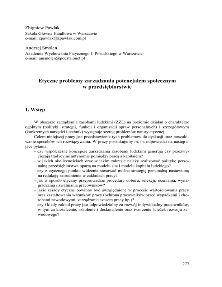 Zbigniew Pawlak Szkoła Główna Handlowa w Warszawie e-mail: [email protected] Andrzej Smoleń Akademia Wychowania Fizycznego J. Piłsudskiego w Warszawie e-mail: [email protected] Etyczne problemy zarządzania potencjałem społecznym w przedsiębiorstwie 1. Wstęp W obszarze zarządzania zasobami ludzkimi (ZZL) na poziomie działań o charakterze ogólnym (polityki, strategii, funkcji i organizacji spraw personalnych) i szczegółowym (konkretnych narzędzi i technik) występuje szereg problemów natury etycznej. Celem niniejszej pracy jest przedstawienie tych problemów do dyskusji oraz poszukiwanie sposobów ich rozwiązywania. W pracy poszukujemy m. in. odpowiedzi na następujące pytania: – czy współczesne koncepcje zarządzania zasobami ludzkimi generują czy przezwyciężają tradycyjne antynomie pomiędzy pracą a kapitałem? – w jakich okolicznościach oraz w jakim zakresie należy realizować politykę personalną przedsiębiorstwa opartą na modelu sita i modelu kapitału ludzkiego? – czy z etycznego punktu widzenia stosować można strategię personalną nastawioną na redukcję zatrudnienia w zakładach pracy? – jak w sposób etyczny przeprowadzić procedury doboru, selekcji, oceniania, wynagradzania i zwalniania pracowników? – jakie zasady etyczne powinny być uwzględnione w procesie wartościowania pracy oraz kształtowania warunków pracy (ochrona pracowników przed wypadkami i chorobami zawodowymi, zarządzanie czasem pracy itp.)? – czy i kiedy zakład pracy jest odpowiedzialny za rozwój indywidualny pracowników, w tym za kształcenie, szkolenie i doskonalenie oraz tworzenie ścieżek rozwoju zawodowego? 277 2. Ogólne koncepcje i modele zarządzania strategicznego zasobami ludzkimi z perspektywy etyki personalistycznej Ludzie wykonujący pracę dla przedsiębiorstwa określani są także jako: pracobiorcy, aktywa osobowe, kapitał ludzki, czynnik ludzki, potencjał pracy, zasoby ludzkie, zasoby pracy itp. Każde z tych określeń zawiera pewne akcenty natury aksjologicznej i etycznej. Np. określenie „czynnik ludzki” nawiązuje do rozróżnianych w ekonomii czynników produkcji. Do podstawowych czynników produkcji zalicza się ziemię i zasoby przyrody, środki produkcji (rzeczowe składniki produkcji), kapitał finansowy oraz pracę, czyli czynnik ludzki. Nie trudno zauważyć że z perspektywy ekonomicznej czynnik ludzki jest tylko jednym z kilku czynników produkcji wymienianym zwykle w ostatniej kolejności. Z etycznego punktu widzenia szczególnie cenne są te koncepcje zarządzania zasobami ludzkimi, które uznają priorytet pracy (czynnika ludzkiego) nad innymi czynnikami produkcji. Autorzy używający takich terminów, jak „potencjał ludzki”, „potencjał pracy”, „potencjał społeczny” najczęściej chcą podkreślić, że ludzie w firmie (a w pewnym sensie także praca) stanowią ważny, o ile nie najważniejszy zasób firmy. Nawiązują one, explicite lub implicite, do zasady pierwszeństwa „pracy” przed wąsko rozumianym „kapitałem” jako zespołem środków produkcji1. Potencjał społeczny to ludzie wykonujący pracę dla firmy z ich wiedzą, doświadczeniem, umiejętnościami, zdolnościami, predyspozycjami do pracy, motywacją i zdrowiem. Słowo „potencjał” oznacza ponadto, że pewne możliwości i talenty ludzi mogą się ujawnić i zostać zrealizowane dopiero po spełnieniu określonych warunków. „Sumę warunków życia społecznego, jakie bądź zrzeszeniom, bądź poszczególnym członkom społeczeństwa pozwalają osiągnąć pełniej i łatwiej własną doskonałość” nazywamy dobrem wspólnym 2. Uznanie wartości potencjału ludzkiego, także w kontekście znaczenia rozwoju nowoczesnych technologii i zdobywania przewagi konkurencyjnej na rynku prowadzi do odrzucania zawężonej koncepcji kapitału. Coraz częściej spotykamy się z określeniem „kapitał ludzki” w którym zawiera się myśl, że „wydatki przeznaczone na dobór, szkolenie i utrzymanie ludzi w firmie opłacają się, gdyż przynoszą przedsiębiorcy wartość dodatkową”3. Inwestycje w kapitał ludzki mogą mieć porównywalne znaczenie dla gospodarki jak inwestycje w infrastrukturę4. Źródłem antynomii pracy i kapitału nie jest proces produkcji, ani też proces ekonomiczny w szczególności tylko sam człowiek, który w swojej myśli dokonał rozbicia tego spójnego obrazu5. Ludzie wykonujący pracę dla przedsiębiorstwa mogą być zatrudniani na podstawie stosunku pracy lub angażowani do pracy na podstawie umów cywilnoprawnych. W praktyce spotkać się można z trzema modelami zatrudniania pracowników: etatowym, kontraktoPor. Jan Paweł II, Encyklika Laborem exercens, Encykliki Ojca Świętego Jana Pawła II, tom I, Wydawnictwo św. Stanisława B.M. Archidiecezji Krakowskiej, Kraków 1996, s. 124. 2 Por. Sobór Watykański II, Konstytucja Gaudium et spes; por. 74 oraz Katechizm Kościoła Katolickiego, Pallottinum 1994, s. 442 (1906). 3 Z. Pawlak, Personalna funkcja firmy – procesy i procedury kadrowe, Poltext, Warszawa 2003, s. 15. 4 Por. A. Szałkowski (red.), Rozwój pracowników. Przesłanki, cele, instrumenty, Poltext, Warszawa 2002, s. 14–15. 5 Por. Jan Paweł II, Encyklika Laborem exercens, op. cit., s. 126–127. 1 278 wym i elastycznym. W modelu zatrudnienia etatowego ludzie mają zagwarantowaną pracę, a co za tym idzie, określony poziom dochodów, jasną drogę rozwoju zawodowego i stabilność życiową. W modelu zatrudnienia kontraktowego pracownicy są związani z przedsiębiorstwem w sposób luźny, nietrwały, tj. na podstawie umów cywilnoprawnych. Luźne zatrudnianie pracowników umożliwia pracodawcy minimalizację kosztów pracy. Ludziom nie trzeba tworzyć stanowisk, unika się kosztów świadczeń np. świadczeń socjalnych. W tym modelu zatrudnienia pracownicy mogą wykonywać jednocześnie pracę na rzecz kilku zleceniodawców. Model ten ma jednak szereg mankamentów. Jego podsta