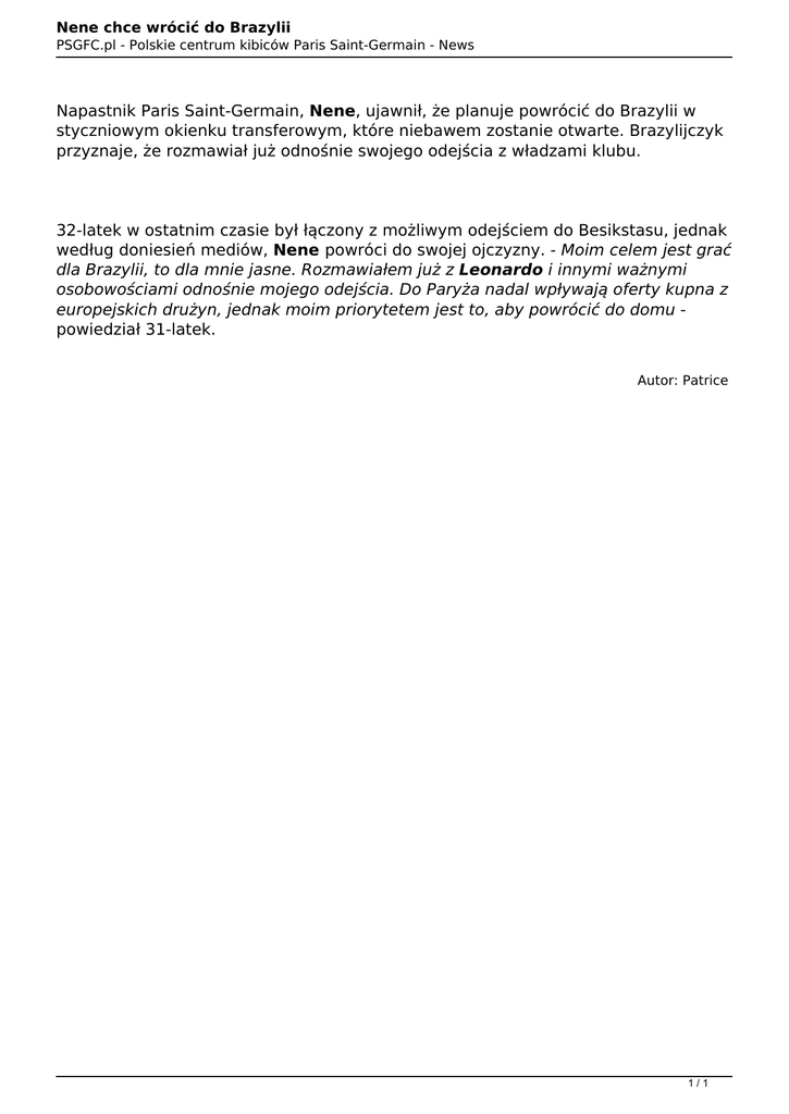 Nene chce wrócić do Brazylii PSGFC.pl - Polskie centrum kibiców Paris Saint-Germain - News Napastnik Paris Saint-Germain, Nene, ujawnił, że planuje powrócić do Brazylii w styczniowym okienku transferowym, które niebawem zostanie otwarte. Brazylijczyk przyznaje, że rozmawiał już odnośnie swojego odejścia z władzami klubu. 32-latek w ostatnim czasie był łączony z możliwym odejściem do Besikstasu, jednak według doniesień mediów, Nene powróci do swojej ojczyzny. - Moim celem jest grać dla Brazylii, to dla mnie jasne. Rozmawiałem już z Leonardo i innymi ważnymi osobowościami odnośnie mojego odejścia. Do Paryża nadal wpływają oferty kupna z europejskich drużyn, jednak moim priorytetem jest to, aby powrócić do domu powiedział 31-latek. Autor: Patrice 1/1 Powered by TCPDF (www.tcpdf.org)