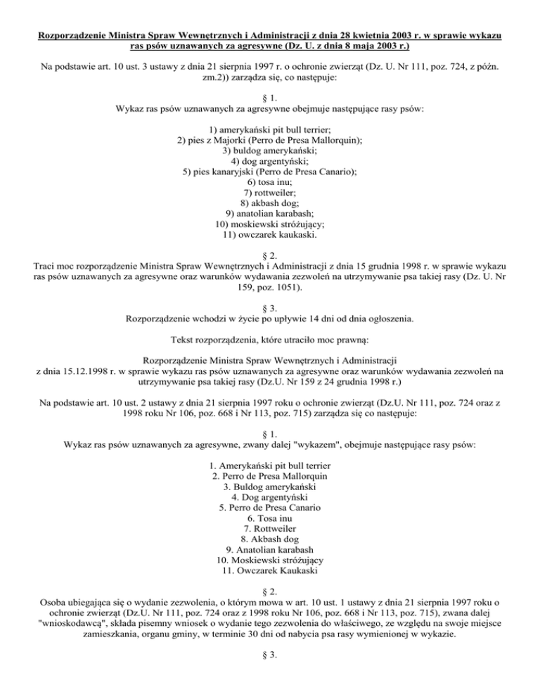 Rozporządzenie Ministra Spraw Wewnętrznych i Administracji z dnia 28 kwietnia 2003 r. w sprawie wykazu ras psów uznawanych za agresywne (Dz. U. z dnia 8 maja 2003 r.) Na podstawie art. 10 ust. 3 ustawy z dnia 21 sierpnia 1997 r. o ochronie zwierząt (Dz. U. Nr 111, poz. 724, z późn. zm.2)) zarządza się, co następuje: § 1. Wykaz ras psów uznawanych za agresywne obejmuje następujące rasy psów: 1) amerykański pit bull terrier; 2) pies z Majorki (Perro de Presa Mallorquin); 3) buldog amerykański; 4) dog argentyński; 5) pies kanaryjski (Perro de Presa Canario); 6) tosa inu; 7) rottweiler; 8) akbash dog; 9) anatolian karabash; 10) moskiewski stróżujący; 11) owczarek kaukaski. § 2. Traci moc rozporządzenie Ministra Spraw Wewnętrznych i Administracji z dnia 15 grudnia 1998 r. w sprawie wykazu ras psów uznawanych za agresywne oraz warunków wydawania zezwoleń na utrzymywanie psa takiej rasy (Dz. U. Nr 159, poz. 1051). § 3. Rozporządzenie wchodzi w życie po upływie 14 dni od dnia ogłoszenia. Tekst rozporządzenia, które utraciło moc prawną: Rozporządzenie Ministra Spraw Wewnętrznych i Administracji z dnia 15.12.1998 r. w sprawie wykazu ras psów uznawanych za agresywne oraz warunków wydawania zezwoleń na utrzymywanie psa takiej rasy (Dz.U. Nr 159 z 24 grudnia 1998 r.) Na podstawie art. 10 ust. 2 ustawy z dnia 21 sierpnia 1997 roku o ochronie zwierząt (Dz.U. Nr 111, poz. 724 oraz z 1998 roku Nr 106, poz. 668 i Nr 113, poz. 715) zarządza się co następuje: § 1. Wykaz ras psów uznawanych za agresywne, zwany dalej "wykazem", obejmuje następujące rasy psów: 1. Amerykański pit bull terrier 2. Perro de Presa Mallorquin 3. Buldog amerykański 4. Dog argentyński 5. Perro de Presa Canario 6. Tosa inu 7. Rottweiler 8. Akbash dog 9. Anatolian karabash 10. Moskiewski stróżujący 11. Owczarek Kaukaski § 2. Osoba ubiegająca się o wydanie zezwolenia, o którym mowa w art. 10 ust. 1 ustawy z dnia 21 sierpnia 1997 roku o ochronie zwierząt (Dz.U. Nr 111, poz. 724 oraz z 1998 roku Nr 106, poz. 668 i Nr 113, poz. 715), zwana dalej "wnioskodawcą", składa pisemny wniosek o wydanie tego zezwolenia do właściwego, ze względu na swoje miejsce zamieszkania, organu gminy, w terminie 30 dni od nabycia psa rasy wymienionej w wykazie. § 3. 1. Wniosek, o którym mowa w § 2, powinien zawierać oznaczenie wnioskodawcy i jego adres zamieszkania. 2. Do wniosku wnioskodawca dołącza pisemną informację: - o pochodzeniu psa, jego rasie, wieku, płci i ewentualnym sposobie oznakowania psa, - o miejscu i warunkach, w jakich wnioskodawca zamierza utrzymywać psa. § 4. 1. Właściciel psa rasy wymienionej w wykazie w ciągu 30 dni od dnia wejścia w życie rozporządzenia składa do organu gminy wniosek, o którym mowa w § 2. 2. Przepisy § 3 stosuje się odpowiednio. § 5. Rozporządzenie wchodzi w życie po upływie 14 dni od ogłoszenia. Minister Spraw Wewnętrznych i Administracji