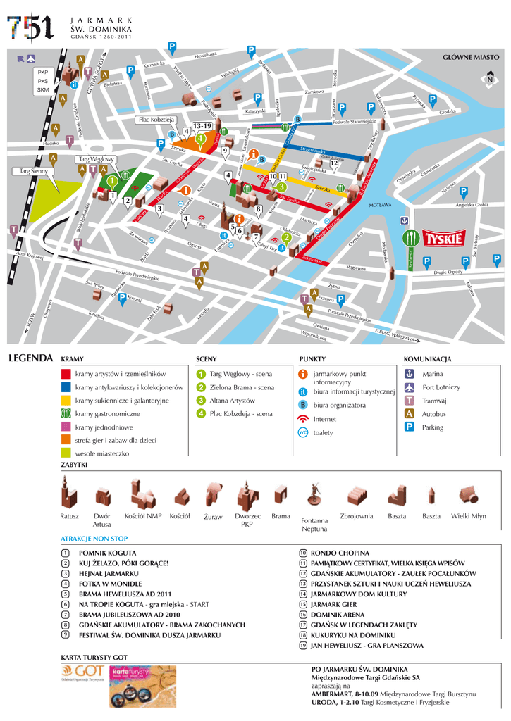 GŁÓWNE MIASTO it a jsk zie łod Ko 1 1 2 ska lar ęg W B 4 10 11 Gro bla I Targ Sienny Szklary 9 Targ Węglowy 3 Zaułek Z. Zappio 12 Wa rzyw nicz a 4 Tan deta 4 B B 13-19 Gro bla II G rob la I II Plac Kobzdeja e pc Stę Na 3 8 4 it 5 6 a sk ar am Kr 2 7 it Zielo ny M ost LEGENDA KRAMY SCENY PUNKTY kramy artystów i rzemieślników Targ Węglowy - scena kramy antykwariuszy i kolekcjonerów Zielona Brama - scena kramy sukiennicze i galanteryjne Altana Artystów kramy gastronomiczne Plac Kobzdeja - scena KOMUNIKACJA jarmarkowy punkt informacyjny biura informacji turystycznej Autobus Internet Parking toalety strefa gier i zabaw dla dzieci Port Lotniczy Tramwaj biura organizatora kramy jednodniowe Marina wesołe miasteczko ZABYTKI Ratusz Dwór Artusa Kościół NMP Kościół Żuraw Dworzec PKP Brama Fontanna Neptuna Zbrojownia Baszta Baszta Wielki Młyn ATRAKCJE NON STOP 1 2 3 4 5 6 7 8 9 POMNIK KOGUTA KUJ ŻELAZO, PÓKI GORĄCE! HEJNAŁ JARMARKU FOTKA W MONIDLE BRAMA HEWELIUSZA AD 2011 NA TROPIE KOGUTA - gra miejska - START BRAMA JUBILEUSZOWA AD 2010 GDAŃSKIE AKUMULATORY - BRAMA ZAKOCHANYCH FESTIWAL ŚW. DOMINIKA DUSZA JARMARKU 10 11 12 13 14 15 16 17 18 19 RONDO CHOPINA PAMIĄTKOWY CERTYFIKAT, WIELKA KSIĘGA WPISÓW GDAŃSKIE AKUMULATORY - ZAUŁEK POCAŁUNKÓW PRZYSTANEK SZTUKI I NAUKI UCZEŃ HEWELIUSZA JARMARKOWY DOM KULTURY JARMARK GIER DOMINIK ARENA GDAŃSK W LEGENDACH ZAKLĘTY KUKURYKU NA DOMINIKU JAN HEWELIUSZ - GRA PLANSZOWA KARTA TURYSTY GOT PO JARMARKU ŚW. DOMINIKA Międzynarodowe Targi Gdańskie SA zapraszają na AMBERMART, 8-10.09 Międzynarodowe Targi Bursztynu URODA, 1-2.10 Targi Kosmetyczne i Fryzjerskie