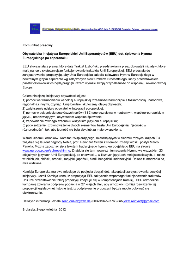 Komunikat prasowy Obywatelska Inicjatywa Europejskiej Unii Esperantystów (EEU) dot. śpiewania Hymnu Europejskiego po esperancku. EEU skorzystała z prawa, które daje Traktat Lizboński, przedstawiania przez obywateli inicjatyw, które mają na celu skuteczniejsze funkcjonowanie traktatów Unii Europejskiej. EEU przesłała do zarejestrowania propozycję, aby Unia Europejska zaleciła śpiewanie Hymnu Europejskiego w neutralnym języku esperanto wg załączonych słów Umberta Broccattelego, kiedy przedstawiciele państw członkowskich będą pragnęli razem wyrazić swoją przynależność do wspólnej, równoprawnej Europy. Celem niniejszej inicjatywy obywatelskiej jest: 1) pomoc we wzmocnieniu wspólnej europejskiej tożsamości harmonijnie z tożsamością narodową, regionalną i innymi, czyniąc Unię bardziej skuteczną dla jej obywateli; 2) zwiększenie udziału obywateli w integracji europejskiej; 3) pomoc w osiągnięciu powyższych celów (1 i 2) poprzez słowa w neutralnym, wspólno-europejskim języku, umożliwiającym obywatelom wspólne śpiewanie; 4) zapewnienie równego szacunku wszystkim językom europejskim; 5) potwierdzenie i zrównoważenie dwóch elementów hasła Unii Europejskiej “jedność w różnorodności” tak, aby jedność nie była zbyt lub za mało uwypuklona. Wśród siedmiu członków Komitatu Wspierającego, mieszkających w siedmiu różnych krajach EU znajduje się laureat nagrody Nobla, prof. Reinhard Selten z Niemiec i znany włoski polityk Marco Panella. Można zapoznać się z tekstem tradycyjnego hymnu europejskiego EEU na stronie www.europo.eu/eo/euhropahimno. Znajdują się tam również tłumaczenia Hymnu we wszystkich 23 oficjalnych językach Unii Europejskiej, po chorwacku, w licznych językach mniejszościowych, a także w takich jak, chiński, arabski, rosyjski, japoński, hindi, bengalski, indonezyjski. Dalsze tłumaczenia są mile widziane. Komisja Europejska ma dwa miesiące do podjęcia decyzji dot. akceptacji zarejestrowania powyżej inicjatywy. Jeżeli Komisja uzna, iż propozycja EEU faktycznie wspomaga funkcjonowanie traktatów Unii i że przedstawienie takiej propozycji znajduje się w kompetencjach Komisji, EEU rozpocznie kampanię zbierania podpisów poparcia w 27 krajach Unii, aby umożliwić Komisji rozważenie tej propozycji legislacyjnej. Istotne jest, iż podpisywanie propozycji będzie mogło odbywać się elektronicznie. Dalszych informacji udziela [email protected] (0032496-597763) lub [email protected]. Bruksela, 2-ego kwietnia 2012