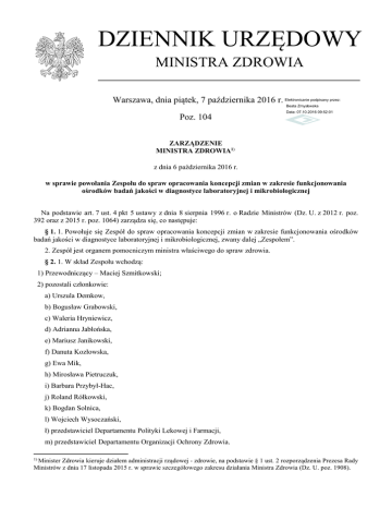 DZIENNIK URZĘDOWY MINISTRA ZDROWIA Warszawa, dnia piątek, 7 października 2016 r. Elektronicznie podpisany przez: Beata Zmysłowska Poz. 104 Data: 07.10.2016 09:52:01 ZARZĄDZENIE MINISTRA ZDROWIA1) z dnia 6 października 2016 r. w sprawie powołania Zespołu do spraw opracowania koncepcji zmian w zakresie funkcjonowania ośrodków badań jakości w diagnostyce laboratoryjnej i mikrobiologicznej Na podstawie art. 7 ust. 4 pkt 5 ustawy z dnia 8 sierpnia 1996 r. o Radzie Ministrów (Dz. U. z 2012 r. poz. 392 oraz z 2015 r. poz. 1064) zarządza się, co następuje: § 1. 1. Powołuje się Zespół do spraw opracowania koncepcji zmian w zakresie funkcjonowania ośrodków badań jakości w diagnostyce laboratoryjnej i mikrobiologicznej, zwany dalej „Zespołem”. 2. Zespół jest organem pomocniczym ministra właściwego do spraw zdrowia. § 2. 1. W skład Zespołu wchodzą: 1) Przewodniczący – Maciej Szmitkowski; 2) pozostali członkowie: a) Urszula Demkow, b) Bogusław Grabowski, c) Waleria Hryniewicz, d) Adrianna Jabłońska, e) Mariusz Janikowski, f) Danuta Kozłowska, g) Ewa Mik, h) Mirosława Pietruczuk, i) Barbara Przybył-Hac, j) Roland Rółkowski, k) Bogdan Solnica, l) Wojciech Wysoczański, ł) przedstawiciel Departamentu Polityki Lekowej i Farmacji, m) przedstawiciel Departamentu Organizacji Ochrony Zdrowia. Minister Zdrowia kieruje działem administracji rządowej - zdrowie, na podstawie § 1 ust. 2 rozporządzenia Prezesa Rady Ministrów z dnia 17 listopada 2015 r. w sprawie szczegółowego zakresu działania Ministra Zdrowia (Dz. U. poz. 1908). 1) Dziennik Urzędowy Ministra Zdrowia –2– Poz. 104 2. Przewodniczący wyznacza Zastępcę Przewodniczącego spośród członków Zespołu. 3. Przed powołaniem w skład Zespołu, członkowie Zespołu, o których mowa w ust. 1 pkt 2 lit. a-b, e-g, i-k, wyrażają pisemną zgodę na udział w pracach Zespołu. 4. W pracach Zespołu mogą brać udział, z głosem doradczym, osoby niebędące jego członkami, zaproszone przez Przewodniczącego. 5. Członkowie Zespołu oraz osoby, o których mowa w ust. 4, są obowiązani do zachowania poufności informacji związanych z działalnością Zespołu. § 3. Zadaniem Zespołu jest opracowanie dokumentu, zawierającego koncepcję zmian w zakresie funkcjonowania ośrodków badań jakości w diagnostyce laboratoryjnej i mikrobiologicznej. § 4. 1. Pracami Zespołu kieruje Przewodniczący. 2. Do zadań Przewodniczącego należy: 1) zwołanie posiedzenia Zespołu; 2) ustalenie porządku dziennego posiedzenia Zespołu; 3) prowadzenie posiedzeń Zespołu; 4) planowanie i organizowanie pracy Zespołu; 5) reprezentowanie Zespołu na zewnątrz; 6) powołanie grup roboczych. 3. W przypadku nieobecności Przewodniczącego, jego zadania wykonuje Zastępca Przewodniczącego, a w przypadku ich nieobecności, wyznaczony przez Przewodniczącego członek Zespołu. § 5. 1. Zespół obraduje na posiedzeniach. 2. Zespół podejmuje decyzje w formie uchwał, zwykłą większością głosów, w obecności co najmniej połowy ogólnej liczby członków Zespołu. 3. W przypadku równej liczby głosów decyduje głos Przewodniczącego. 4. Uchwały podpisuje Przewodniczący. § 6. 1. Obsługę organizacyjno-techniczną Zespołu zapewnia Departament Organizacji Ochrony Zdrowia w Ministerstwie Zdrowia. 2. Z tytułu uczestnictwa w posiedzeniach Zespołu jego członkom oraz osobom, o których mowa w § 2 ust. 4, nie przysługuje wynagrodzenie. 3. Zamiejscowym członkom Zespołu oraz osobom, o których mowa w § 2 ust. 4, przysługuje zwrot kosztów podróży na terenie kraju, w związku z udziałem w posiedzeniach Zespołu, na zasadach określonych w rozporządzeniu Ministra Pracy i Polityki Społecznej z dnia 29 stycznia 2013 r. w sprawie należności przysługujących pracownikowi zatrudnionemu w państwowej lub samorządowej jednostce sfery budżetowej z tytułu podróży służbowej (Dz. U. poz. 167). 4. Wydatki związane z działalnością Zespołu, w tym koszty podróży, o których mowa w ust. 3, pokrywane są z budżetu państwa, z części 46 – Zdrowie, działu 851 – Ochrona zdrowia, rozdziału 85195 – Pozostała działalność, w części pozostającej w dyspozycji Departamentu Organizacji Ochrony Zdrowia w Ministerstwie Zdrowia. § 7. Pierwsze posiedzenie Zespołu Przewodniczący zwołuje nie później niż w terminie 14 dni od dnia wejścia w życie zarządzenia. § 8. Zespół zakończy swoją działalność po realizacji zadania, o którym mowa w § 3, nie później jednak niż z dniem 31 marca 2017 r. § 9. Zarządzenie traci moc z dniem 31 marca 2017 r. Dziennik Urzędowy Ministra Zdrowia –3– Poz. 104 § 10. Zarządzenie wchodzi w życie z dniem następującym po dniu ogłoszenia. Minister Zdrowia