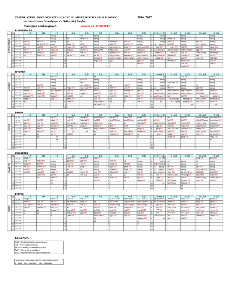 ZESPÓŁ SZKÓŁ OGÓLNOKSZTAŁCĄCYCH I MISTRZOSTWA SPORTOWEGO im. Jana Izydora Sztaudyngera w Szklarskiej Porębie PONIEDZIAŁEK Plan zajęć edukacyjnych lp PONIEDZIAŁEK IA 1. 7.40 - 8.25 2. 8.30 - 9.15 3. 9.25 - 10.10 4. 10.20 - 11.05 5. 11.15 - 12.00 6. 12.10 - 12.55 7. 13.15 - 14.00 8. 14.15 - 15.00 9 15.05 - 15.50 10 15.55 - 16.40 11 16.45 - 17.30 12 17.35 - 18.20 IB zmiana od 27.02.2017 IS trening II A III A 1. trening 2. wf j.ang 111 trening trening 3. technika113 j.pol.105 j.niem 113 mat 203 zaj.art.113 10 niem209 /ang115 5. biologia 111 6. mat 202 7. zaj. art.113 8. chemia210 9 religia 202 10 11 11 12 12 wf trening hist 105 trening zaj. z wych 213 trening 2. inf/ biol 111 hist 104 j.niem Klub mat 202 j.pol 105 j.ang 115 fizyka 213 5. j.niem 113 3. wf 4. geogr 105 inf/ II S trening wf j.pol 201 mat 203 inf/ II B inf/ geogr 105 1. mat 203 j.ang Klub j.pol 201 j.pol 201 2016 /2017 6. mat 202 7. biol 111 8. zaj. art.113 9 4. j.pol 201 zaj.z wych św. fizyka 210 plastyka 113 ang104/niem niem 201/ang105 III B III S I LA+ I LS trening 1. II LAB trening trening trening trening HiS 104 rel. 113/etyk104 trrening trening HiS 104 mat r213/mat203 j.pol 106 chemia210 biol 111 chemia 210 j.pol 106 religia 106 j.pol 106 j.pol 106 niem209/ang biol 111 mat r 203 religia Klub HiS 204 niem/ang204 biol 111 mat r 203 j.pol 201 j.pol 201 trening 3. trening trening fizyka 210 j.pol 201 hist 105 ang/niem105 niem213/ang106 zaj. z wych Bibl religia Bibl fizyka 213 ang106/niem105 niem201/ang105 j.pol 106 mat 202 mat r 213 mat r213/mat203 HiS 104 7. chemia 210 8. matr 203/mat 202 chemia210 religia 202 biol 111 9 chemia 210 10 inf/ 5. III LS trening j.pol 106 j.pol 106 2. trening trening wf III LAB religia 104 trening mat 203 chemia 210 4. II LS trening j.pol 201 6. niem 209/ang115 11 12 trening WTOREK WTOREK lp IA IB IS II A 1. 7.40 - 8.25 mat 203 1. 2. 8.30 - 9.15 trening 2. 3. 9.25 - 10.10 3. 4. 10.20 - 11.05 5. 11.15 - 12.00 6. 12.10 - 12.55 trening trening trening zaj. z wych Klub 7. 13.15 - 14.00 geog 106 8. 14.15 - 15.00 9 15.05 - 15.50 fizyka 210 j.ang 113 10 15.55 - 16.40 11 16.45 - 17.30 11 12 17.35 - 18.20 12 mat 203 chemia 210 j.ang Klub plastyka 113 religia 104 biol 111 j.pol 106 j.ang 105 religia 210 j.niem 104 II B III A 1. j.pol 106 trening 2. 8. mat 202 inf/ trening trening trening mat 202 geogr105 j.pol 106 j.pol 106 ang104/niem111 zaj. z wych 104 3. 7. hist 104 biol 111 rel 105/etyk104 zaj. z wych 111 mat 203 fizyka213 4. 5. religia 113 6. j.pol 106 9 fizyka 210 10 j.ang 201 inf/ II S inf 4. inf/ 5. hist 104 6. j.pol 201 7. j.pol 201 8. mat 203 9 wf III B j.pol 201 j.pol 201 technika 113 mat 113 religia 201 wf wf 10 wf III S I LA+I LS 1. inf trening 2. trening trening trening trening j.pol 115 j.pol 115 hist 115 biol 111 mat 202 3. trening trening wf trening hist 104 matrBibl/mat202 4. 5. 6. 7. 8. ang204/niem213 9 niem209/ang201 wf 10 11 11 12 12 II LAB II LS III LAB j.pol 106 trening III LS j.pol 201 trening zaj.z wych106 trening wf trening HiS 105 trening ang213/niem209 ang213/niem209 niem203/ang209 niem203/ang209 biol 111 biol 111 fiz213/geogr fiz/geog105 fiz213/geogr fiz/geog105 wf j.pol 202 fiz204/bio fiz204/biol /geogr105 mat r203/mat mat r 203 trening trening trening fiz/biol111 fiz/biol 111 /geogr105 mat r/mat202 mat r 203 wf wf ŚRODA ŚRODA lp IA 1. 7.40 - 8.25 2. 8.30 - 9.15 3. 9.25 - 10.10 4. 10.20 - 11.05 5. 11.15 - 12.00 6. 12.10 - 12.55 7. 13.15 - 14.00 8. 14.15 - 15.00 9 15.05 - 15.50 10 IB IS II A II B II S III A III B III S I LA+ I LS mat 203 1. j.ang 106 religia201 ang202/niem115 1. zaj.art 113 zaj.art 113 zaj.art 113 1. PP 104 II LAB II LS III LAB III LS biol 111 biol 111 chem210/geogr chem/geog105 mat 203 hist 104 religia 113 2. j.pol 106 historia 213 mat 202 2. ang115/niem ang 209/niem ang/niem201 2. rel Klub biol111 biol 111 chem210/geogr chem/geogr105 hist 104 geog 105 j.pol 106 j.ang111 j.pol 106 j.pol 106 mat202 geog 105 j.niem105 chemia 210 plastyka113 3. rel115/etyka 209 technika113 j.ang 203 chemia210 religia Kuub historia104 angKlub/niem209 3. wf 6. 6. mat 203 wf inf/ hist 104 wf wf chemia 213 mat 115 geogr104 religia Klub 3. matr203/mat202 j.pol 201 wf relBib biol 111 godz.zwych113 plastyka113 chemia210 mat r202 mat r 202/ mat j.pol 106 religia 111 geogr 105 chemia 210 religia Klub mat r/mat 203 HiS 104 j.pol 201 geogr 105 niem 201/ang ang213/niem religia Bibl matr213/mat mat r 213 wf wf wf 4. technika 113 5. j.ang 213 wf 7. mat 203 wf 4. biol 111 5. religia115 7. chemia210 inf wf j.pol 201 geog 105 5. niem 209/ang210 6. wos105 7. 4. 8. 8. 9 9 8. 9 15.55 - 16.40 10 10 10 11 16.45 - 17.30 11 11 11 12 17.35 - 18.20 12 12 12 niem/ang111 ang/niem209 j.pol 201 mat r/mat 202 zaj. z wych106 religia 106 wf CZWARTEK CZWARTEK lp IA IB IS II A II B II S III A 1. 7.40 - 8.25 religia 111 1. zaj.art 113 zaj.art 201 wos 104 1. 2. 8.30 - 9.15 j.ang 104 religia 111 trening 2. geog 105 j.pol 106 trening 2. mat 203 3. 9.25 - 10.10 3. geog 105 trening 4. j.pol 201 11.15 - 12.00 12.10 - 12.55 7. 13.15 - 14.00 wf j.niem 105 mat 203 8. 14.15 - 15.00 trening j.pol 201 j.pol 201 fizyka 213 hist 105 5. religia 213 6. trening trening trening religia 113 j.pol106 j.pol 106 biol 111 wos104 j.ang 111 5. biol 111 chemia 210 mat 202 j.ang 210 j.niem 105 trening 10.20 - 11.05 fizyka210 mat 203 j.pol 106 j.pol 106 3. j.pol 106 4. inf/ inf/ 4. j.pol 106 5. wf 6. mat 202 7. inf/ 8. 6. fizyka 213 7. wf III B inf/ mat 203 geogr 105 fizyka 210 j.pol 111 8. EdB 105 wf hist104 9 inf/ III S I LA+ I LS III LAB III LS geog 105 geog 105 2. wf trening wf trening wf HiS 104 j.pol 201 mat r 203 niem213/j.ang biol111 fiz210/geog fiz210/geog trening trening trening zaj. z wych Klub niem/ang113 biol 111 fiz/geog 105 fiz/geogr105 wf j.pol 202 zaj. z wych203 fiz204/biol fiz204/biol niem203/ang mat r 203 trening trening trening fiz/biol 111 fiz/biol 111 j.niem/j.ang202 mat r203 trening trening trening hist 104 mat 202 j.pol 201 fizyka 213 203 EdB II LS 1. trening trening 3. EdB202trening 4. wf trening trening