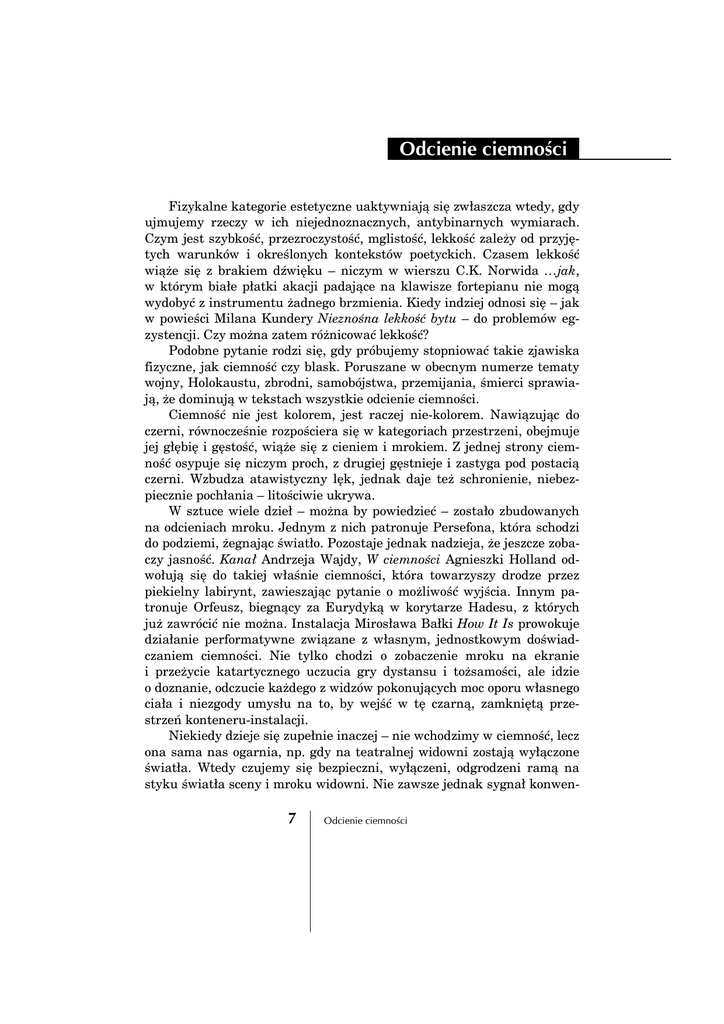 BOdcienie ciemnościB Fizykalne kategorie estetyczne uaktywniają się zwłaszcza wtedy, gdy ujmujemy rzeczy w ich niejednoznacznych, antybinarnych wymiarach. Czym jest szybkość, przezroczystość, mglistość, lekkość zależy od przyjętych warunków i określonych kontekstów poetyckich. Czasem lekkość wiąże się z brakiem dźwięku – niczym w wierszu C.K. Norwida …jak, w którym białe płatki akacji padające na klawisze fortepianu nie mogą wydobyć z instrumentu żadnego brzmienia. Kiedy indziej odnosi się – jak w powieści Milana Kundery Nieznośna lekkość bytu – do problemów egzystencji. Czy można zatem różnicować lekkość? Podobne pytanie rodzi się, gdy próbujemy stopniować takie zjawiska fizyczne, jak ciemność czy blask. Poruszane w obecnym numerze tematy wojny, Holokaustu, zbrodni, samobójstwa, przemijania, śmierci sprawiają, że dominują w tekstach wszystkie odcienie ciemności. Ciemność nie jest kolorem, jest raczej nie-kolorem. Nawiązując do czerni, równocześnie rozpościera się w kategoriach przestrzeni, obejmuje jej głębię i gęstość, wiąże się z cieniem i mrokiem. Z jednej strony ciemność osypuje się niczym proch, z drugiej gęstnieje i zastyga pod postacią czerni. Wzbudza atawistyczny lęk, jednak daje też schronienie, niebezpiecznie pochłania – litościwie ukrywa. W sztuce wiele dzieł – można by powiedzieć – zostało zbudowanych na odcieniach mroku. Jednym z nich patronuje Persefona, która schodzi do podziemi, żegnając światło. Pozostaje jednak nadzieja, że jeszcze zobaczy jasność. Kanał Andrzeja Wajdy, W ciemności Agnieszki Holland odwołują się do takiej właśnie ciemności, która towarzyszy drodze przez piekielny labirynt, zawieszając pytanie o możliwość wyjścia. Innym patronuje Orfeusz, biegnący za Eurydyką w korytarze Hadesu, z których już zawrócić nie można. Instalacja Mirosława Bałki How It Is prowokuje działanie performatywne związane z własnym, jednostkowym doświadczaniem ciemności. Nie tylko chodzi o zobaczenie mroku na ekranie i przeżycie katartycznego uczucia gry dystansu i tożsamości, ale idzie o doznanie, odczucie każdego z widzów pokonujących moc oporu własnego ciała i niezgody umysłu na to, by wejść w tę czarną, zamkniętą przestrzeń konteneru-instalacji. Niekiedy dzieje się zupełnie inaczej – nie wchodzimy w ciemność, lecz ona sama nas ogarnia, np. gdy na teatralnej widowni zostają wyłączone światła. Wtedy czujemy się bezpieczni, wyłączeni, odgrodzeni ramą na styku światła sceny i mroku widowni. Nie zawsze jednak sygnał konwen- 7 Odcienie ciemności cjonalnego rozwiązania służy poczuciu spokoju. W Ślubie Jerzego Jarockiego ciemność po stronie widzów była czynna, atakowała, sterowała tym, co ujawniała, kusiła zarówno obrazem, jak i jego zanikiem, budowała i wymazywała, zbliżała i oddalała sceniczny świat, który wyłaniał się znikąd, istniał na progu świadomości. Natomiast ciemność w teatrze plastycznym Leszka Mądzika ma wymiar bliski materii, zdaje się sama domagać dotknięcia, oceny jej faktury, określenia powierzchni i głębi. Scena teatru przenosi się niekiedy na przestrzeń miasta. Takim miastem-teatrem jest Wenecja, której sceneria sprzyja opowieści o śmierci i przemijaniu. Ograniczając światło, rozmywając kontury, ogromną rolę odgrywa tu mgła. Namacalna jej materialność wraz ze zdolnością wymazywania obrazu lub ukazywania go we fragmentach daje poczucie nierzeczywistości. Wydaje się, że wszystkim tym doświadczeniom może patronować sztuka Samuela Becketta, która powiązała wszystkie odcienie ciemności – uruchomiła ciemną moc absurdu, powołała do istnienia rozmaite warianty scenicznych rozwiązań gry światła i mroku, kontrastów czerni i bieli, użycia punktowych reflektorów i światła rozproszonego, doceniła ostrość i mglistość zjawiających się obrazów. Na koniec jednak w takich tekstach, jak Podrygi czy w sztuce telewizyjnej …jak obłoki poetyckie działanie określiło epistemologiczną niepewność (zwłaszcza poprzez przyjmujący postać haiku cytat z wiersza Williama Butlera Yeatsa Wieża „… jak obłoki na niebie, gdy już ciemno wokół lub jak ptaka krzyk senny w gęstniejącym mroku”). Kształtowanie odcieni ciemności prowadziło do sztuki medytacji, uaktywniało się w poezji metafizycznej, którą posługiwał się nieraz w swych utworach Beckett zarówno wtedy, gdy popiół rozumiał jako rozsypującą się materię, jak i wtedy, gdy popiół uznawał za materializującą się ciemność. Anna Krajewska Anna Krajewska 8