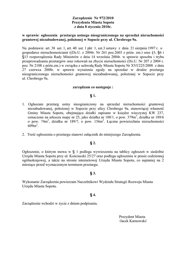 Zarządzenie Nr 972/2010 Prezydenta Miasta Sopotu z dnia 8 stycznia 2010r. w sprawie: ogłoszenia przetargu ustnego nieograniczonego na sprzedaŜ nieruchomości gruntowej niezabudowanej, połoŜonej w Sopocie przy ul. Chrobrego 9a. Na podstawie art. 38 ust. 1, art. 40 ust. 1 pkt 1, ust.3 ustawy z dnia 21 sierpnia 1997 r. o gospodarce nieruchomościami ((Dz.U. z 2004r. Nr 261 poz.2603 z późn. zm.) oraz §3, §6 i §13 rozporządzenia Rady Ministrów z dnia 14 września 2004r. w sprawie sposobu i trybu przeprowadzania przetargów oraz rokowań na zbycie nieruchomości (Dz.U. Nr 207 z 2004 r. poz. Nr 2108 z późn.zm.) w związku z uchwałą Rady Miasta Sopotu Nr XVI/225/2008 z dnia 27 czerwca 2008r. w sprawie wyraŜenia zgody na sprzedaŜ w drodze przetargu nieograniczonego nieruchomości gruntowej niezabudowanej, połoŜonej w Sopocie przy ul. Chrobrego 9a. zarządzam co następuje : § 1. 1. Ogłaszam przetarg ustny nieograniczony na sprzedaŜ nieruchomości gruntowej niezabudowanej, połoŜonej w Sopocie przy ulicy Chrobrego 9a, stanowiącej własność Gminy Miasta Sopotu, obejmująca działki zapisane w księdze wieczystej KW 237, oznaczone na arkuszu mapy nr 25, jako działka nr 188/1, o pow. 379m2, działka nr 189/6 o pow. 74m2, działka nr 189/7, o pow. 156m2. Łączna powierzchnia nieruchomości 609m2. 2. Treść ogłoszenia o przetargu stanowi załącznik do niniejszego Zarządzenia. § 2. Ogłoszenie, o którym mowa w § 1 podlega wywieszeniu na tablicy ogłoszeń w siedzibie Urzędu Miasta Sopotu przy ul. Kościuszki 25/27 oraz podlega ogłoszeniu w prasie codziennej ogólnokrajowej, a takŜe na stronie internetowej Urzędu Miasta Sopotu, co najmniej na 2 miesiące przed wyznaczonym terminem przetargu. § 3. Wykonanie Zarządzenia powierzam Naczelnikowi Wydziału Strategii Rozwoju Miasta Urzędu Miasta Sopotu. § 4. Zarządzenie wchodzi w Ŝycie z dniem podpisania. Prezydent Miasta /Jacek Karnowski/ Załącznik do Zarządzenia nr 972/2010 Prezydenta Miasta Sopotu z dnia 8 stycznia 2010 Prezydent Miasta Sopotu 81-704 Sopot, ul. Kościuszki 25/27, fax 551-01-33 ogłasza przetarg ustny nieograniczony na sprzedaŜ nieruchomości gruntowej niezabudowanej, stanowiącej własność Gminy Miasta Sopotu (strona internetowa www.sopot.pl) 1. Lokalizacja: Sopot, ul. Chrobrego 9a 2. Oznaczenie nieruchomości wg danych z ewidencji gruntów: Nieruchomość gruntowa stanowiąca własność Gminy Miasta Sopotu, obejmująca działki zapisane w księdze wieczystej KW 237, oznaczone na arkuszu mapy nr 25, jako działka nr 188/1, o pow. 379m2, działka nr 189/6 o pow. 74m2, działka nr 189/7, o pow. 156m2. Łączna powierzchnia nieruchomości 609m2. 3. Opis nieruchomości: Nieruchomość atrakcyjnie połoŜona w bliskości pasa nadmorskiego plaŜy i ulicy Boh. Monte Cassino – centrum miasta. Usytuowanie działek w drugiej linii zabudowy ulicy Chrobrego, w sąsiedztwie budynki mieszkalne wielorodzinne. Teren płaski, dobrze skomunikowany. 4 ObciąŜenia nieruchomości i inne zobowiązania: nieruchomość wolna jest od obciąŜeń i innych zobowiązań. 5. Przeznaczenie nieruchomości i sposób jej zagospodarowania: Nieruchomość w miejscowym planie zagospodarowania przestrzennego miasta (Uchwała Rady Miasta Sopotu Nr XII/178/2000 z dnia 21 stycznia 2000r.) znajduje się na terenie wydzielonym oznaczonym numerem 01 M, przeznaczonym na funkcję mieszkaniową z dopuszczeniem usług nieuciąŜliwych (do 20% powierzchni uŜytkowej budynku). Warunki gestorów sieci – do wglądu w Wydziale Strategii Rozwoju Miasta UM Sopot (pok.69), są obowiązujące dla inwestora. Konieczność wykonania inwentaryzacji zieleni i uzgodnienia z Wydziałem InŜynierii i Ochrony Środowiska tut. Urzędu wycinki drzew i krzewów. Istniejące warunki nie zwalniają inwestora z obowiązku wystąpienia do gestorów sieci z wnioskiem o wydanie szczegółowych warunków technicznych podłączenia nieruchomości do infrastruktury podziemnej. 6. Cena wywoławcza nieruchomości: 2.000.000,-zł (słownie: dwa miliony złotych) plus podatek VAT w wysokości 22% od wylicytowanej w przetargu wartość nieruchomości. Wylicytowana cena sprzedaŜy nieruchomości winna wpłynąć na konto Urzędu Miasta Sopotu nr 79116022020000000061948141, najpóźniej do dnia podpisania umowy sprzedaŜy. W dniu podpisywania umowy w formie aktu notarialnego, cała wymagana naleŜność musi znajdować się na w/w koncie. 8. Termin i miejsce przetargu: 15 marca 2010r. godz. 12ºº sala nr 39 Urzędu Miasta Sopotu. 9. Wysokość, forma, termin i miejsce wniesienia wadium: Wadium w kwocie 100.000,-zł (słownie: sto pięćdziesiąt tysięcy złotych) naleŜy wpłacić przelewem na konto Urzędu Miasta Sopotu nr 93116022020000000061948083. Wadium musi znaleźć się na podanym koncie najpóźniej w dniu 10.03.2010r. 10. Skutki uchylenia się od zawarcia umowy sprzedaŜy: Wadium ulegnie przepadkowi jeŜeli uczestnik przetargu uchyli się od zawarcia umowy sprzedaŜy w formie aktu notarialnego w wyznaczonym czasie i miejscu. 11. Warunki dodatkowe: Uczestnicy przetargu winni posiadać dowód osobisty, dowód wpłaty wadium, wpis do ewidencji działalności gospodarczej lub odpis z KRS i zgodę organów statutowych na nabycie nieruchomości. Pozostałe informacje w Wydziale Strategii Rozwoju Miasta – pok.69, tel. (058) 521-37-99.