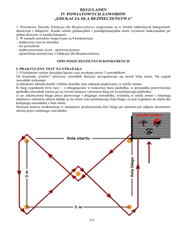 REGULAMIN IV POWIATOWYCH ZAWODÓW „EDUKACJA DLA BEZPIECZEŃSTWA” 1. Powiatowe Zawody Edukacja dla Bezpieczeństwa rozgrywane są w dwóch oddzielnych kategoriach: dziewcząt i chłopców. KaŜda szkoła gimnazjalna i ponadgimnazjalna moŜe wystawić maksymalnie po jednej druŜynie w kaŜdej kategorii. 2. W ramach zawodów rozgrywane są 4 konkurencje: - praktyczny test na straŜaka; - tor przeszkód; - podtrzymywanie Ŝycia – pierwsza pomoc; - sprawdzian teoretyczny z Edukacji dla Bezpieczeństwa. OPIS POSZCZEGÓLNYCH KONKURENCJI I. PRAKTYCZNY TEST NA STRAśAKA 1. O kolejności miejsc decyduje łączny czas uzyskany przez 3 zawodników. Na komendę „Gotów” pierwszy zawodnik druŜyny przygotowuje się przed linią startu. Na sygnał zawodnik wykonuje: a) alarmowe ubranie kurtki i hełmu straŜaka oraz zabranie prądownicy w strefie zmian; b) bieg zygzakiem (trzy razy – z obiegnięciem w końcowej fazie pachołka; w przypadku przewrócenia pachołka zawodnik stawia go na swoim miejscu i powtarza bieg od wcześniejszego pachołka; c) po zakończeniu biegu przez pierwszego i drugiego zawodnika, wchodzą w strefę zmian i zdejmują alarmowo elementy ubioru kładąc je na ziemi oraz przekraczają linię biegu, co jest sygnałem do startu dla kolejnego zawodnika z linii startu; DruŜyna kończy konkurencję w momencie przekroczenia linii biegu po alarmowym zdjęciu elementów ubioru przez ostatniego zawodnika. 1/4 II. TOR PRZESZKÓD 1. O kolejności miejsc decyduje łączny czas uzyskany przez 3 zawodników. Na komendę „Gotów” pierwszy zawodnik druŜyny przyjmuje na materacu przed drabinkami pozycję leŜącą tyłem (stopy zaczepione o dolny szczebel), wyprostowanymi ramionami trzyma piłkę lekarską (2 kg) leŜącą za głową. Na sygnał zawodnik wykonuje: a) 5 skłonów (dziewczęta 3 skłony) w przód z dotknięciem piłką dolnego szczebla drabinki i 5 powrotów do pozycji wyjściowej (dziewczęta 3 powroty) (rys. a); b) bieg zygzakiem (jeden raz – z obiegnięciem w końcowej fazie chorągiewki A (rys. b). W przypadku przewrócenia chorągiewki zawodnik stawia ją na swoim miejscu i powtarza bieg od wcześniejszej chorągiewki; c) zamianę dwóch piłek lekarskich (chłopcy – 5kg, dziewczęta – 3kg) w strefie 10 metrów (chwyt piłki leŜącej 1 metr od materaca), przeniesienie jej do drugiej - leŜącej 10 m dalej, zamiana piłek i odniesienie piłki drugiej na miejsce piłki pierwszej (rys. c); d) skok tygrysi przez piłkę lekarską ułoŜoną na materacu (miejsce odbicia przed materacem - rys. d); e) przejście po odwróconej ławeczce gimnastycznej, której minimalna długość wynosi 3 m, z zejściem za ławeczką stopy zawodnika muszą mieć przynajmniej dwa kontakty z ławeczką, początek i koniec wejścia i zejścia wyznaczają linie (rys. e); f) pokonanie 3 płotków rozstawionych co 1,5 mb: pod poprzeczką => nad poprzeczką => - pod poprzeczką (rys. f). g) naprzemianstronne przeskoki obunóŜ wzdłuŜ ławeczki bez piłki (minimum trzy przeskoki), (rys. g); h) obiegnięcie chorągiewki (rys. h), powrót najkrótszą drogą na linię startu i dotknięcie kolejnego zawodnika druŜyny, będącego w gotowości do rozpoczęcia ćwiczenia „a”, który bez dodatkowych komend je rozpoczyna. DruŜyna kończy bieg w momencie powrotu na linię startu ostatniego zawodnika. Uwaga Test prowadzi się w linii prostej lub po obwodzie sali. W trakcie pokonywania testu zawodnicy na uwagę sędziego powtarzają dany element, aŜ do poprawnego wykonania. III. „PODTRZYMYWANIE śYCIA – PIERWSZA POMOC” 1. KaŜda druŜyna ma do wykonania 3 zadania: • zadanie I - określenie stanu świadomości (na pozorancie); • zadanie II - resuscytacja krąŜeniowo – oddechowa na fantomie: masaŜ serca i wentylacja metodą usta – usta; • zadanie III - ułoŜenie poszkodowanego w pozycji bezpiecznej (bocznej ustalonej), utrzymanie temperatury ciała i udzielenie wsparcia psychicznego; 2. Zawodnicy przed komisją losują zadania do wykonania i wykonują je w kolejności jw. 2/4 3. Zadania punktowane są w przedziale - pierwsze 0÷5 pkt, drugie 0÷20 pkt, trzecie 0÷10 pkt wg poniŜszych zasad: Zadanie I L.p. Zakres czynności 1. . Bezpieczeństwo własne i poszkodowanego Sprawdzenie reakcji poszkodowanego (kontakt słowny oraz 2. potrząśnięcie za ramiona) 3. Stwierdzenie braku przytomności u osoby poszkodowanej. Razem Punktacja 2 delikatne 2 1 5 Zadanie II L.p. Zakres czynności Punktacja 1. . Bezpieczeństwo własne i poszkodowanego 2 Sprawdzenie reakcji poszkodowanego 2 2. (kontakt słowny oraz delikatne potrząśnięcie za ramiona) 3. Wezwanie pomocy lub wskazanie osoby do pomocy 1 4. UdroŜnienie dróg oddechowych 1 5. Kontrola oddechu za pomocą trzech zmysłów przez czas 10 sekund. 3 Wezwanie pomocy osobiście (miejsce zdarzenia, co się stało i ilość osób poszkodowanych, przedstawić się oraz podać numer telefonu z którego się 6. 5 dzwoni, jaka pomoc zostanie udzielona. Kolejność elementów w meldunku dowolna) Wykonanie 30 skutecznych uciśnięć klatki piersiowej (postawa. wyprostowane 7. 4 ramiona, tempo oraz głębokość uciśnięć ) 8. Dwa skuteczne wdmuchnięcia 2 Razem 20 Zadanie III L.p. 1. 2 3. 4 5 6 7. Zakres czynności Punktacja Sprawdzenie bezpieczeństwa poszkodowanego ( okulary, kieszenie) 2 UłoŜenie bliŜszej reki pod kątem prostym w stosunku do ciała a następnie 1 zgięcie w łokciu pod kątem prostym, tak aby dłoń reki była skierowana do góry. PrzełoŜenie dalszej ręki w poprzek klatki piersiowej i przytrzymanie stroną 1 grzbietową przy bliŜszym policzku. Przytrzymując dłoń dociśniętą do policzka, złapanie za dalszą kończynę dolną 2 powyŜej kolana, podciągnięcie jej ku górze a następnie odwrócenie poszkodowanego tak aby staw biodrowy i kolano były zgięte pod kątem prostym. Wsparcie psychiczne 1 UdroŜnienie dróg oddechowych, regularne sprawdzenie oddechu 2 Komfort termiczny 1 Razem 10 5. Ocena dru