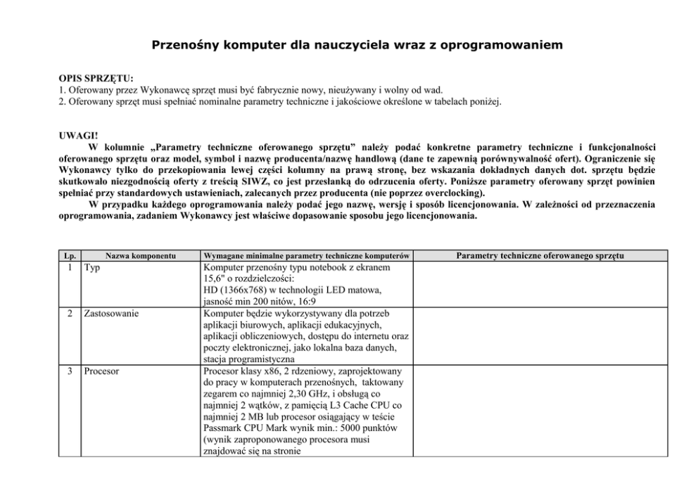 Przenośny komputer dla nauczyciela wraz z oprogramowaniem OPIS SPRZĘTU: 1. Oferowany przez Wykonawcę sprzęt musi być fabrycznie nowy, nieużywany i wolny od wad. 2. Oferowany sprzęt musi spełniać nominalne parametry techniczne i jakościowe określone w tabelach poniżej. UWAGI! W kolumnie „Parametry techniczne oferowanego sprzętu” należy podać konkretne parametry techniczne i funkcjonalności oferowanego sprzętu oraz model, symbol i nazwę producenta/nazwę handlową (dane te zapewnią porównywalność ofert). Ograniczenie się Wykonawcy tylko do przekopiowania lewej części kolumny na prawą stronę, bez wskazania dokładnych danych dot. sprzętu będzie skutkowało niezgodnością oferty z treścią SIWZ, co jest przesłanką do odrzucenia oferty. Poniższe parametry oferowany sprzęt powinien spełniać przy standardowych ustawieniach, zalecanych przez producenta (nie poprzez overclocking). W przypadku każdego oprogramowania należy podać jego nazwę, wersję i sposób licencjonowania. W zależności od przeznaczenia oprogramowania, zadaniem Wykonawcy jest właściwe dopasowanie sposobu jego licencjonowania. Lp. Nazwa komponentu 1 Typ 2 Zastosowanie 3 Procesor Wymagane minimalne parametry techniczne komputerów Komputer przenośny typu notebook z ekranem 15,6" o rozdzielczości: HD (1366x768) w technologii LED matowa, jasność min 200 nitów, 16:9 Komputer będzie wykorzystywany dla potrzeb aplikacji biurowych, aplikacji edukacyjnych, aplikacji obliczeniowych, dostępu do internetu oraz poczty elektronicznej, jako lokalna baza danych, stacja programistyczna Procesor klasy x86, 2 rdzeniowy, zaprojektowany do pracy w komputerach przenośnych, taktowany zegarem co najmniej 2,30 GHz, i obsługą co najmniej 2 wątków, z pamięcią L3 Cache CPU co najmniej 2 MB lub procesor osiągający w teście Passmark CPU Mark wynik min.: 5000 punktów (wynik zaproponowanego procesora musi znajdować się na stronie Parametry techniczne oferowanego sprzętu http://www.cpubenchmark.net ) – wydruk ze strony należy dołączyć do oferty. zawiadomienia od zamawiającego. 4 Pamięć operacyjna RAM 4GB DDR3 1600, możliwość rozbudowy do min 8GB 5 Parametry pamięci masowej Min. 500 GB SATA, 5400 obr./min. 6 Karta graficzna Zintegrowana w procesorze z możliwością dynamicznego przydzielenia pamięci systemowej, ze sprzętowym wsparciem dla DirectX 10.1, Shader 4.1 7 Wyposażenie Karta dźwiękowa zgodna z HD, wbudowane multimedialne głośniki stereo Wbudowana w obudowę matrycy kamera VGA HD720p wraz z mikrofonem 8 Wymagania dotyczące 6-cell, Li-Ion. baterii i zasilania Zasilacz o mocy min. 65W 9 system operacyjny Windows 7 lub równoważny 10 Certyfikaty i standardy Certyfikat ISO9001:2000 dla producenta sprzętu (należy załączyć do oferty) Certyfikat ISO 14001 dla producenta sprzętu (należy załączyć do oferty) Potwierdzenie spełnienia kryteriów środowiskowych, w tym zgodności z dyrektywą RoHS Unii Europejskiej o eliminacji substancji niebezpiecznych w postaci oświadczenia producenta jednostki. Deklaracja zgodności CE (załączyć do oferty) Potwierdzenie spełnienia kryteriów środowiskowych, w tym zgodności z dyrektywą RoHS Unii Europejskiej o eliminacji substancji niebezpiecznych w postaci oświadczenia producenta jednostki Oferowany model notebooka musi posiadać certyfikat Microsoft, potwierdzający poprawną współpracę oferowanego modelu notebooka z ww. Systemem operacyjnym (załączyć wydruk ze strony Microsoft WHCL) 11 Bezpieczeństwo 12 Warunki gwarancji 13 Wymagania dodatkowe Złącze typu Kensington Lock Gwarancja producenta 36 miesięcy. Firma serwisująca musi posiadać ISO 9001:2000 na świadczenie usług serwisowych oraz posiadać autoryzacje producenta komputera – dokumenty potwierdzające załączyć do oferty. Oświadczenie producenta komputera, że w przypadku nie wywiązywania się z obowiązków gwarancyjnych oferenta lub firmy serwisującej, przejmie na siebie wszelkie zobowiązania związane z serwisem. Wbudowane porty i złącza: 1. 1 x VGA, Min 2 x USB 2.0, Min 2 x USB 3.0, RJ-45, 1 x złącze słuchawkowe stereo/liniowe wyjście , 1 x złącze mikrofonowe, Czytnik kart multimedialnych SD/MMC, Wbudowana kamera w obudowę ekranu komputera i mikrofon, Bluetooth 4.0 Czytnik Linii Papilarnych Karta sieciowa LAN 10/100/1000, Ethernet RJ 45 zintegrowana z płytą główną, WLAN 802.11b/g/n, Zintegrowany z płytą główną z dedykowanym przełącznikiem do uruchamiania modułu WLAN. Klawiatura (układ US -QWERTY), Touchpad. Napęd optyczny 24x DVD +/- RW. Dołączone oprogramowanie do nagrywania i odtwarzania. Możliwość telefonicznego sprawdzenia konfiguracji sprzętowej komputera oraz warunków gwarancji po podaniu numeru seryjnego bezpośrednio u producenta lub jego przedstawiciela. Specyfikacja techniczna – Oprogramowanie Lp. 1. Rodzaj System operacyjny Opis Zainstalowany System operacyjny klasy PC musi spełniać następujące wymagania, poprzez wbudowane mechanizmy, bez użycia dodatkowych aplikacji: 1. Możliwość dokonywania aktualizacji i poprawek systemu przez Internet z możliwością wyboru instalowanych poprawek. 2. Możliwość dokonywania uaktualnień sterowników urządzeń przez Internet. 3. Darmowe aktualizacje w ramach wersji systemu operacyjnego przez Internet (niezbędne aktualizacje, poprawki, biuletyny bezpieczeństwa muszą być dostarczane bez dodatkowych opłat) – wymagane podanie nazwy strony serwera WWW. 4. Internetowa aktualizacja zapewniona w języku polskim. 5. Wbudowana zapora internetowa (firewall) dla ochrony połączeń internetowych; zintegrowana z systemem konsola do zarządzania ustawieniami zapory i regułami IP v4 i v6. 6. Zlokalizowane w języku polskim, co najmniej następujące elementy: menu, odtwarzacz multimediów, pomoc, komunikaty systemowe. 7. Wsparcie dla większości powszechnie używanych urządzeń peryferyjnych (drukarek, urządzeń Parametry techniczne oferowanego oprogra