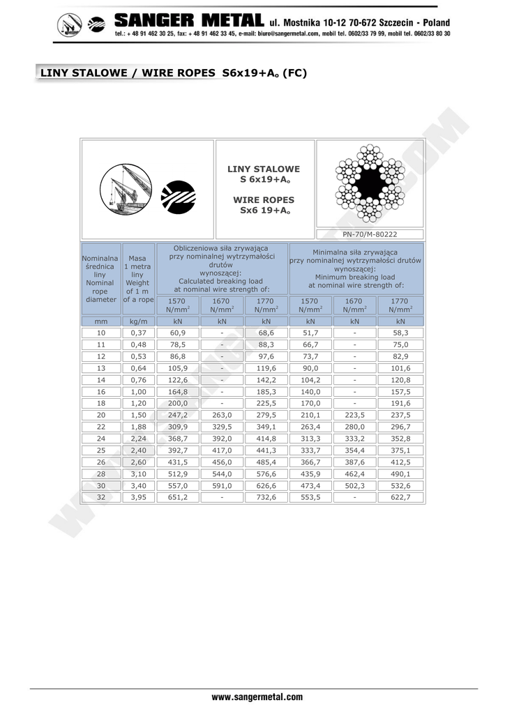 LINY STALOWE / WIRE ROPES S6x19+Ao (FC) LINY STALOWE S 6x19+Ao WIRE ROPES Sx6 19+Ao PN-70/M-80222 Nominalna Masa średnica 1 metra liny liny Nominal Weight rope of 1 m diameter of a rope Obliczeniowa siła zrywająca przy nominalnej wytrzymałości drutów wynoszącej: Calculated breaking load at nominal wire strength of: 1570 N/mm2 1670 N/mm2 1770 N/mm2 Minimalna siła zrywająca przy nominalnej wytrzymałości drutów wynoszącej: Minimum breaking load at nominal wire strength of: 1570 N/mm2 1670 N/mm2 1770 N/mm2 mm kg/m kN kN kN kN kN kN 10 0,37 60,9 - 68,6 51,7 - 58,3 11 0,48 78,5 - 88,3 66,7 - 75,0 12 0,53 86,8 - 97,6 73,7 - 82,9 13 0,64 105,9 - 119,6 90,0 - 101,6 14 0,76 122,6 - 142,2 104,2 - 120,8 16 1,00 164,8 - 185,3 140,0 - 157,5 18 1,20 200,0 - 225,5 170,0 - 191,6 20 1,50 247,2 263,0 279,5 210,1 223,5 237,5 22 1,88 309,9 329,5 349,1 263,4 280,0 296,7 24 2,24 368,7 392,0 414,8 313,3 333,2 352,8 25 2,40 392,7 417,0 441,3 333,7 354,4 375,1 26 2,60 431,5 456,0 485,4 366,7 387,6 412,5 28 3,10 512,9 544,0 576,6 435,9 462,4 490,1 30 3,40 557,0 591,0 626,6 473,4 502,3 532,6 32 3,95 651,2 - 732,6 553,5 - 622,7