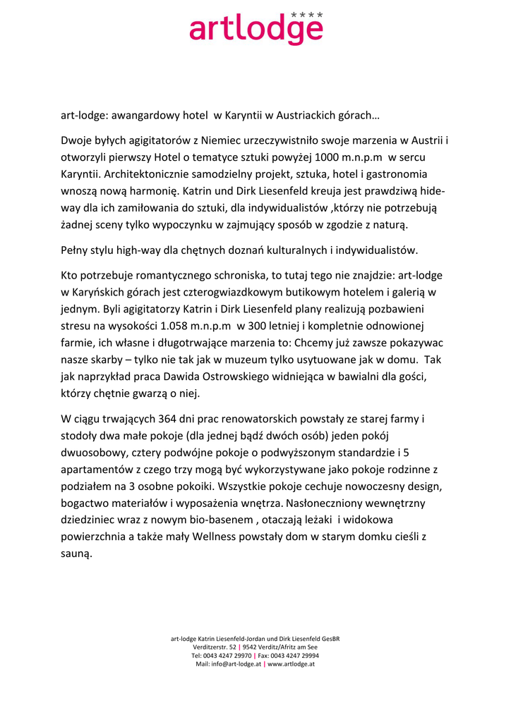 art‐lodge: awangardowy hotel w Karyntii w Austriackich górach… Dwoje byłych agigitatorów z Niemiec urzeczywistniło swoje marzenia w Austrii i otworzyli pierwszy Hotel o tematyce sztuki powyżej 1000 m.n.p.m w sercu Karyntii. Architektonicznie samodzielny projekt, sztuka, hotel i gastronomia wnoszą nową harmonię. Katrin und Dirk Liesenfeld kreuja jest prawdziwą hide‐ way dla ich zamiłowania do sztuki, dla indywidualistów ,którzy nie potrzebują żadnej sceny tylko wypoczynku w zajmujący sposób w zgodzie z naturą. Pełny stylu high‐way dla chętnych doznań kulturalnych i indywidualistów. Kto potrzebuje romantycznego schroniska, to tutaj tego nie znajdzie: art‐lodge w Karyńskich górach jest czterogwiazdkowym butikowym hotelem i galerią w jednym. Byli agigitatorzy Katrin i Dirk Liesenfeld plany realizują pozbawieni stresu na wysokości 1.058 m.n.p.m w 300 letniej i kompletnie odnowionej farmie, ich własne i długotrwające marzenia to: Chcemy już zawsze pokazywac nasze skarby – tylko nie tak jak w muzeum tylko usytuowane jak w domu. Tak jak naprzykład praca Dawida Ostrowskiego widniejąca w bawialni dla gości, którzy chętnie gwarzą o niej. W ciągu trwających 364 dni prac renowatorskich powstały ze starej farmy i stodoły dwa małe pokoje (dla jednej bądź dwóch osób) jeden pokój dwuosobowy, cztery podwójne pokoje o podwyższonym standardzie i 5 apartamentów z czego trzy mogą być wykorzystywane jako pokoje rodzinne z podziałem na 3 osobne pokoiki. Wszystkie pokoje cechuje nowoczesny design, bogactwo materiałów i wyposażenia wnętrza. Nasłoneczniony wewnętrzny dziedziniec wraz z nowym bio‐basenem , otaczają leżaki i widokowa powierzchnia a także mały Wellness powstały dom w starym domku cieśli z sauną. art‐lodge Katrin Liesenfeld‐Jordan und Dirk Liesenfeld GesBR Verditzerstr. 52 | 9542 Verditz/Afritz am See Tel: 0043 4247 29970 | Fax: 0043 4247 29994 Mail: info@art‐lodge.at | www.artlodge.at Zamierzenie budowlane podtrzymywało całą gminę w napięciu, głównie przez bezpośrednie działanie :"to rzemieślnicy uważali nas czasami za szalonych”, ‐ przypomina sobie Kati. "Pomieszczenia posiadają harmoniczny, tradycyjny wygląd zachowano także proporcje. Nagle wszystko pasowało do siebie, co chcieliśmy tutaj zbierać: tradycyjna architektura i modny design, dziewicza przyroda i dobre jedzenie, nasza sztuka i nasi goście. Poza gośćmi, którzy szukają tutaj nowych impulsów, trafiają przyjaciele lub Ci co chcą się powolutku rozluźnić , przychodzą też nawet artyści . Już w trakcie swoich czasów w Dusseldorfie Liesenfeldowie intensywne poszukiwali kontaktów i pielęgnowali tamtejszą sztukę‐ ich zbiórka prac wykonywanych przez studenta, absolwenta i naturalnie też prace różnych artystów zabrali ze sobą Karyntii. Zbiory rosną ciągle i są uzupełniane z biegiem czasu poprzez prace tworzone bardziej na płaszczyźnie międzynarodowej i w szczególności poprzez austriackich artystów. "Chcieliśmy zobaczyć zewnątrz, jak sztuka działa w czasie urlopu na człowieka i co on sam o tym myśli., Dirk opisuje wspólny sen jako social‐kulturalny eksperyment: sztuka‐akcja i muzycznie organizowane wczasy umieją gości zainteresować i na własnej skórze otoczyć się sztuką i artystami , choćby przy" gotowaniu nietuzinkowych potraw”. Naturalnie miło jest patrzeć że nasi goście całkowicie są nieraz pochłonięci sztuką lub poprzez pobyt u nas zaczynają się na nią otwierać Powitanie na troche innych wczasach To że człowiek w tej atmosferze jako gość traktowany jest nieco inaczej mieszkaniec wielkiego miasta czy mniejszej miejscowości już po przybyciu. Zamiast biurokratyczny procederów dostaje małą przydomową prowadnicę formie książeczki i wyjaśnienie gościnnych lodówek, z które człowiek może darmowo cały czas korzystać. W pomieszczeniach znajdują się również ponadto nespresso‐maszyna, czajniki elektryczne, koszyczek herbaciany i coś do podjadania. art‐lodge Katrin Liesenfeld‐Jordan und Dirk Liesenfeld GesBR Verditzerstr. 52 | 9542 Verditz/Afritz am See Tel: 0043 4247 29970 | Fax: 0043 4247 29994 Mail: info@art‐lodge.at | www.artlodge.at Zaraz po przybyciu znikają wszystkie stresy dnia poprzedniego. Panująca harmonia i spokój w art‐lodge pomogą cieszyć się upragnionym wypoczynkiem. Goście śpią pomiędzy drewnianymi podporami, rustykalnymi ścianami z kamienia, noweczesnymi meblami, płaski ‐TV i sztuka. Każdy pokój urządzony jest w innym stylu. Prysznice rzucają się w oczy do stylu retro pomarańcza 1970 do stylowej czerni. Lodówki wyposażone są w wodę, piwo i winem do samoobsługi. Codziennie Dirk gotuje swoim gościom do 13 h, z śniadaniem a la carte, w 4 wieczory w tygodniu serwuje poza tym Slowfood. Potem człowiek spotyka się w bawialni przy doskonałym domowym winie na pogawędki. Tak rozluźniacie się swojsko.[Pokój dwuosobowy od 65 EUR/osoba/noc] Pobrac zdjecie: http://www.art‐lodge.com/index.php?sec=pr_press_service_images&lang=en art‐lodge Katrin Liesenfeld‐Jordan und Dirk Liesenfeld GesBR Verditzerstr. 52 | 9542 Verditz/Afritz am See Tel: 0043 4247 29970 | Fax: 0043 4247 29994 Mail: info@art‐lodge.at | www.artlodge.at