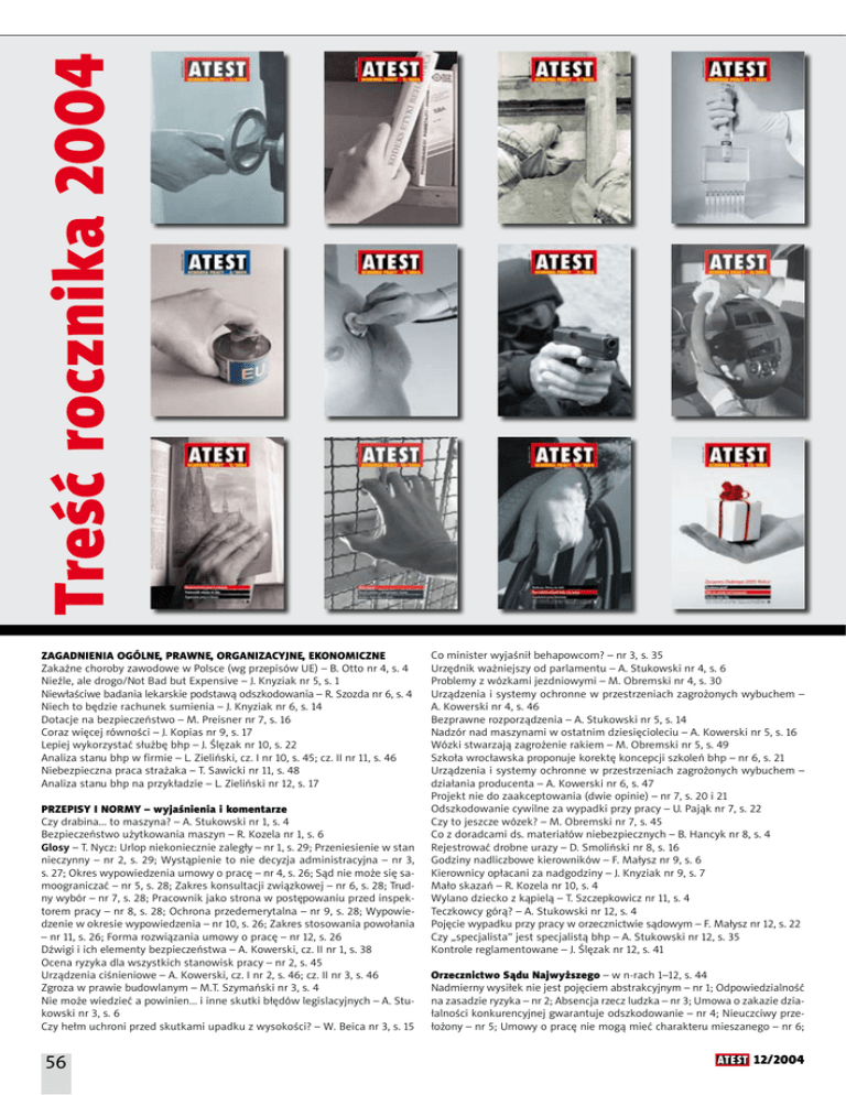 Treść rocznika 2004 ZAGADNIENIA OGÓLNE, PRAWNE, ORGANIZACYJNE, EKONOMICZNE Zakaźne choroby zawodowe w Polsce (wg przepisów UE) – B. Otto nr 4, s. 4 Nieźle, ale drogo/Not Bad but Expensive – J. Knyziak nr 5, s. 1 Niewłaściwe badania lekarskie podstawą odszkodowania – R. Szozda nr 6, s. 4 Niech to będzie rachunek sumienia – J. Knyziak nr 6, s. 14 Dotacje na bezpieczeństwo – M. Preisner nr 7, s. 16 Coraz więcej równości – J. Kopias nr 9, s. 17 Lepiej wykorzystać służbę bhp – J. Ślęzak nr 10, s. 22 Analiza stanu bhp w firmie – L. Zieliński, cz. I nr 10, s. 45; cz. II nr 11, s. 46 Niebezpieczna praca strażaka – T. Sawicki nr 11, s. 48 Analiza stanu bhp na przykładzie – L. Zieliński nr 12, s. 17 PRZEPISY I NORMY – wyjaśnienia i komentarze Czy drabina... to maszyna? – A. Stukowski nr 1, s. 4 Bezpieczeństwo użytkowania maszyn – R. Kozela nr 1, s. 6 Glosy – T. Nycz: Urlop niekoniecznie zaległy – nr 1, s. 29; Przeniesienie w stan nieczynny – nr 2, s. 29; Wystąpienie to nie decyzja administracyjna – nr 3, s. 27; Okres wypowiedzenia umowy o pracę – nr 4, s. 26; Sąd nie może się samoograniczać – nr 5, s. 28; Zakres konsultacji związkowej – nr 6, s. 28; Trudny wybór – nr 7, s. 28; Pracownik jako strona w postępowaniu przed inspektorem pracy – nr 8, s. 28; Ochrona przedemerytalna – nr 9, s. 28; Wypowiedzenie w okresie wypowiedzenia – nr 10, s. 26; Zakres stosowania powołania – nr 11, s. 26; Forma rozwiązania umowy o pracę – nr 12, s. 26 Dźwigi i ich elementy bezpieczeństwa – A. Kowerski, cz. II nr 1, s. 38 Ocena ryzyka dla wszystkich stanowisk pracy – nr 2, s. 45 Urządzenia ciśnieniowe – A. Kowerski, cz. I nr 2, s. 46; cz. II nr 3, s. 46 Zgroza w prawie budowlanym – M.T. Szymański nr 3, s. 4 Nie może wiedzieć a powinien... i inne skutki błędów legislacyjnych – A. Stukowski nr 3, s. 6 Czy hełm uchroni przed skutkami upadku z wysokości? – W. Beica nr 3, s. 15 56 Co minister wyjaśnił behapowcom? – nr 3, s. 35 Urzędnik ważniejszy od parlamentu – A. Stukowski nr 4, s. 6 Problemy z wózkami jezdniowymi – M. Obremski nr 4, s. 30 Urządzenia i systemy ochronne w przestrzeniach zagrożonych wybuchem – A. Kowerski nr 4, s. 46 Bezprawne rozporządzenia – A. Stukowski nr 5, s. 14 Nadzór nad maszynami w ostatnim dziesięcioleciu – A. Kowerski nr 5, s. 16 Wózki stwarzają zagrożenie rakiem – M. Obremski nr 5, s. 49 Szkoła wrocławska proponuje korektę koncepcji szkoleń bhp – nr 6, s. 21 Urządzenia i systemy ochronne w przestrzeniach zagrożonych wybuchem – działania producenta – A. Kowerski nr 6, s. 47 Projekt nie do zaakceptowania (dwie opinie) – nr 7, s. 20 i 21 Odszkodowanie cywilne za wypadki przy pracy – U. Pająk nr 7, s. 22 Czy to jeszcze wózek? – M. Obremski nr 7, s. 45 Co z doradcami ds. materiałów niebezpiecznych – B. Hancyk nr 8, s. 4 Rejestrować drobne urazy – D. Smoliński nr 8, s. 16 Godziny nadliczbowe kierowników – F. Małysz nr 9, s. 6 Kierownicy opłacani za nadgodziny – J. Knyziak nr 9, s. 7 Mało skazań – R. Kozela nr 10, s. 4 Wylano dziecko z kąpielą – T. Szczepkowicz nr 11, s. 4 Teczkowcy górą? – A. Stukowski nr 12, s. 4 Pojęcie wypadku przy pracy w orzecznictwie sądowym – F. Małysz nr 12, s. 22 Czy „specjalista” jest specjalistą bhp – A. Stukowski nr 12, s. 35 Kontrole reglamentowane – J. Ślęzak nr 12, s. 41 Orzecznictwo Sądu Najwyższego – w n-rach 1–12, s. 44 Nadmierny wysiłek nie jest pojęciem abstrakcyjnym – nr 1; Odpowiedzialność na zasadzie ryzyka – nr 2; Absencja rzecz ludzka – nr 3; Umowa o zakazie działalności konkurencyjnej gwarantuje odszkodowanie – nr 4; Nieuczciwy przełożony – nr 5; Umowy o pracę nie mogą mieć charakteru mieszanego – nr 6; 12/2004 Świadczenia według układu zbiorowego pracy – nr 7; Aktualność orzeczenia lekarskiego – nr 8; Kiedy pracownik musi poddać się kontrolnemu badaniu lekarskiemu – nr 9; Kontrowersje wokół wykładni art. 2416 § 1 k.p. rozstrzygnięte – nr 10; Każdy wypadek wymaga wszechstronnej oceny – nr 11; Składając wypowiedzenie nie wiedziała, że jest w ciąży... – nr 12 nania tabletek; Uchwyt do ręcznego przenoszenia opakowań; Sposób wytwarzania żaluzji przestrzennej – nr 10; Lodochron; Podpórka pod kończynę dolną; Urządzenie świetlne do ostrzegania samolotów – nr 11; Gwóźdź dwustronny; Sposób mocowania narzędzi na trzonku, zwłaszcza siekiery; Urządzenie do bezpiecznego ładowania, rozładowania i przestrzeliwania broni – nr 12 Odpowiedzi redakcji – w każdym n-rze str. 32 Kiedy 100% zasiłek chorobowy? – nr 1; Wstrzymany urlop; Środowisko pracy; Instrukcja bezpieczeństwa pożarowego – nr 2; Ocenie i pomiarom podlegają warunki środowiska pracy; Składki na ubezpieczenie społeczne – nr 3; Gdzie można znaleźć wykaz stanowisk pracy w warunkach szkodliwych; To tylko eksperyment; Pod szczególną ochroną – nr 4; Nie ma powodu do paniki; Co z zasiłkiem wychowawczym – nr 5; Zleceniobiorcy też szkoleni i badani; Słaby wzrok i praca na wysokości – nr 6; Mycie okien – nr 7; Świadczenie przedemerytalne; Choroba zawodowa, a niezdolność do pracy – nr 8; Okulary do pracy przy komputerze; Mierniki bezpośredniego odczytu – nr 9; Prawo do bezpiecznych warunków pracy – nr 10; Urządzenia do piaskowania; Służba bhp; Dyplom wystarczy – nr 11; Dofinansowanie do zakupu okularów; Kwalifikacje wykładowców – nr 12 TECHNOLOGIę I BEZPIECZEŃSTWO Ocena ryzyka zawodowego – I. Romanowska-Słomka w n-rach 1–12, s. 42: nauczyciela wychowania fizycznego – nr 1; dekarza blacharza – nr 2; palacza w kotłowni opalanej gazem – nr 3; sprzątacza ulicznego – nr 4; szwaczki – nr 5; sprzątaczki – nr 6; archiwisty – nr 7; przedstawiciela handlowego – nr 8; stolarza – nr 9; operatora elektrodrążarki – nr 10; opertora belownicy – nr 11; mechanika urz