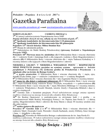 Prószków – Przysiecz k w i e c i e ń 2017 r. Gazetka Parafialna www.parafia-proszkow.pl, e-mail: [email protected] SOBOTA 01.04.2017. I SOBOTA MIESIĄCA 700 W intencji zadośćuczynienia Niepokalanemu Sercu NMP. Dzisiaj odwiedzin chorych nie ma, odbędą się one 8 kwietnia od godz. 800. 1000 Spotkanie kandydatów do bierzmowania klas I i II gimnazjum 1030 Spotkanie kandydatów do bierzmowania klas III gimnazjum Prószków 1300 chrzest dziecka: Miłosz Damian Kuc 1700 Okazja do sakramentu pokuty. 1730 Nabożeństwo do Matki Boskiej Prószkowskiej (śpiewamy Godzinki o Niepokalanym Poczęciu NMP). Prószków 1800 Pierwsza msza św. niedzielna: (I) O Miłosierdzie Boże i wieczne zbawienie dla ++ rodziców Eryki i Antoniego Król, a dla żyjących z rodziny o Boże błogosławieństwo i zdrowie (II) O Miłosierdzie Boże i wieczne zbawienie dla + męża Tadeusza Kołodziej w 3 rocznicę śmierci a dla żyjących o Boże błogosławieństwo i zdrowie _______________________________________________________________________________________________________________________________________________________ NIEDZIELA 2.04.2017. V NIEDZIELA WIELKIEGO POSTU - ROZPOCZĘCIE MISJI ŚWIĘTYCH (kolekta specjalna na wymianę systemu ogrzewania w kościele parafialnym w Prószkowie) (Tu serdeczna prośba do Prószkowian i Przysieczan - o składanie ofiar na kwiaty do Bożego Grobu!). 700 w języku niemieckim: O Miłosierdzie Boże i wieczne zbawienie dla + męża, ojca, dziadka Eryka Dobis, jego ++ rodziców i rodzeństwo oraz ++ z rodziny Burghardt 945 O Miłosierdzie Boże i wieczne zbawienie dla + taty Zygmunta Mazur w rocznicę śmierci 1115 msza św. dla dzieci z rodzicami (zbiorowa): (I) O Miłosierdzie Boże i życie wieczne dla + męża Gerharda Knop, rodziców Knop i Przybyła, wszystkich ++ z pokrewieństwa (II) O Miłosierdzie Boże i życie wieczne dla + męża Mirosława Bilskiego w I rocznicę śmierci, ++ rodziców Władysława i Rozalii Mendyk, teściów Józefy i Franciszka Bilskich i dusz w czyśćcu cierpiących 1530 Gorzkie Żale z kazaniem pasyjnym. Przed nabożeństwem nastąpi zmiana tajemnic modlitwy różańcowej na miesiąc kwiecień dla członków Róży Różańcowej. 1600 Do Boskiej Opatrzności w podziękowaniu za otrzymane łaski i z prośbą – za wstawiennictwem Matki Boskiej Nieustającej Pomocy i św. Papieża Jana Pawła II – o dalszą opiekę, błogosławieństwo Boże i zdrowie dla Ireny Baron z okazji 30 rocznicy urodzin oraz dla całej rodziny 1700 nauka stanowa dla mężczyzn Przysiecz 800 Gorzkie Żale a o 830 O Miłosierdzie Boże i wieczne zbawienie dla ++ rodziców Marii i Konrada Czech, Weroniki i Józefa Suchanek, siostry Elżbiety, braci Jerzego i Jana, ++ dziadków z obu stron Przysiecz 1400 Koronka do Miłosierdzia Bożego z nabożeństwem do św. Jana Pawła II i modlitwą o uzdrowienie. W trakcie nabożeństwa nastąpi zmiana tajemnic modlitwy różańcowej na miesiąc kwiecień dla członków Róży Różańcowej. _______________________________________________________________________________________________________________________________________________________ Misje Święte - 2017 1 Misjonarz: o. Alan Brzyski OFM, Prowincjał Śląskiej Prowincji Franciszkanów św. Jadwigi we Wrocławiu Misje św. w Prószkowie: od niedzieli 2 IV do czwartku 6 IV 2017 r. Niedziela (2 kwietnia) Rozpoczęcie misji św. podczas wszystkich mszy św., z sobotnią mszą wieczorną włącznie Niedziela 1700 – nauka stanowa dla mężczyzn. Poniedziałek (3 kwietnia) 800 i 1800 – msza św. z nauką ogólną. 1900 – nauka stanowa dla kobiet. Wtorek (4 kwietnia) 800 i 1800 – msza św. z nauką ogólną. 1900 – nauka stanowa dla młodzieży. Środa (5 kwietnia) 800 i 1800 – msza św. z nauką ogólną. 2000 Apel Maryjny Czwartek (6 kwietnia) 800 – msza św. dla chorych i seniorów z udzieleniem Sakramentu Namaszczenia Chorych (z nauką ogólną), zakończenie misji św. w Prószkowie. 1430 – spotkanie z chorymi w Domu Pomocy Społecznej w Prószkowie (spowiedź św., udzielenie Sakramentu Namaszczenia Chorych i Komunii św. chorym). 1800 msza św. z nauką ogólną, zakończenie misji św. w Prószkowie. Misje św. w Przysieczy: od piątku 7 IV do soboty 8 IV Niedziela (2 kwietnia) Początek misji św. podczas mszy św. Piątek (7 kwietnia) 800 i 1830 – msza św. z nauką ogólną (o godz. 1730 Droga Krzyżowa) 1900 – nauka stanowa dla małżeństw Sobota (8 kwietnia) 800 – msza św. dla chorych i seniorów z udzieleniem Sakramentu Namaszczenia Chorych (z nauką ogólną), zakończenie misji św. w Przysieczy. 1700 – msza św. z nauką ogólną, zakończenie misji św. w Przysieczy. Zakończenie misji św. w całej parafii Niedziela (9 kwietnia) I w Prószkowie i Przysieczy podczas wszystkich mszy św. zakończenie misji św. - kolekta na potrzeby Zakonu Franciszkanów Prószków 1500 – Gorzkie Żale z kazaniem pasyjnym na zakończenie misji św. 2 Okazja do spowiedzi św. w czasie misji św. Podczas misji św. – pół godziny przed każdą mszą świętą, a w sobotę 8 kwietnia od godz. 1600 w Przysieczy i od godz. 1700 w Prószkowie. Misje szkolne dla uczniów szkoły podstawowej: od poniedziałku do środy (3-5 kwietnia) – godz.: 1030–1115 Spowiedź św. dla uczniów szkoły podstawowej – w ramach nauki misyjnej w środę 5 kwietnia. W związku z tym klasy: I, II i III nie przychodzą w środę do kościoła. dla uczniów gimnazjum: od poniedziałku do środy (3-5 kwietnia) – godz.: 930–1015 Spowiedź św. dla uczniów gimnazjum – w ramach nauki misyjnej w środę 5 kwietnia. dla uczniów Pomologii: we czwartek (6 kwietnia) – godz.: 925–1130 **** Misyjne i przedświąteczne odwiedziny chorych w sobotę (8 kwietnia) od godz. 800. Chorych prosimy zgłosić w zakrystii lub w kancelarii parafialnej. Prosimy też zgłaszać chorych do przyjęcia Komunii św. w same Święta Wielkanocne bądź w jakąkolwiek niedzielę. Wtedy Cia