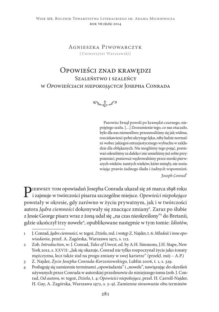 Wiek XIX . Rocznik Towarzystwa Literackiego im. Adama Mickiewicza rok VIi (XLix) 2014 Agnieszka Piwowarczyk (Uniwersy tet Warszawski) Opowieści znad krawędzi Szaleństwo i szaleńcy w Opowieściach niepokojących Josepha Conrada Parowiec brnął powoli po krawędzi czarnego, niepojętego szału. […] Zrozumienie tego, co nas otaczało, było dla nas niemożliwe; przesuwaliśmy się jak widma, rozciekawieni i pełni ukrytego lęku, niby ludzie normalni wobec jakiegoś entuzjastycznego wybuchu w zakładzie dla obłąkanych. Nie mogliśmy tego pojąć, ponieważ odeszliśmy za daleko i nie umieliśmy już sobie przypomnieć; ponieważ wędrowaliśmy przez mroki pierwszych wieków, tamtych wieków, które minęły, nie zostawiając prawie żadnego śladu i żadnych wspomnień. Joseph Conrad 1 P ierwszy tom opowiadań Josepha Conrada ukazał się 26 marca 1898 roku i zajmuje w twórczości pisarza szczególne miejsce. Opowieści niepokojące powstały w okresie, gdy zarówno w życiu prywatnym, jak i w twórczości autora Jądra ciemności dokonywały się znaczące zmiany2. Zaraz po ślubie z Jessie George pisarz wraz z żoną udał się „na czas nieokreślony”3 do Bretanii, gdzie ukończył trzy nowele4, opublikowane następnie w tym tomie: Idiotów, J. Conrad, Jądro ciemności, w: tegoż, Dzieła, red. i wstęp Z. Najder, t. 6: Młodość i inne opowiadania, przeł. A. Zagórska, Warszawa 1972, s. 112. 2Zob. Introduction, w: J. Conrad, Tales of Unrest, ed. by A.H. Simmons, J.H. Stape, New York 2012, s. XXVII : „Jak się okazuje, Conrad nie tylko rozpoczynał życie jako żonaty mężczyzna, lecz także stał na progu zmiany w swej karierze” (przekł. mój – A.P.) 3 Z. Najder, Życie Josepha Conrada-Korzeniowskiego, Lublin 2006, t. 1, s. 329. 4 Posługuję się zamiennie terminami „opowiadania” i „nowele”, nawiązując do określeń używanych przez Conrada w autorskiej przedmowie do niniejszego tomu (zob. J. Conrad, Od autora, w: tegoż, Dzieła, t. 4: Opowieści niepokojące, przeł. H. Carroll-Najder, H. Gay, A. Zagórska, Warszawa 1972, s. 5–9). Zamienne stosowanie obu terminów 1 281 • Agnieszka Piwowarczyk • Placówkę postępu oraz Lagunę. Pozostałe opowiadania – Karain. Wspomnienie oraz Powrót – pisarz stworzył już po powrocie do Anglii. W tym samym okresie powstał również Murzyn z załogi „Narcyza” (ukończony w Anglii, ale rozpoczęty jeszcze w czasie pobytu we Francji) – utwór planowany jako część tomu, który rozrósł się do rozmiarów powieści i został wydany osobno w roku 1897, a do którego Conrad dołączył Przedmowę. Stanowiła ona jego pierwszą wypowiedź programową, zawierającą, jak pisze Zdzisław Najder, „przekonania dotyczące ludzkiej solidarności i obowiązków sztuki” 5 oraz program artystyczny, „zwykle określany mianem literackiego impresjonizmu”6, a „[…] w istocie bliższy symbolizmowi niż impresjonizmowi w malarstwie”7. Jednocześnie pisarz podejmował desperackie próby ukończenia Wybawcy, jednak pisanie tej powieści było dla niego istną torturą i zbiegało się z pogłębiającym się epizodem depresyjnym8 oraz ze stałymi problemami finansowymi (wydanie opowiadań miało im zresztą w pewnym stopniu zaradzić). Opowiadania zebrane w tomie Opowieści niepokojące stały się dla Conrada swoistym laboratorium zarówno tematów i motywów, jak i technik pisarskich. Wydarzenia przedstawione w tych utworach rozgrywają się w różnorodnych przestrzeniach, mają zróżnicowaną dynamikę i różny czas trwania, ponadto opisywane są przy użyciu rozmaitych technik narracyjnych, a ich problematyka również wydaje się niezwykle rozległa. Conrad sięga po narrację pierwszoosobową, wprowadzając charakterystyczną formę opowieści szkatułkowej, a także po różne formy narracji trzecioosobowej, w jej wariancie auktorialnym i personalnym, nie stroniąc przy tym od ironii. Różnorodność narracyjnych technik wiąże się ze sformułowanymi w Przedmowie do Murzyna z załogi „Narcyza” deklaracjami co do celów pisarza, który stwierdzał: „[…] moim zadaniem, które usiłuję wykonać, jest sprawić za pomocą pisanego słowa, byście usłyszeli, byście poczuli – a nade wszystko, byście z o b a c z y l i. To – i nic więcej; a w tym jest wszystko”9. Zadanie twórcy 5 6 7 8 9 w drugiej połowie XIX wieku wynikało z „pomieszania gatunkowo-terminologicznego”, które „[…] utrwalone za twórczością pisarzy przez słowniki i encyklopedie, było udziałem także wypowiedzi krytyczno-teoretycznych” (M. Marcjan, Nowela, w: Słownik literatury polskiej XIX wieku, pod red. J. Bachórza i A. Kowalczykowej, Wrocław 2009, s. 615). Z. Najder, dz. cyt., s. 358. Tamże, s. 359. Tamże, s. 360. Świadczą o tym wypowiedzi Conrada, który np. w liście do Edwarda Garnetta z 2 czerwca 1896 roku pisał: „Miewam długie napady przygnębienia, które w szpitalu dla nerwowo chorych określono by jako obłęd. Nie wiem, co to jest” (cyt. za: jw., s. 334). J. Conrad, Przedmowa, w: tegoż, Dzieła, t. 3: Murzyn z załogi „Narcyza”. Opowieść morska, przeł. B. Zieliński, Warszawa 1972, s. 12. 282 • Opowieści znad krawędzi. Szaleństwo i szaleńcy… • […] polega na ukazaniu bez wahań, bez wyboru i obaw owego ocalonego fragmentu wszystkim oczom w świetle szczerości. Należy pokazać jego drganie, barwę i kształt a poprzez jego ruch, formę i kolor odsłonić treść jego prawdy – ujawnić zapładniającą tajemnicę, napięcie i pasję ukryte w jądrze każdego przekonującego momentu.10 Niezależnie jednak od wybranej formuły proza Conrada ukazuje rzeczywistość z określonej, wybranej przez autora perspektywy, zmuszając niejako czytelnika do jej przyjęcia. Twórczość ta, jak zauważył Ian Watt, „[…] budzi w czytelniku poczucie stałego nacisku ze strony narracji, zmuszającego do patrzenia na daną sytuację z określonego punktu widzenia”11,