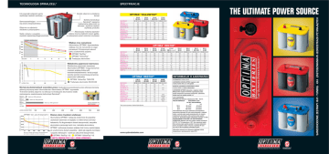 SPECYFIKACJE Lite wypraski połączeń ogniw wydłużają trwałość użytkową Zaciski odporne na działanie korozji Solidna konstrukcja Spiralcell®zapewnia maksymalną odporność na wibracje i wydłuża trwałość użytkową produktu Samouszczelniające się zawory bezpieczeństwa Odporna na uderzenia obudowa z polipropylenu Absorpcyjny matowy separator szklany trzyma elektrolit niczym gąbka, co zabezpiecza przed rozlaniem się kwasu Siatki z ołowiu o wysokiej czystości zapewniają długą żywotność THE ULTIMATE POWER SOURCE OPTIMA®YELLOWTOP® YT S 5,5 (BCI D31A) Bestell-Nummer Länge: mm Gesamtlänge: mm Höhe ohne Pole mm Höhe inkl. Pole: mm Breite: mm Gesamtbreite: mm Nennspannung: V Kaltstartstrom: (EN) Kapazität: (EN) Ah Reservekapazität: (BCI) Min Gewicht: kg YT S 4,2 (BCI D34) YT U 4,2 (BCI D34/78) YT R 3,7 (BCI D35) 851 187 000 888 2 812 254 000 888 2 814 254 000 888 2 840 222 000 888 2 317 325 218 238 158 165 12 975 75 155 26,5 245 254 173 200 172 175 12 765 55 120 19,5 245 254 173 200 172 175 12 765 55 120 19,9 229 237 168 197 172 171 12 660 48 98 16,6 STREFA ROZRUCHU Większa moc rozruchowa 1100 Akumulatory OPTIMA®doprowadzają większą moc do rozrusznika w ciągu pierwszych 10 krytycznych sekund cyklu uruchamiania pojazdu. OPTIMA®RedTop® OPTIMA®YellowTop® Tradycyjny akumulator PRĄD - AMPERY 1200 1000 900 800 700 600 5 POJEMNOŚĆ REZERWOWA (amperogodziny) SEKUNDY 10 15 20 25 30 100 Wielokrotna pojemność rezerwowa 90 Wielokrotna pojemność rezerwowa Akumulatory OPTIMA®mogą wytrzymać znacząco większą liczbę cykli ładowania/wyładowania i wciąż przyjąć wysoką wartość procentową pierwotnej pojemności całkowitej. 80 70 60 50 40 30 20 ® RT C 4,2 (BCI 34C) Bestell-Nummer Länge: mm Gesamtlänge: mm Höhe ohne Pole: mm Höhe inkl. Pole: mm Breite: mm Gesamtbreite: mm Nennspannung: V Kaltstartstrom: (EN) Kapazität: (EN) Ah Reservekapazität: (BCI) Min Gewicht: kg 0 100 LICZBA CYKLI 200 300 400 główną przyczyną awarii akumulatorów. Akumulatory OPTIMA®są przeszło 15-krotnie bardziej odporne na wibracje niż tradycyjne akumulatory dzięki zastosowaniu opatentowanej technologii Spiralcell®. Marka A kwasowo-ołowiowe, grupa 31 Marka B kwasowo-ołowiowe, grupa 31 Awaria po 300 godzinach Awaria po 300 godzinach Marka C Bestell-Nummer Länge: mm Gesamtlänge: mm Höhe ohne Pole: mm Höhe inkl. Pole: mm Breite: mm Gesamtbreite: mm Nennspannung: V Kaltstartstrom: (EN) Kapazität: (EN) Ah Reservekapazität: (BCI) Min Gewicht: kg LICZBA GODZIN PRÓB 1000 2000 3000 OPTIMA®4,2 L przy 25 stopniach C 13,50 4000 5000 6000 7000 229 237 168 197 229 237 168 197 255 252 206 185 172 175 12 815 50 110 17,2 172 175 12 815 50 110 17,2 172 175 12 815 50 110 17,2 172 175 12 815 50 110 17,6 172 175 12 815 50 110 17,6 172 171 12 730 44 90 14,4 172 171 12 730 44 90 14,4 172 171 12 730 44 90 15 83 90 6 815 50 110 8,3 Dni 200 400 600 800 1000 Dane dot. nowego akumulatora. Samowyładowanie jest niższe w przypadku produktu używanego. 317 325 218 238 158 165 12 975 75 155 26,5 8000 Dłuższy okres trwałości użytkowej do uruchomienia dużych pojazdów - takich jak ciągniki, kombajny i pojazdy rekreacyjne - nawet po całej zimie bezczynności. OPTIMA®RedTop®4.2 OPTIMA®YellowTop®4.2 !!!BITTE DIESEN TEXT UM 1 ZEILE KÜRZEN!!! BT DC 4,2 (BCI D34M) BT SLI 4,2 (BCI 34M) INFORMACJE O ŁADOWANIU BLUETOP TROLLFURY® ® 852 188 000 888 2 816 253 000 888 2 806 252 000 888 2 988 112 000 888 2 OPTIMA®zachowują znacząco większą ilość mocy, wystarczającą 11,00 RT S 2,1 (6 VOLT) 229 237 168 197 akumulatory zaczynają tracić moc. Jednakże akumulatory 11,50 RT U 3,7 (BCI 75/25) 245 254 173 200 ładowania. Po długotrwałym okresie bezczynności, wszystkie 12,00 RT R 3,7 (BCI 35) 245 254 173 200 używanych sezonowo ze względu na niskie tempo samowy- 12,50 RT S 3,7 (BCI 25) 255 254 173 200 Akumulatory OPTIMA®nadają się znakomicie do pojazdów 13,00 RT V 4,2 (BCI 34 TOPLIWOŚĆ) 245 254 173 200 Twój autoryzowany dealer/dystrybutor OPTIMA® RT U 4,2 (BCI 34/78) 245 254 184 200 WCIĄŻ SPRAWNE PO 8000 GODZIN! Awaria po 1950 godzinach kwasowo-ołowiowe, grupa 31 RT R 4,2 (BCI 34R) 801 287 000 888 2 802 250 000 888 2 803 251 000 888 2 804 250 000 888 2 808 250 000 888 2 820 255 000 888 2 835 255 000 888 2 822 255 000 888 2 810 355 000 888 2 BT DC 5,5 (BCI D31M) Tradycyjny akumulator 98 Ah/C20 RT S 4,2 (BCI 34) OPTIMA®REDTOP® ® OPTIMA YellowTop 75Ah/C20 10 Nie bój się ekstremalnych warunków pracy! Uszkodzenia powodowane przez wibracje stanowią OCV ( NAPIĘCIE OBWODU OTWARTEGO) OPTIMA®REDTOP® www.optimabatteries.com 245 254 173 200 172 175 12 765 55 120 19,7 245 254 173 200 172 175 12 815 50 110 17,4 581 213 213 12/24 1530/765 110/55 240/120 40,8 ALTERNATOR 13,8 do 15,0 V ŁADOWARKA AKUMULATORA (napięcie stałe) 13,8 do 15,0 V, 10 A, ok. 12-15 godzin NAPIĘCIE ŁADOWANIA KONSERWACYJNEGO 13,2 do 13,8 V, 1 A (prąd maksymalny) ŁADOWANIE SZYBKIE (ładowarka o napięciu stałym) Maksymalne napięcie 15,6 V. Bez ograniczenia prądu, dopóki temperatura pozostaje poniżej 50°C. Ładowanie, dopóki prąd nie spadnie poniżej 1 A. CZAS ŁADOWANIA (Przykład przy założeniu wyładowania 100% - 10,5 V) PRĄD W AMPERACH SZACOWANY CZAS DO 90% NAŁADOWANIA 4,2 5,5 100 A 35 minut 52 minut 50 A 75 minut 112 minut 25 A 140 minut 210 minut Czas ładowania różni się w zależności od temperatury i parametrów ładowarki. W razie użycia ładowarki o napięciu stałym, wartość prądu opada proporcjonalnie do stopnia naładowania akumulatora. Gdy wartość prądu spadnie poniżej 1 A, akumulator będzie naładowany niemalże w 100%. ZASTOSOWANIE CYKLICZNE LUB ZASTOSOWANIA SZEREGOWE Napięcie stałe przy stałym prądzie kończącym (CC/CV): 14,7 V, temperatura < 50°C, bez ograniczeń prądu. Gdy wartość prądu spadnie poniżej 1 A, proces ładowania kończy się prądem stałym 3 A przez 1 godzinę dla typu 5,5 oraz 2 A dla wszystkich pozostałych typów. (Wszystki