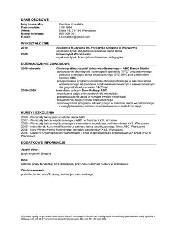 DANE OSOBOWE Imię i nazwisko: Data urodzin: Adres: Numer telefonu: E-mail: Karolina Kowalska 1.08.1986 Stara 15, 01-186 Warszawa 600-000-001 [email protected] WYKSZTAŁCENIE 2010 2008 Akademia Muzyczna im. Fryderyka Chopina w Warszawie uzyskanie tytułu magistra na kierunku teoria tańca Uniwersytet Warszawski uzyskanie tytułu licencjata na kierunku pedagogika DOŚWIADCZENIE ZAWODOWE 2008–obecnie 2006–2009 Choreograf/nauczyciel tańca współczesnego – ABC Dance Studio opracowanie choreografii i scenografii spektaklu "XYZ" prezentowanego podczas przeglądu tańca współczesnego XYZ 2010 pod patronatem fundacji ABC przygotowanie programu materiału choreograficznego w zakresie tańca współczesnego na poziomie średniozaawansowanym i zaawansowanym dla grup młodzieŜy w wieku 14-20 lat Instruktor tańca – Dom Kultury ABC organizacja zajęć animacyjnych dla młodzieŜy przeprowadzenie zajęć w ramach swoich kwalifikacji prowadzenie zajęć z tańca współczesnego opracowywanie programu edukacyjnego w zakresie tańca współczesnego z uwzględnieniem poziomu zaawansowania uczestników zajęć KURSY I SZKOLENIA 2008 - Warsztaty funky jazz w szkole tańca ABC 2007 - Warsztaty tańca współczesnego z ABC w Teatrze XYZl, Wrocław 2006 - Warsztaty tańca współczesnego z elementami repertuaru pod kierunkiem XYZ, Warszawa 2005 - Instruktorski kurs kwalifikacyjny z zakresu tańca współczesnego, firma ABC, Warszawa 2005 - Kurs Wychowawcy Kolonijnego, ośrodek szkoleniowy XYZ, Warszawa 2005 - Udział w Ogólnopolskich Warsztatach Tańca Współczesnego organizowanych przez XYZ w Warszawie DODATKOWE INFORMACJE Języki obce: język angielski (biegły) Inne: członek grupy tanecznej XYZ działającej przy ABC Centrum Kultury w Warszawie Zainteresowania: podróŜe, taniec współczesny, animacja czasu wolnego WyraŜam zgodę na przetwarzanie moich danych osobowych dla potrzeb niezbędnych do realizacji procesu rekrutacji zgodnie z Ustawą z dn. 29.08.97 o Ochronie Danych Osobowych, Dz. Ust. Nr 133 poz. 883.