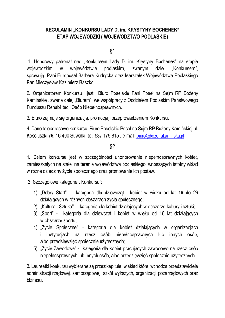 REGULAMIN „KONKURSU LADY D. im. KRYSTYNY BOCHENEK” ETAP WOJEWÓDZKI ( WOJEWÓDZTWO PODLASKIE) §1 1. Honorowy patronat nad „Konkursem Lady D. im. Krystyny Bochenek” na etapie wojewódzkim w województwie podlaskim, zwanym dalej „Konkursem”, sprawują Pani Europoseł Barbara Kudrycka oraz Marszałek Województwa Podlaskiego Pan Mieczysław Kazimierz Baszko. 2. Organizatorem Konkursu jest Biuro Poselskie Pani Poseł na Sejm RP Bożeny Kamińskiej, zwane dalej „Biurem”, we współpracy z Oddziałem Podlaskim Państwowego Funduszu Rehabilitacji Osób Niepełnosprawnych. 3. Biuro zajmuje się organizacją, promocją i przeprowadzeniem Konkursu. 4. Dane teleadresowe konkursu: Biuro Poselskie Poseł na Sejm RP Bożeny Kamińskiej ul. Kościuszki 76, 16-400 Suwałki, tel. 537 179 815 , e-mail: [email protected] §2 1. Celem konkursu jest w szczególności uhonorowanie niepełnosprawnych kobiet, zamieszkałych na stałe na terenie województwa podlaskiego, wnoszących istotny wkład w różne dziedziny życia społecznego oraz promowanie ich postaw. 2. Szczegółowe kategorie „ Konkursu”: 1) „Dobry Start” - kategoria dla dziewcząt i kobiet w wieku od lat 16 do 26 działających w różnych obszarach życia społecznego; 2) „Kultura i Sztuka” - kategoria dla kobiet działających w obszarze kultury i sztuki; 3) „Sport” - kategoria dla dziewcząt i kobiet w wieku od 16 lat działających w obszarze sportu; 4) „Życie Społeczne” - kategoria dla kobiet działających w organizacjach i instytucjach na rzecz osób niepełnosprawnych lub innych osób, albo przedsięwzięć społecznie użytecznych; 5) „Życie Zawodowe” - kategoria dla kobiet pracujących zawodowo na rzecz osób niepełnosprawnych lub innych osób, albo przedsięwzięć społecznie użytecznych. 3. Laureatki konkursu wybierane są przez kapitułę, w skład której wchodzą przedstawiciele administracji rządowej, samorządowej, szkół wyższych, organizacji pozarządowych oraz biznesu. 4. W każdej kategorii wybierane jest jedna laureatka. Laureatka przechodzi do kolejnego etapu konkursu na szczeblu krajowym. 5. Kapituła może podjąć decyzję o wyróżnieniu kandydatki/ek ze względu na specjalne osiągnięcia. Wyróżniona laureatka przechodzi do kolejnego etapu konkursu na szczeblu krajowym. 6. Laureatki otrzymują dyplomy pamiątkowe oraz nagrody, w przypadku ich pozyskania przez organizatora konkursu. §3 1. W skład kapituły wchodzi co najmniej 5 osób. Kapituła zatwierdzana jest przez organizatora Konkursu do dnia 22 maja 2015r. 2. Podanie do wiadomości publicznej składu kapituły nastąpi niezwłocznie po jej powołaniu. §4 1. Uroczyste rozpoczęcie konkursu wyznacza się na dzień 4 maja 2015r. 2. Zgłoszenie kandydatki do konkursu powinno nastąpić na druku stanowiącym załącznik nr 1 do niniejszego Regulaminu. Zgłoszenia kandydatek przyjmowane są w siedzibie Biura, o którym mowa w §1 ust. 4, do dnia 26 czerwca 2015r. W przypadku zgłoszeń przesyłanych drogą pocztową liczy się data stempla pocztowego. Do konkursu nie mogą być ponownie zgłoszone Panie, które otrzymały wcześniej statuetkę Lady D. 3. Do zgłoszenia mogą zostać dołączone wyłącznie zdjęcia kandydatki zapisane na płycie cd, w ilości nie więcej niż 2 szt. ( parametry zdjęcia: wymiary nie mniej niż 1000x700 pikseli, pojemność zdjęcia nie więcej niż do 2MB, format zdjęcia – jpg). Nie jest możliwe dołączanie innych załączników oprócz załącznika, o którym mowa w §4 ust.5. 4. Kandydatka musi mieć ukończone 18 r.ż. oraz posiadać pełną zdolność do czynności prawnych, z wyjątkiem kandydatek, o których mowa w §2 ust. 2 pkt 1 i 3. 5. Do zgłoszenia, o którym mowa w ust. 1 należy dołączyć zgodę kandydatki lub opiekuna ustawowego/prawnego na udział w Konkursie na druku stanowiącym załącznik nr 2 do niniejszego Regulaminu. §5 1. Kapituła dokonuje wyboru laureatek do dnia 26 czerwca 2015r. Wybór następuje większością głosów. 2. Kapitule przysługuje prawo przesunięcia zgłoszenia kandydatki do innej kategorii konkursu niż kategoria zaproponowana przez podmiot zgłaszający. 3. Kapituła niezwłocznie informuje Biuro Konkursu o wyborze laureatek. §6 Podmiotami uprawnionymi do zgłoszenia kandydatek są: 1) 2) 3) 4) 5) 6) 7) jednostki administracji rządowej; jednostki administracji samorządowej; organizacje pozarządowe, media; osoby fizyczne; placówki edukacyjne; przedsiębiorcy. §7 1. Dyplomy oraz nagrody, o których mowa w §2 ust. 5 wręczane są podczas uroczystej gali Konkursu. 2. O dokładnym terminie i miejscu gali Konkursu, kandydatki informowane są z co najmniej 5- dniowym wyprzedzeniem. §8 Organizator konkursu nie bierze odpowiedzialności za spory wynikłe wskutek działania osób trzecich. Załącznik nr 1 do Regulaminu „KONKURSU LADY D. im. KRYSTYNY BOCHENEK” etap wojewódzki – województwo podlaskie FORMULARZ ZGŁOSZENIOWY KANDYDATKI do „KONKURSU LADY D. im. KRYSTYNY BOCHENEK” Proponowana kategoria wyróżnienia: Imię i nazwisko kandydatki: Data urodzenia kandydatki: Dokładny adres: Dane do kontaktu z kandydatką (numer telefonu i adres e-mailowy): Stopień niepełnosprawności /orzeczenie o niepełnosprawności, okres na jaki orzeczenie zostało wydane: Przyczyna niepełnosprawności: Charakterystyka kandydatki (informacje o wykształceniu, pracy, prowadzonej działalności): Otrzymane przez kandydatkę wyróżnienia, nagrody, dyplomy, podziękowania: Uzasadnienie zgłoszenia: Dane podmiotu zgłaszającego (nazwa, dane teleadresowe) wraz ze wskazaniem osób uprawnionych do reprezentowania podmiotu: Załącznik nr 2 do Regulaminu „KONKURSU LADY D. im. KRYSTYNY BOCHENEK” etap wojewódzki – województwo podlaskie ZGODA KANDYDATKI/ OPIEKUNA USTAWOWEGO/ OPIEKUNA PRAWNEGO* NA UDZIAŁ W „KONKURSIE LADY D. im. KRYSTYNY BOCHENEK” Imię i nazwisko kandydatki, dane teleadresowe kandydatki: Niniejszym wyrażam zgodę n
