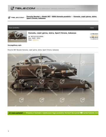 Porsche Boxster > Model 987 / 809A Konsola przednia / / Konsola, część górna, skóra, Sport Chrono, kakaowa Dane produktu Cena Konsola, część górna, skóra, Sport Chrono, kakaowa Nr: 987552101249V6 Rok: 2005 - 2012 Stan: używany 2.780,30 € rabat 50% 1.390,16 € 1.130,21 € Szczegółowy opis Porsche 987 Boxster Konsola, część górna, skóra, Sport Chrono, kakaowa masz pytanie? 1 Prosimy o kontakt z opiekunem tego produktu: Norbert Buczyński [email protected]