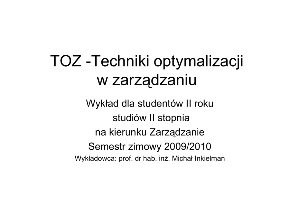 TOZ -Techniki optymalizacji w zarządzaniu Wykład dla studentów II roku studiów II stopnia na kierunku Zarządzanie Semestr zimowy 2009/2010 Wykładowca: prof. dr hab. inż. Michał Inkielman Literatura • Literatura podstawowa: 1. Sikora W.(red.): Badania operacyjne, PWE, 2008. 2. Jędrzejczyk Z. i inni: Badania operacyjne w przykładach i zadaniach, PWN, 2006. Literatura uzupełniająca: Gutenbaum J., Inkielman M.i inni: Symulacyjny model gospodarki Polski. Gutenbaum J., Inkielman M. (ed.), IBS PAN, seria: Badania systemowe, t. 20, Warszawa, 1998. Gutenbaum J., Inkielman M.: Wyznaczanie decyzji w zadaniach wielokryterialnych metodą cząstkowych zbiorów efektywnych, Automatyka, t.3, zeszyt 1, Kraków, 1999. Gutenbaum J., Inkielman M.: Specyfika modelowania makroekonomicznego uwzględniająca procesy podejmowania decyzji. Materiały XIV Krajowej Konferencja Automatyki, Zielona Góra, 2002. Warunki zaliczenia kursu TOZ • • • • • Egzamin Kolokwium 1 Kolokwium 2 Projekt Obecność w ćwiczeniach i aktywność 0 – 50 pkt 0 – 10 pkt 0 – 10 pkt 0 – 20 pkt 0 – 10pkt (jedna nieobecność 5 pkt) • Maksymalny wynik 100 pkt • • Do zaliczenia kursu należy uzyskać minimum 50 pkt Do egzaminu może przystąpić student, który z pozostałych elementów zaliczenia uzyska co najmniej 20 pkt. • Oceny: 3 – od 50 do 60 pkt, 3,5 - od 61 do 70 pkt, 4 – od 71 do 80 pkt, 4,5 – od 81 do 90 pkt, 5 – od 91 do 100 pkt Wykład 1 Wprowadzenie Techniki - optymalizacja - zarządzanie • Techniki: zbiór metod matematycznych i algorytmów obliczeniowych, komputery i ich oprogramowanie. • Optymalizacja: określenie zbioru możliwych rozwiązań i znalezienie pośród nich takiego, które jest w określonym sensie najlepsze*. • Zarządzanie: sformułowanie zadania zawierające definicje decyzji możliwych do podjęcia, celów, których realizację mają zapewnić te decyzje i ograniczeń fizycznych, organizacyjnych, prawnych, itp. , które muszą być respektowane * Słowo „najlepsze” jest często w sformułowaniach matematycznych utożsamiane z pojeciami „maksymalne” lub „minimalne”. W tym tkwi trudność: osoba definiująca swoje preferencje, zmuszona do formułowania ich matematycznie, zniekształca te preferencje i czasem dopiero po osiągnięciu celu uświadamia sobie, że nie o to chodziło. Czy jesteś w optimum? q u’ u Optimum jest na lewo q z’’ z’ u’ u A może na prawo? q z’’ z’ u’ u Dwie drogi do celu 1) 2) Poszukiwanie bezpośrednio na rzeczywistym obiekcie. Wykonując kroki próbne sprawdzamy, czy rezultat się poprawił czy pogorszył. Na tej postawie wnioskujemy o kierunku, w którym należy szykać optimum. Warunki: a) dopuszczalne są „rzeczywiste” kroki próbne, b) unimodalna funkcja celu, c) w czasie poszukiwania optimum położenie tego optimum nie ulega istotnym zmianom. Wykorzystanie modelu obiektu do wyznaczenia rozwiązania optymalnego. Do dyspozycji mamy różnorodne i skuteczne* narzędzia matematyczne. Warunki: a) Model musi dostatecznie wierny, b) Matematyczna postać modelu musi uwzgledniać wymagania stawiane przez specyfikę skutecznych* algorytmów obliczeniowych * znaczna część rzeczywistych problemów zarządzania nawet dla współczesnych komputerów stanowi trudny problem obliczeniowy, wymagający bądź istotnych uproszczeń modelu, bądź algorytmów przybliżonych, nie dających gwarancji znalezienia „prawdziwego” optimum. Czy zastosowanie metod optymalizacji w zarządzaniu jest gwarancją sukcesu ? • NIE • Jest kilka powodów: – Wybrane kryterium optymalności nie zawsze sprawdza się w praktyce, – Zastosowany model obiektu albo nigdy nie był poprawny albo przestał być aktualny (także na skutek naszych decyzji), – Wyrafinowane metody uwzględnienia czynników losowych lub niepewnych zawodzą, gdy określoną decyzję podejmujemy jednorazowo bez możliwości powtórzeń, – Koszt poniesiony na wprowadzenie optymalizacji bywa porównywalny z bezpośrednim zyskiem z jej zastosowania. Czy należy więc zrezygnować z optymalizacji ? Nie, ponieważ ... Przedsięwzięcie optymalizacyjne oprócz bezpośredniego pozytywnego wpływu na funkcję celu (często istotnego, mimo zastrzeżeń, o których była mowa) umożliwia: - uporządkowanie wiedzy o zarządzanym obiekcie/procesie pozwalające na wprowadzenie pozytywnych zmian w zarządzaniu, które nie były nawet przewidywane w modelu optymalizacyjnym, - określenie pożądanych modyfikacji samego obiektu zarządzania dzięki poznaniu czynników ograniczajacych skuteczność optymalizacji i decyzji zarządczych, - zapewnienie swoistego „alibi” decydentom* w przypadku niepowodzenia, * Podobnie jak stosowanie obowiązujacych norm, tak również analiza podejmowanych decyzji zgodnie z aktualną wiedzą o metodach ich optymalizacji uwalnia decydenta z osobistej odpowiedzialności za skutki w przypadku nieprzewidzianych okoliczności. W poszukiwaniu najwierniejszego modelu ... Podstawowym wymaganiem jest uwzględnienie w modelu wszystkich istotych zmiennych decyzyjnych i zmiennych zewnętrznych mających wpływ na rozwiązanie. Powoduje to często, że wymiar zadania matematycznego jest bardzo duży. Zależności wiążace zmienne modelu powinny dostatecznie wiernie reprezentować rzeczywiste związki w realnym obiekcie – często stosowana linearyzacja tych zależności bywa zbyt dużym uproszczeniem. Dązenie do ideału w obu tych aspektach powoduje: - wymiar modelu osiagajacy kres możliwości obliczeniowych współczesnych komputerów, złożone zależności funkcyjne z dużą liczbą parametrów wymagajacych kalibracji (identyfikacji) przy deficycie danych do tego niezbędnych rosnące trudności w utrzymaniu aktualności modelu w przypadku zmienności obiektu w czasie. Z tych względów do celów bieżącego podejmowania decyzji stosuje się zwykle modele proste, mało wierne - ale za to „ładne”, natomiast modele rozbudowane (wi