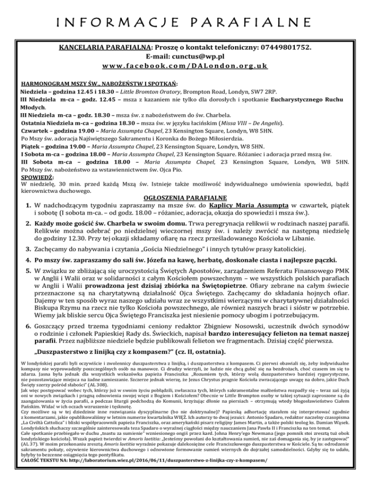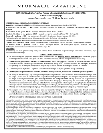 INFORMACJE PARAFIALNE KANCELARIA PARAFIALNA: Proszę o kontakt telefoniczny: 07449801752. E-mail: [email protected] www.facebook.com/DALondon.org.uk HARMONOGRAM MSZY ŚW., NABOŻEŃSTW I SPOTKAŃ: Niedziela – godzina 12.45 i 18.30 – Little Bromton Oratory, Brompton Road, Londyn, SW7 2RP. III Niedziela m-ca – godz. 12.45 – msza z kazaniem nie tylko dla dorosłych i spotkanie Eucharystycznego Ruchu Młodych. III Niedziela m-ca – godz. 18.30 – msza św. z nabożeństwem do św. Charbela. Ostatnia Niedziela m-ca – godzina 18.30 – msza św. w języku łacińskim (Missa VIII – De Angelis). Czwartek – godzina 19.00 – Maria Assumpta Chapel, 23 Kensington Square, Londyn, W8 5HN. Po Mszy św. adoracja Najświętszego Sakramentu i Koronka do Bożego Miłosierdzia. Piątek – godzina 19.00 – Maria Assumpta Chapel, 23 Kensington Square, Londyn, W8 5HN. I Sobota m-ca – godzina 18.00 – Maria Assumpta Chapel, 23 Kensington Square. Różaniec i adoracja przed mszą św. III Sobota m-ca – godzina 18.00 – Maria Assumpta Chapel, 23 Kensington Square, Londyn, W8 5HN. Po Mszy św. nabożeństwo za wstawiennictwem św. Ojca Pio. SPOWIEDŹ: W niedzielę, 30 min. przed każdą Mszą św. Istnieje także możliwość indywidualnego umówienia spowiedzi, bądź kierownictwa duchowego. OGŁOSZENIA PARAFIALNE 1. W nadchodzącym tygodniu zapraszamy na msze św. do Kaplicy Maria Assumpta w czwartek, piątek i sobotę (I sobota m-ca. – od godz. 18.00 – różaniec, adoracja, okazja do spowiedzi i msza św.). 2. Każdy może gościć św. Charbela w swoim domu. Trwa peregrynacja relikwii w rodzinach naszej parafii. Relikwie można odebrać po niedzielnej wieczornej mszy św. i należy zwrócić na następną niedzielę do godziny 12.30. Przy tej okazji składamy ofiarę na rzecz prześladowanego Kościoła w Libanie. 3. Zachęcamy do nabywania i czytania „Gościa Niedzielnego” i innych tytułów prasy katolickiej. 4. Po mszy św. zapraszamy do sali św. Józefa na kawę, herbatę, doskonałe ciasta i najlepsze pączki. 5. W związku ze zbliżającą się uroczystością Świętych Apostołów, zarządzeniem Referatu Finansowego PMK w Anglii i Walii oraz w solidarności z całym Kościołem powszechnym – we wszystkich polskich parafiach w Anglii i Walii prowadzona jest dzisiaj zbiórka na Świętopietrze. Ofiary zebrane na całym świecie przeznaczone są na charytatywną działalność Ojca Świętego. Zachęcamy do składania hojnych ofiar. Dajemy w ten sposób wyraz naszego udziału wraz ze wszystkimi wierzącymi w charytatywnej działalności Biskupa Rzymu na rzecz nie tylko Kościoła powszechnego, ale również naszych braci i sióstr w potrzebie. Wiemy jak bliskie sercu Ojca Świętego Franciszka jest niesienie pomocy ubogim i potrzebującym. 6. Goszczący przed trzema tygodniami ceniony redaktor Zbigniew Nosowski, uczestnik dwóch synodów o rodzinie i członek Papieskiej Rady ds. Świeckich, napisał bardzo interesujący felieton na temat naszej parafii. Przez najbliższe niedziele będzie publikowali felieton we fragmentach. Dzisiaj część pierwsza. „Duszpasterstwo z linijką czy z kompasem?” (cz. II, ostatnia). W londyńskiej parafii byli oczywiście i zwolennicy duszpasterstwa z linijką, i duszpasterstwa z kompasem. Ci pierwsi obawiali się, żeby indywidualne kompasy nie wyprowadziły poszczególnych osób na manowce. Ci drudzy wierzyli, że ludzie nie chcą gubić się na bezdrożach, choć czasem im się to zdarza. Jasna była jednak dla wszystkich wskazówka papieża Franciszka: „Rozumiem tych, którzy wolą duszpasterstwo bardziej rygorystyczne, nie pozostawiające miejsca na żadne zamieszanie. Szczerze jednak wierzę, że Jezus Chrystus pragnie Kościoła zwracającego uwagę na dobro, jakie Duch Święty szerzy pośród słabości” (AL 308). Jak więc postępować wobec tych, którzy już w swoim życiu pobłądzili, zwłaszcza tych, których sakramentalne małżeństwa rozpadły się – teraz zaś żyją oni w nowych związkach i pragną odnowienia swojej więzi z Bogiem i Kościołem? Obecnie w Little Brompton osoby w takiej sytuacji zaproszone są do zaangażowania w życia parafii, a podczas liturgii podchodzą do Komunii, krzyżując dłonie na piersiach – otrzymują wtedy błogosławieństwo Ciałem Pańskim. Widać w ich oczach wzruszenie i tęsknotę. Czy możliwe są w tej dziedzinie inne rozwiązania dyscyplinarne (bo nie doktrynalne)? Papieską adhortację starałem się interpretować zgodnie z komentarzami, jakie opublikowaliśmy w letnim numerze kwartalnika WIĘŹ. Ich autorzy to dwaj jezuici: Antonio Spadaro, redaktor naczelny czasopisma „La Civiltà Cattolica” i bliski współpracownik papieża Franciszka, oraz amerykański pisarz religijny James Martin, a także polski teolog ks. Damian Wąsek. Londyńskich słuchaczy szczególnie zainteresowała teza Spadaro o wyraźnej ciągłości między nauczaniem Jana Pawła II i Franciszka na ten temat. Całe spotkanie przebiegało w duchu „toastu za sumienie” wzniesionego ongiś przez kard. Johna Henry’ego Newmana (jego pomnik stoi zresztą tuż obok londyńskiego kościoła). Wszak papież twierdzi w Amoris laetitia: „Jesteśmy powołani do kształtowania sumień, nie zaś domagania się, by je zastępować” (AL 37). W moim przekonaniu zresztą Amoris laetitia wyraźnie pokazuje dalekosiężne cele Franciszkowego duszpasterstwa w Kościele. Są to: odrodzenie sakramentu pokuty, ożywienie kierownictwa duchowego i odnowione formowanie sumień wiernych do dojrzałej samodzielności. Gdyby się to udało, byłyby to bezcenne osiągnięcia tego pontyfikatu. CAŁOŚĆ TEKSTU NA: http://laboratorium.wiez.pl/2016/06/11/duszpasterstwo-z-linijka-czy-z-kompasem/ WIADOMOŚCI PARAFIALNE 26.06.2016 XIII NiedzielaZwykła Zwykła nr 121 (621) 04.07. – 11.07.2010 XIV Niedziela Lokalna Polska Misja Katolicka Chaplaincy przy Little Brompton Oratory w Londynie Tel: 07449801752 www.facebook.