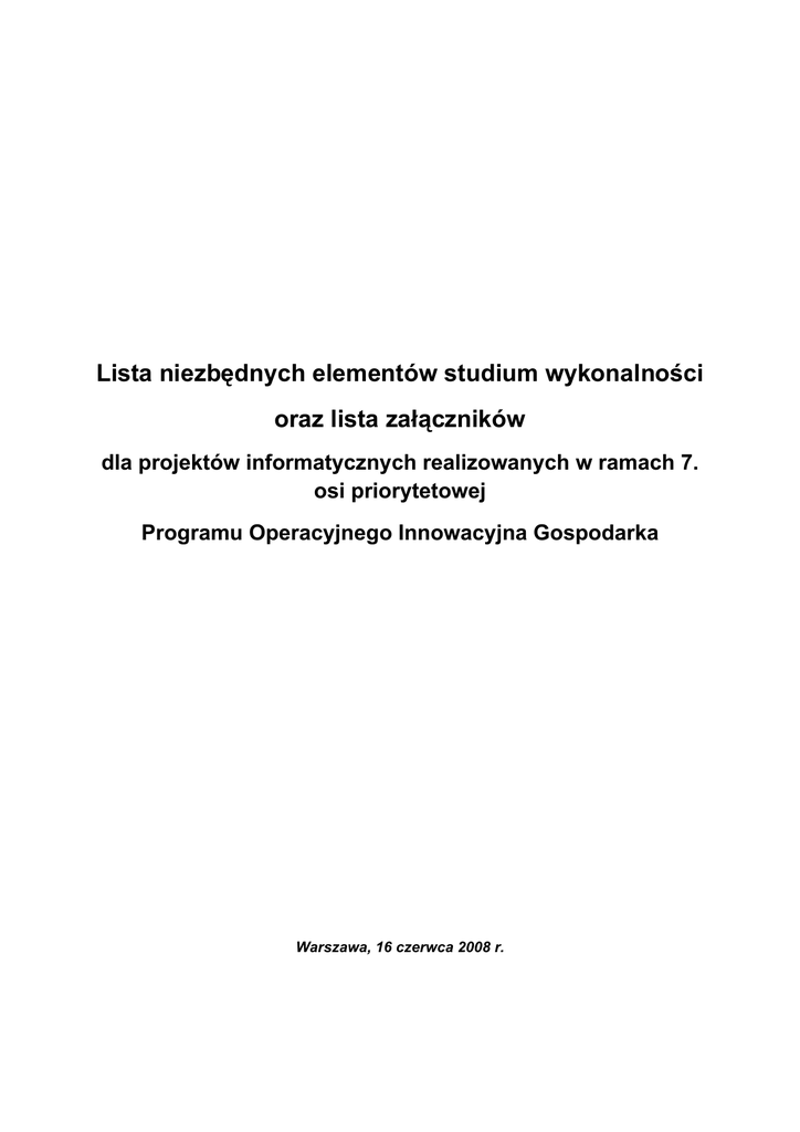 Lista niezbędnych elementów studium wykonalności oraz lista załączników dla projektów informatycznych realizowanych w ramach 7. osi priorytetowej Programu Operacyjnego Innowacyjna Gospodarka Warszawa, 16 czerwca 2008 r. Wstęp Wprowadzenie Słownik pojęć Studium wykonalności I. Podsumowanie II. Podstawowe informacje o projekcie. II.1. Geneza i istota projektu. II.2. Tytuł projektu. II.3. Cel projektu. II.4. Lokalizacja projektu. II.5. Odbiorcy ostateczni projektu. III. Charakterystyka podmiotów odpowiedzialnych za realizację przedsięwzięcia. III.1. Dane formalne i administracyjne Beneficjenta i Operatora. III.2. Stosunki prawno – własnościowe między poszczególnymi stronami projektu. III.3. Doświadczenie stron projektu. IV. Analiza otoczenia projektu. IV.1. Analiza otoczenia społeczno – gospodarczego. IV.2. Zidentyfikowane problemy. IV.3. Analiza SWOT. V. Logika interwencji. V.1. Cele projektu. V.2. Spójność celów projektu z celami dokumentów strategicznych. V.3. Wpływ projektu na polityki horyzontalne UE. V.4. Korzyści i oddziaływanie. V.5. Wskaźniki produktu projektu. V.6. Wskaźniki rezultatu projektu. VI. Trwałość techniczna projektu. VI.1. Opis istniejącego systemu. VI.2. Analiza opcji. VI.2.1. Opis możliwych opcji realizacji projektu. VI.2.2. Analiza opcji. VI.2.3. Podsumowanie analizy opcji. VI.3. Opis techniczny projektu. VI.4. Zgodność projektu z wymaganiami dla rejestrów publicznych i wymiany informacji w formie elektronicznej. VI.5. Zgodność projektu z minimalnymi wymaganiami dla systemów teleinformatycznych. VII. Wykonalność i trwałość instytucjonalna przedsięwzięcia. VII.1. Organizacja wdrożenia i późniejszej eksploatacji projektu. VII.2. Planowane i przeprowadzone procedury przetargowe. VII.3. Przygotowanie formalno-administracyjne przedsięwzięcia. VII.3.1. Wydane decyzje i pozwolenia. VII.3.2. Wymagane decyzje i pozwolenia i termin ich pozyskania. VII.3.3. Harmonogram realizacji przedsięwzięcia. VIII. Finansowa trwałość projektu. VIII.1. Podstawowe założenia do analizy finansowej. VIII.2. Nakłady inwestycyjne. VIII.3. Harmonogram rzeczowo-finansowy przedsięwzięcia. VIII.4. Amortyzacja i nakłady odtworzeniowe. VIII.5. Prognoza przychodów i kosztów operacyjnych przedsięwzięcia. VIII.6. Zapotrzebowanie na kapitał obrotowy – w okresie realizacji oraz eksploatacji projektu. VIII.7. Prognoza rachunku zysków i strat projektu. VIII.8. Prognoza rachunku przepływów pieniężnych projektu. VIII.9. Sytuacja finansowa Beneficjenta w okresie realizacji i eksploatacji projektu. VIII.10. Analiza wrażliwości. VIII.11. Podsumowanie analizy trwałości finansowej projektu. IX. Analiza kosztów i korzyści społecznych. IX.1. Charakterystyka kosztów i korzyści związanych z realizacją projektu. IX.2. Analiza kosztów i korzyści społecznych. IX.2.1. Efekty społeczne. IX.2.2. Wyeliminowanie transferów. IX.2.3. Wycena czynników produkcji wg cen ukrytych i kosztu alternatywnego. IX.3. Ocena efektywności społeczno-ekonomicznej. IX.4. Analiza ryzyka. Lista niezbędnych tabel finansowych, które należy zawrzeć w studium wykonalności. Tabela 1. Założenia makroekonomiczne. Tabela 2. Projekt UE – nakłady inwestycyjne. Tabela 3. Projekt UE - źródła finansowania. Tabela 4. Projekt UE - planowane przychody. Tabela 5. Projekt UE – planowane koszty bieżące. Tabela 6. Projekt UE – Rachunek zysków i strat. Tabela 7. Projekt UE – Rachunek przepływów pieniężnych. Tabela 8. Wnioskodawca / Operator – Rachunek zysków i strat. Tabela 9. Wnioskodawca / Operator – Rachunek przepływów pieniężnych. Tabela 10. Wnioskodawca / Operator – Bilans. Tabela 11. Finansowy zwrot z inwestycji (FNPV/C, FIRR/C) – Projekt UE bez dotacji – opcjonalnie. Tabela 12. Ekonomiczny zwrot z inwestycji (ENPV/C, EIRR/C) – Projekt UE bez dotacji – opcjonalnie. Tabela 13. Analiza wrażliwości projektu. Tabela 14. Analiza ryzyka projektu. Lista załączników do studium wykonalności 1. Matryca logiczna dla projektu (opcjonalnie). 2. Harmonogram rzeczowo – finansowy realizacji projektu. 3. Umowa konsorcjum między partnerami projektu (opcjonalnie). MATRYCA LOGICZNA PROJEKTU Nazwa i numer priorytetu: Przewidywana data rozpoczęcia Przewidywana data zakończenia rzeczowej realizacji projektu: Tytuł projektu: Grupa docelowa: Nazwa Beneficjenta: Logika działań Mierniki powodzenia Intervention Logic Verifiable Indicators Źródła informacji i weryfikacji Założenia i możliwe zagrożenia Assumptions Sources of Verification Cele nadrzędne Overall objectives Cele projektu Programme Purpose Jakie są nadrzędne, szersze cele: Programu Operacyjnego, Priorytetu 7. oraz Planu Informatyzacji Państwa, do których osiągnięcia przyczyni się realizowany projekt? Przykładowo – wdrożenie platformy e-usług będzie przyczyniać się do realizacji celu osi 7. – „poprawa warunków prowadzenia działalności gospodarczej poprzez zwiększenie dostępności zasobów informacyjnych administracji publicznej oraz usług publicznych w formie cyfrowej dla obywateli i przedsiębiorców” Określenie celów projektu i ich zgodności z celami nadrzędnymi Jakie są cele projektu? Które z Co będzie miernikiem osiągnięcia celów projektu? Przykładowo – dla projektu mającego na Skąd pochodzić będzie informacja na temat wskaźników osiągnięcia postawionych celów? Mogą Jakie czynniki zewnętrzne warunkują osiągnięcie celów projektu? Jakie czynniki zewnętrzne należy traktować jako zagrożenie dla realizowanego Rezultaty Results nich wspomagają osiągnięcie celów nadrzędnych? Cele projektu powinny przyczyniać się do realizacji celów priorytetu, celów Programu Operacyjnego oraz celów Planu Informatyzacji Państwa. Należy określić, które cele projektu wpływać będą na osiągnięcie celów nadrzędnych, opisanych w komórce powyżej. celu zwiększenie dostępności e-usług świadczonych przez admi