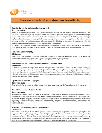 Harmonogram wydarzeń przedszkolnych na listopad 2016 r. Zbiórka darów dla małych uchodźców z Syrii do 15 listopada Jedna z przedszkolnych mam pod koniec listopada udaje się na granicę serbsko-węgierską, do Suboticy, gdzie znajduje się oficjalny obóz uchodźców, głównie uciekających z bombardowanego Alepo. Większość rodzin uciekła z Syrii kilka miesięcy temu, w klapkach, t-shirtach, bez żadnego zaplecza. Pomóżmy zebrać trochę niezbędnych rzeczy do przetrwania zimy, głównie dla dzieci – koce, śpiwory, ciepłe i przeciwdeszczowe ubrania, zabawki. Okażmy zrozumienie i przekażmy tyle, ile możemy. Dary zbierać będziemy w Sali Makowej do 15 listopada. W ramach tych działań naszym przedszkolakom przybliżymy kulturę małych uchodźców zapoznając ich z syryjską bajką, muzyką, przedstawiając z czego zrodziła się konieczność niesienia pomocy. Słoneczne Eksperymenty 4 listopada Spotkania realizowane są przez rodziców naszych przedszkolaków dla grup 2 i 4, podczas warsztatów będziemy sprawdzać, jak wędrują i przenikają się kolory. Dzieci takie jak my: Międzynarodowy Dzień Postaci z Bajek 7 listopada Z okazji Międzynarodowego Dnia Postaci z Bajek (data wybrana na cześć urodzin Walta Disney’a) przeniesiemy się do krainy utkanej z bajek i baśni. Odkrywać będziemy magię, tajemnicę, humor i naukę ukrytą w barwnych opowieściach. Zaczerpniemy ze skarbnicy mądrości, która fascynuje małych i dużych od stuleci. Będzie to także dzień bajkowych przebierańców, zabaw wokół bohaterów bajek, które znają dzieci na całym świecie. Ogólnopolski konkurs „Zagrajmy” do 10 listopada Grupa Rekinów w oparciu o literaturę dziecięcą wykreuje grę, którą zgłosimy do konkursu. Dzieci takie jak my: Historia Polski do 10 listopada Animowana Historia Polski to krótki film ukazujący historię drogi do wolności naszego państwa. Dzieci same wybiorą tę część naszej historii, która chciałyby dokładniej poznać. Wspólnie pochylimy się nad różnicami między krajami, zastanowimy się jak rozpoznawać obecnie polskie symbole na podstawie rejestracji samochodowych, znaczków pocztowych, słupków biało-czerwonych, tabliczkach na budynkach, etc.) Przyroda i ja: Dlaczego Ziemia zachorowała? 14 listopada Poznamy Misia Przyrodnika, który pomoże nam określić jak wyglądała Ziemia na początku, jak wyglądały drzewa, kwiaty, jak żyły zwierzęta i jak wyglądała Ziemia później? Zastanowimy się, co było powodem choroby Ziemi, skąd biorą się śmieci? Dlaczego sprzątanie natury jest ważne, będziemy zastanawiać się do czego możemy wykorzystać niepotrzebne przedmioty. W ramach tych rozważań zbierać będziemy nakrętki i makulaturę. Wykonamy także doświadczenie „czyścioch”. Planetarium 18 listopada Przedszkole odwiedzi mobilne planetarium, dzieci wybiorą się na seans „Gwiezdne opowieści”, by z bliska obejrzeć Słońce, Księżyc i planety, poznać piękne gwiazdozbiory i posłuchać związanych z nimi legend. Przedszkolaki obejrzą deszcz meteorów, a nawet sprawdzą, co jest w środku naszej galaktyki. Po seansie wezmą udział w warsztatach pt: ”Teleskop bez tajemnic”, dowiedzą się jak on działa i wykonają proste eksperymenty z soczewkami i pryzmatami, a także wykonają filtr do bezpiecznego oglądania Słońca. Dzieci takie jak my: Światowy Dzień Życzliwości 21 listopada Sens Dnia Życzliwości przedstawiał najpierw znany w naszym kraju film „Podaj dalej”. Film opowiada historię 12-letniego chłopca, który postanowił zmienić świat, pomagając trzem przypadkowo spotkanym osobom. Nasze przedszkolaki zastanowią się nad tym, czym jest życzliwość, dlaczego warto być życzliwym, jak ją okazywać na co dzień. Będzie to okazja do przypomnienia zasad używania magicznych słów, w czym pomogą zabawne wierszyki. Dzieci mogą narysować w serduszku swoje dobre uczynki, opowiedzieć o nich, w ten sposób powstaną piękne plakaty, które będą przypominać nam, jak należy zachowywać się wobec innych. Warsztaty z zakresu bezpieczeństwa i zdrowia 22 listopada Sprawdzimy czym jest hartowanie organizmu, nauczymy się samodzielnego i umiejętnego wykorzystywania czynności higienicznych (jak wycieranie noska), zastanowimy się dlaczego dostosowanie ubioru do pogody jest ważne? Warsztaty psychologiczne 23 listopada Realizacja warsztatów w grupach 2,5 i 3-latków odbywać się będzie przez prowadzenie zajęć z integracji sensorycznej. W grupie 4latków poprowadzone zostaną ćwiczenia rozwijające zmysł propriocepcji. W grupie 5latków warsztaty „Moje potrzeby”, czyli nauka o mówieniu o tym co czuję, czego potrzebuję. W grupie 6latków –temat „Złość, o co tu chodzi?” – radzenie sobie ze złością u siebie i drugiej osoby. Warsztaty logopedyczne 28 października Zima tuż tuż-prowadzić będziemy ćwiczenia usprawniające aparat artykulacyjny z naciskiem na ćwiczenia usprawniające mięśnie zwieracza pierścienia gardłowego, usprawnianie słuchu fonemowego: różnicowanie głosek [k] i [g] w sylabach w nagłosie, rozwijanie słownika biernego i czynnego (zakres: tematyka zimowo-świąteczna). Dodatkowo w grupach 4, 5, 6-latków ćwiczenia dzielenia wyrazów na sylaby oraz głoski. Andrzejkowe wróżby 30 listopada Nasze babcie nie świętowały Andrzejek wspólnie z dziadkami. Chłopcy i dziewczęta bawili się osobno, zresztą zabawa ta miała również nieco inny charakter. Mniej w niej było śmiechu i radości, a więcej skupienia, magii i wiary, że tego dnia przyszłość otwiera swoje tajemnice. Przez lata zwyczaje się zmieniły, teraz bawimy się wspólnie, wróżąc sobie nawzajem, łącząc te wróżby z konkursami i wesołą zabawą. Sprawy organizacyjne Urodziny dziecka w przedszkolu W przedszkolu istnieje możliwość zorganizowania imprezy urodzinowej dla dziecka. Taką potrzebę rodzic zgłasza do wychowawcy najpóźniej na dwa 