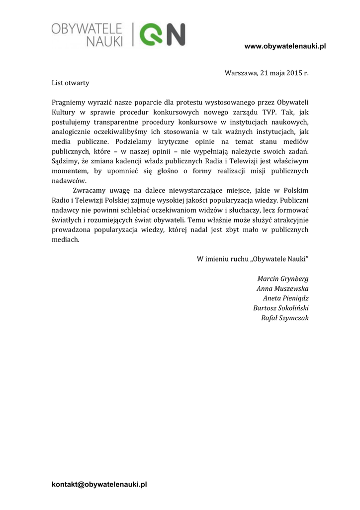 ! www.obywatelenauki.pl! ! ! Warszawa,!21!maja!2015!r.! List!otwarty! ! Pragniemy! wyrazić! nasze! poparcie! dla! protestu! wystosowanego! przez! Obywateli! Kultury! w! sprawie! procedur! konkursowych! nowego! zarządu! TVP.! Tak,! jak! postulujemy! transparentne! procedury! konkursowe! w! instytucjach! naukowych,! analogicznie! oczekiwalibyśmy! ich! stosowania! w! tak! ważnych! instytucjach,! jak! media! publiczne.! Podzielamy! krytyczne! opinie! na! temat! stanu! mediów! publicznych,! które! –! w! naszej! opinii! –! nie! wypełniają! należycie! swoich! zadań.! Sądzimy,! że! zmiana! kadencji! władz! publicznych! Radia! i! Telewizji! jest! właściwym! momentem,! by! upomnieć! się! głośno! o! formy! realizacji! misji! publicznych! nadawców.! Zwracamy! uwagę! na! dalece! niewystarczające! miejsce,! jakie! w! Polskim! Radio!i!Telewizji!Polskiej!zajmuje!wysokiej!jakości!popularyzacja!wiedzy.!Publiczni! nadawcy!nie!powinni!schlebiać!oczekiwaniom!widzów!i!słuchaczy,!lecz!formować! światłych!i!rozumiejących!świat!obywateli.!Temu!właśnie!może!służyć!atrakcyjnie! prowadzona! popularyzacja! wiedzy,! której! nadal! jest! zbyt! mało! w! publicznych! mediach.! ! W!imieniu!ruchu!„Obywatele!Nauki”! ! Marcin'Grynberg' Anna'Muszewska' Aneta'Pieniądz' Bartosz'Sokoliński' Rafał'Szymczak' [email protected]!
