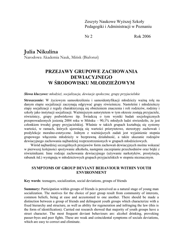 Zeszyty Naukowe Wyższej Szkoły Pedagogiki i Administracji w Poznaniu Nr 2 Rok 2006 Julia Nikulina Narodowa Akademia Nauk, Mińsk (Białoruś) PRZEJAWY GRUPOWE ZACHOWANIA DEWIACYJNEGO W ŚRODOWISKU MŁODZIEŻOWYM Słowa kluczowe: młodzież, socjalizacja, dewiacje społeczne, grupy przyjacielskie Streszczenie: W życiowym samookreśleniu i samoidentyfikacji młodzieży ważną rolę na danym etapie socjalizacji zaczynają odgrywać grupy rówieśnicze. Nastoletni i młodzieńczy etapy socjalizacji z reguły charakteryzują się obniżeniem znaczenia i roli rodziców, rodziny i szkoły jako instytucji socjalizacji. Ważniejszym autorytetem w tym okresie zostają przyjaciele, rówieśnicy, grupy podwórkowe itp. Świadczą o tym wyniki badań socjologicznych przeprowadzonych jesienią 2004 roku w Mińsku – 90,1% młodych ludzi stwierdziło, że jest członkiem trwałej grupy przyjacielskiej. Właśnie w takich grupach kształtują się systemy wartości, w ramach, których ujawniają się wartości priorytetowe, stereotypy zachowań i predylekcje moralno-estetyczne. Jednym z ważniejszych zadań jest wyjaśnienie stopnia grupowego włączenia młodzieży w bezprawną działalność, a także ukazanie rodzajów dewiacyjnego zachowania najbardziej rozprzestrzenionych w grupach młodzieżowych. Wśród najbardziej szczególnych przejawów form zachowań dewiacyjnych można wskazać w pierwszej kolejności spożywanie alkoholu, następnie zaczepianie przechodniów oraz bójki z rówieśnikami. Inne rodzaje zachowania dewiacyjnego (używanie narkotyków, prostytucja, rabunek itd.) występują w młodzieżowych grupach przyjacielskich w stopniu nieznacznym. SYMPTOMS OF GROUP DEVIANT BEHAVIOUR WITHIN YOUTH ENVIRONMENT Key words: teenagers, socialization, social deviations, groups of friends Summary: Participation within groups of friends is perceived as a natural stage of young man socialization. The motives for the choice of peer group result from community of interests, common beliefs, being at ease and accustomed to one another. There should be made a distinction between a group of friends and delinquent youth groups which characterize with a fixed hierarchy and structure, as well as ability for regeneration and infringing the law (this is the form of identification). Carried out research showed that majority of youth groups have a street character. The most frequent deviant behaviours are: alcohol drinking, provoking passer-byes and peer fights. These are weak and coincidental symptoms of socials deviations, which are easy to correct and eliminate. 148 Prewencja W określeniu swojego miejsca w życiu i w samoidentyfikacji młodzieży ważną rolę na określonym etapie socjalizacji zaczynają odgrywać grupy rówieśnicze. Nastoletni i młodzieńczy etap socjalizacji charakteryzuje się zazwyczaj redukcją wartości i roli rodziców, rodziny i szkoły jako instytucji socjalizacji. Najważniejszymi autorytetami w tym okresie stają przyjaciele, rówieśnicy, koledzy z podwórka in. Właśnie w ramach grup rówieśniczych kształtują się systemy orientacji, obejmujące zwłaszcza określone priorytety wartościowe i stereotypy zachowaniowe, przede wszystkim moralno-estetyczne. Grupy rówieśnicze młodych ludzi są swojego rodzaju „arenami kulturowymi”, na których nastolatki przechodzą proces socjalizacji i kształtują swój stosunek do innych ludzi. Związane to jest z tym, że dla człowieka wstępującego w życie dorosłe charakterystyczne jest dążenie jeżeli nie do obalenia ideałów swoich ojców, to przynajmniej do poddania ich pod wątpliwość. Wiąże się to z pragnieniem samoidentyfikacji i zdobycia autorytetu właśnie w środowisku swoich rówieśników, a nie w oczach dorosłych. Dlatego na tym etapie socjalizacji nagle wzrasta wartość grup rówieśniczych, w których praktycznie funkcjonują wszystkie nastolatki. Świadczą o tym między innymi dane uzyskane w czasie sondażu socjologicznego przeprowadzonego jesienią 2004 roku w Mińsku, z których wynika, że 90,1% młodych ludzi potwierdza bycie członkiem takiej grupy przyjacielskiej rówieśniczej. Zjawisko to jest zupełnie naturalne, albowiem odpowiada potrzebom konkretnego etapu socjalizacji młodego człowieka, a zatem nie może być ono scharakteryzowane jako wyłącznie negatywne. Uczestnictwo w grupach przyjacielskich postrzegamy więc jako naturalny etap w socjalizacji młodego człowieka, w pierwszej kolejności nastolatka. Ważne pytanie dotyczy jednak tego, w jakim celu zbierają się tacy kompanii, jak i gdzie oni spędzają czas, jakie są stosunki między członkami tej grupy, czy charakteryzują się oni swoistym zachowaniem dewiacyjnym? Przecież socjalizacja ma umożliwiać stały rozwój osobowościowy (dorastanie), będący złożonym procesem, któremu szczególnie w młodzieńczych latach towarzyszą kryzysy, z których nie wszystkie mogą być pokonane. Dlatego niezbędną jest analiza szczegółowa pojęcia „młodzieżowa grupa przyjacielska”. Cechami charakterystycznymi takiej grupy, z naszego punktu widzenia są: podobny wiek członków grupy, terytorialność (zamieszkiwanie w jednym rejonie, nauka w jednej szkole), wspólne spędzanie czasu wolnego, obecność sztywnej struktury wewnętrznej i aktywność sytuacyjna. Sondaż socjologiczny wykazał, że wśród motywów, którymi kierują się młodzi ludzie w wyborze grupy przyjacielskiej na pierwszym miejscu znajdują się ogólne poglądy na życie (taką odpowiedź wskazało 60,6% respondentów). Na drugiej pozycji usytuowała się potrzeba bycia razem (48,3%), dalej takie motywy, jak swoboda (wolność), nieobecność norm i reguł przyjętych u dorosłych (42,8%), zainteresowanie wspólnymi sprawami (38,8%), wspólnota losu (33,9%), zapał do wspólnego biznesu (6,9%), symbolika i podobne ubranie (5,8%). Należy podkreślić i taki ważny fakt, że dla prawie co czwartego młodego mieszkańca Mińska (24,2%) grupa przyjac