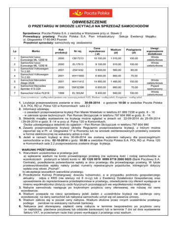 OBWIESZCZENIE O PRZETARGU W DRODZE LICYTACJI NA SPRZEDAŻ SAMOCHODÓW Sprzedawca: Poczta Polska S.A. z siedzibą w Warszawie przy ul. Stawki 2 Prowadzący przetarg: Poczta Polska S.A. Pion Infrastruktury Sekcja Ewidencji Majątku ul. Głogowska 17 60-943 Poznań Przedmiot sprzedaży: samochody wg zestawienia Lp 1 2 3 4 5 6 7 Marka Samochód Iveco Eurocargo ML 120E18 Samochód Iveco Eurocargo ML 120E18 Samochód Volkswagen T4 2.5D Samochód Volkswagen T4 2.5D Samochód Mercedes Atego 2528 Samochód Mercedes Sprinter 413 CDI Samochód Volvo FL618 Rok produkcji Nr rej. 2000 CB17213 2000 Cena wywoławcza ( zł) Wadium (zł) Postąpienie (zł) 10 100,00 1 010,00 100,00 EL17613 9 100,00 910,00 100,00 2001 ZS41432 5 600,00 560,00 60,00 2001 WH11650 6 600,00 660,00 70,00 2001 WH11412 14 900,00 1 490,00 150,00 2000 DW32396 6 600,00 660,00 70,00 1999 EL183JM 9 400,00 940,00 100,00 Uwagi: wyposażenie dodatkowe Winda załadunkowa Winda załadunkowa Winda załadunkowa Pojazd opancerzony Winda załadunkowa Cena wywoławcza - według tabeli (podane ceny zawierają podatek VAT), Wadium - według tabeli, Postąpienie - według tabeli 1. Licytacja przeprowadzona zostanie w dniu 30-09-2014 o godzinie 10:00 w siedzibie Poczta Polska S.A. POL RD ul. Polna 120 w Komornikach sala 2.2 2. Informacji udzielają: - o zasadach przeprowadzenia licytacji Pan Marek Wielebski nr telefonu 61 869 7238 w godz. 8 – 16 - w zakresie spraw technicznych Pan Roman Skrzypczak nr telefonu 797 604 990 w godz. 8 - 14 3. Składniki majątku wystawione na licytację można oglądać w dniach od 22-09-2014 do 25-09-2014 i 29-09-2014 w godz. 8 -14 w przy ul. Polna 120 w Komornikach, Osoba udostępniająca składniki do oględzin – Pan Roman Skrzypczak nr telefonu 797 604 990 4. Zasady przeprowadzenia licytacji określa Regulamin przeprowadzenia licytacji, z którym można zapoznać się w PI ul. Głogowska 17 w Poznaniu lub na wniosek zainteresowanych przesłany zostanie w formie elektronicznej na wskazany adres e-mail. 5. Jeżeli w ramach licytacji w dniu 30-09-2014 nie zostaną wyłonieni nabywcy dla poszczególnych samochodów w dniu 02-10-2014 o godz. 10:00 w siedzibie Poczta Polska S.A. POL RD ul. Polna 120 w Komornikach sala 2.2 przeprowadzona zostanie druga licytacja. WARUNKI PRZETARGU: 1. Warunkiem uczestnictwa w przetargu jest: a) wpłacenie wadium na konto prowadzącego przetarg (na wybraną ilość i rodzaj samochodów w wysokościach podanych w tabeli) konto nr 85 1320 0019 0099 0718 2000 0025 (Bank Pocztowy S.A. Centrala), przedłożenia potwierdzenia wpłaty w dniu przetargu dla prowadzącego przetarg. W tytule przelewu/dowodzie wpłaty należy podać numer/y rejestracyjny/e pojazdu/ów, którego/ych dotyczy wpłata oraz słowo „Poznań”. b) akceptacja wszystkich warunków przetargu. 2. Przedłożenie Komisji Przetargowej: dowodu tożsamości, a w przypadku podmiotu gospodarczego aktualny odpis z KRS (nie starszy niż 6 m-cy) lub z Ewidencji Działalności Gospodarczej oraz upoważnienie do reprezentowania przedsiębiorstwa w przetargu, oświadczenia czy oferent występuje w imieniu współmałżonka (dotyczy osób fizycznych pozostających we współwłasności małżeńskiej). 3. Nabycie samochodu następuje po trzykrotnym przybiciu ceny oferowanej, nie niższej niż cena wywoławcza. 4. Wadium przepada na rzecz sprzedawcy jeżeli żaden z uczestników licytacji nie zaoferuje ceny wywoławczej na dany samochód lub nabywca samochodu uchyli się od zawarcia umowy. 5. Wadium zalicza się w poczet ceny nabycia. Wadium złożone przez innych uczestników przetargu podlega zwrotowi na wskazany rachunek bankowy. 6. Nabywca jest obowiązany zapłacić cenę nabycia w terminie bezpośrednio po przybiciu ceny (w najbliższej placówce pocztowej lub oddziale bankowym) lub w terminie 7 dni od dnia wystawienia faktury VAT, w przeciwnym razie traci prawo wynikające z przetargu oraz wadium. 7. Sprzedane środki trwałe Komisja przetargowa oraz przedstawiciel jednostki organizacyjnej wydają Nabywcy w terminie 3 dni roboczych od daty dokonania wpłaty. Wszystkie koszty związane z odbiorem przedmiotu licytacji obciążają Nabywcę. SPRZEDAJĄCY ZASTRZEGA SOBIE PRAWO ODSTĄPIENIA OD PRZETARGU W KAŻDYM CZASIE BEZ PODANIA PRZYCZYNY