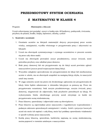 PRZEDMIOTOWY SYSTEM OCENIANIA Z MATEMATYKI W KLASIE 4 Program: Matematyka z kluczem Uczeń zobowiązany jest posiadać: zeszyt w kratkę min. 60 kartkowy, podręcznik, ćwiczenia, przybory do pisania, kredki, linijkę, kątomierz, ekierkę, cyrkiel 1. Kontrakt z uczniami: 1. Ocenianie uczniów na lekcjach matematyki dotyczy przyswojonej przez ucznia wiedzy, umiejętności, wysiłku włożonego w przygotowanie pracy i aktywności na lekcjach. 2. Uczeń ma obowiązek systematycznego i czynnego uczestnictwa w procesie uczenia się przez cały okres nauki. 3. Uczeń ma obowiązek prowadzić zeszyt przedmiotowy, zeszyt ćwiczeń, nosić potrzebne przybory oraz odrabiać prace domowe. 4. Brak pracy domowej lub nie przygotowanie się do lekcji uczeń powinien zgłosić nauczycielowi jeszcze przed rozpoczęciem danej lekcji. 5. Wszystkie zaległości spowodowane nie przygotowaniem do lekcji lub nieobecnością ucznia w szkole, ma on obowiązek uzupełnić na następną lekcję chyba, że nauczyciel ustali inny termin. 6. W ciągu semestru uczeń ma prawo do dwukrotnego zgłoszenia nie przygotowania do lekcji, które będzie odnotowane w dzienniku lekcyjnym za pomocą np. Przez nie przygotowanie rozumiemy: brak zeszytu przedmiotowego, zeszytu ćwiczeń, pracy domowej, niegotowość do odpowiedzi, brak przyborów potrzebnych na lekcję. Po wykorzystaniu limitu określonego powyżej uczeń otrzymuje za każde nie przygotowanie ocenę niedostateczną 7. Prace klasowe, sprawdziany i odpowiedzi ustne są obowiązkowe. 8. Prace klasowe są zapowiadane przez nauczyciela z tygodniowym wyprzedzeniem i podanym zakresem sprawdzanych umiejętności i wiedzy. Jeżeli z przyczyn losowych uczeń nie może ich napisać z całą klasą, może być poddany sprawdzeniu wiadomości w sposób wybrany przez nauczyciela. 9. Każdą pracę klasową, sprawdzian, kartkówkę napisaną na ocenę niedostateczną, można poprawić w terminie ustalonym z nauczycielem. 10. Krótkie sprawdziany i kartkówki (10 – 15 min.) obejmujące treści kształcenia z trzech ostatnich różnych tematów lekcji nie muszą być zapowiedziane 11. Sprawdziany pisemne będą ocenione przez nauczyciela w ciągu dwóch tygodni od ich napisania. 12. Przy formułowaniu oceny na zakończenie semestru, roku szkolnego, hierarcha ważności ocen cząstkowych jest następująca: prace klasowe, kartkówki, odpowiedzi ustne, aktywność ucznia. 13. Za błędnie odrobioną pracę domową uczeń nie otrzymuje oceny niedostatecznej. Za brak pracy domowej uczeń otrzymuje uwagę w dzienniku. 2. Obszary aktywności Na lekcjach matematyki oceniane będą następujące obszary aktywności: 1.Kształtowanie pojęć matematycznych – sprawdzenie stopnia zrozumienia pojęć matematycznych 2.Prowadzenie rozumowań – sposób prowadzenia rozumowań 3.Kształtowanie języka matematycznego – ocenianie języka matematycznego 4.Rozwiązywanie zadań matematycznych – stosowanie odpowiednich metod, sposobów wykonywania i otrzymywania rezultatów 5.Rozwiązywanie problemów 6.Stosowanie wiedzy przedmiotowej w sytuacjach praktycznych 7.Aktywność na lekcji 8.Praca w grupach 9.Wkład pracy ucznia 3. Kryteria ocen Ocenę celującą otrzymuje uczeń, który:      Posiadł wiedzę i umiejętności obejmujące pełny zakres programu nauczania matematyki w klasie 4 Samodzielnie i twórczo rozwija swoje uzdolnienia Biegle posługuje się zdobytymi umiejętnościami w rozwiązywaniu problemów teoretycznych i praktycznych Potrafi stosować posiadaną wiedzę do rozwiązywania zadań i problemów w nowych sytuacjach Osiąga sukcesy w nauce Ocenę bardzo dobrą otrzymuje uczeń, który:  Opanował pełny zakres wiedzy i umiejętności określony programem nauczania przedmiotu w danej klasie,  Sprawnie posługuje się zdobytymi wiadomościami, rozwiązuje samodzielnie problemy teoretyczne i praktyczne,  Potrafi zastosować posiadaną wiedzę do rozwiązywania zadań i problemów w nowych sytuacjach.  Oblicza wartość wielodziałaniowego wyrażenia arytmetycznego  Porównuje liczby zapisane w systemie rzymskim  Rozwiązuje zadania tekstowe z zastosowaniem dodawania i odejmowania ułamków zwykłych  Kreśli czworokąt o danych kątach  Oblicza długość boku prostokąta przy danym obwodzie i długości drugiego boku  Zamienia ułamki zwykłe i liczby mieszane na ułamki dziesiętne poprzez rozszerzanie  Rozwiązuje zadania tekstowe z zastosowaniem dodawania i odejmowania ułamków dziesiętnych  Oblicza pole figury płaskiej złożonej z kilku prostokątów  Rozwiązuje zadania tekstowe z zastosowaniem pól powierzchni prostopadłościanów Ocenę dobrą otrzymuje uczeń, który:  Prawidłowo stosuje wiadomości,  Rozwiązuje samodzielnie typowe (czasami z drobnymi wskazówkami nauczyciela) zadania teoretyczne lub praktyczne  Zapisuje i oblicz odpowiednią potęgę  Oblicza kwadrat danej liczby  Tworzy wyrażenie arytmetyczne na podstawie treści zadania i obliczy jego wartość  Odczytuje liczby zapisane w systemie rzymskim  Kreśli poszczególne rodzaje kątów  Oblicza rzeczywistą długość odcinka na podstawie podanej skali  Zmienia liczbę mieszaną na ułamek niewłaściwy  Odejmuje ułamek od całości  Rozwiązuje zadania tekstowe z zastosowaniem dodawania ułamków zwykłych  Porównuje ułamki dziesiętne  Oblicza bok kwadratu, gdy dane jest jego pole  Oblicza pole powierzchni prostopadłościanu Ocenę dostateczną otrzymuje uczeń, który:  Rozwiązuje typowe zadania teoretyczne i praktyczne o średnim stopniu trudności  Wykonuj dzielenie z resztą  Zna rodzaje kątów  Stosuje cyfry rzymskie do oznaczania dat  Kreśli proste równoległe i prostopadłe  Oblicza pole i obwód prostokąta  Porównuje ułamki zwykłe o równych licznikach  Skraca i rozszerza ułamki zwykłe  Dodaje i odejmuje ułamki dziesiętne sposobem pisemny  Zna prostopadłościan  Kreśli siatkę sześcianu Ocenę dopuszczającą otrzymuje uczeń, który:  Ma braki w opanowaniu podstawowyc