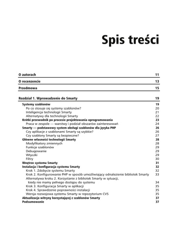 z dowolnego kodu źródłowego, do którego jest dostęp z PHP. System Smarty posiada architekturę wtyczek, którą można wykorzystać w celu dostosowania systemu do indywidualnych potrzeb. Jest również wyposażony w rozbudowane narzędzia debugowania. Z rozdziału dowiedzieliśmy się również, w jaki sposób instaluje się bibliotekę Smarty w systemach Windows i Linux.