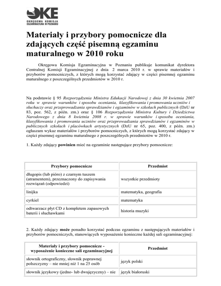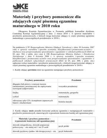 Materiały i przybory pomocnicze dla zdających część pisemną egzaminu maturalnego w 2010 roku Okręgowa Komisja Egzaminacyjna w Poznaniu publikuje komunikat dyrektora Centralnej Komisji Egzaminacyjnej z dnia 2 marca 2010 r. w sprawie materiałów i przyborów pomocniczych, z których mogą korzystać zdający w części pisemnej egzaminu maturalnego z poszczególnych przedmiotów w 2010 r. Na podstawie § 95 Rozporządzenia Ministra Edukacji Narodowej z dnia 30 kwietnia 2007 roku w sprawie warunków i sposobu oceniania, klasyfikowania i promowania uczniów i słuchaczy oraz przeprowadzania sprawdzianów i egzaminów w szkołach publicznych (DzU nr 83, poz. 562, z późn. zm.) oraz § 106 Rozporządzenia Ministra Kultury i Dziedzictwa Narodowego z dnia 8 kwietnia 2008 r. w sprawie warunków i sposobu oceniania, klasyfikowania i promowania uczniów oraz przeprowadzania sprawdzianów i egzaminów w publicznych szkołach i placówkach artystycznych (DzU nr 65, poz. 400, z późn. zm.) ogłaszam wykaz materiałów i przyborów pomocniczych, z których mogą korzystać zdający w części pisemnej egzaminu maturalnego z poszczególnych przedmiotów w 2010 r. 1. Każdy zdający powinien mieć na egzaminie następujące przybory pomocnicze: Przybory pomocnicze Przedmiot długopis (lub pióro) z czarnym tuszem (atramentem), przeznaczony do zapisywania rozwiązań (odpowiedzi) wszystkie przedmioty linijka matematyka, geografia cyrkiel matematyka odtwarzacz płyt CD z kompletem zapasowych baterii i słuchawkami historia muzyki 2. Każdy zdający może ponadto korzystać podczas egzaminu z następujących materiałów i przyborów pomocniczych, stanowiących wyposażenie konieczne każdej sali egzaminacyjnej: Materiały i przybory pomocnicze wyposażenie konieczne sali egzaminacyjnej Przedmiot słownik ortograficzny, słownik poprawnej polszczyzny – nie mniej niż 1 na 25 osób język polski słownik językowy (jedno- lub dwujęzyczny) – nie język białoruski mniej niż 1 na 25 osób słownik językowy (jedno- lub dwujęzyczny) – nie mniej niż 1 na 25 osób język litewski słownik językowy (jedno- lub dwujęzyczny) – nie mniej niż 1 na 25 osób język ukraiński słownik ortograficzny, słownik poprawnej polszczyzny, słownik języka kaszubskiego – nie mniej niż 1 na 25 osób język kaszubski słownik łacińsko-polski – dla każdego zdającego, mały atlas historyczny – nie mniej niż 1 na 25 osób język łaciński i kultura antyczna karta wybranych tablic chemicznych – dla każdego zdającego chemia karta wybranych wzorów i stałych fizycznych – dla każdego zdającego fizyka i astronomia wybrane wzory matematyczne – dla każdego zdającego matematyka słownik języka polskiego, słownik wyrazów obcych, słownik wyrazów bliskoznacznych – nie mniej niż 1 na 25 osób egzamin maturalny dla osób niesłyszących słuchawki (jeśli wymaga ich ustalone dla danego zdającego dostosowanie warunków przeprowadzania egzaminu) egzamin maturalny z języka obcego nowożytnego dla osób słabo słyszących sprzęt i oprogramowanie specjalistyczne (odpowiednie do ustalonego dla danego zdającego dostosowania warunków przeprowadzania egzaminu) egzamin maturalny dla osób niewidomych i słabo widzących 3. Każdy zdający może ponadto korzystać podczas egzaminu z następujących przyborów pomocniczych: Przybory będące fakultatywnym wyposażeniem zdającego Przedmiot linijka biologia, chemia, fizyka i astronomia kalkulator prosty* chemia, fizyka i astronomia, geografia, informatyka, matematyka lupa geografia, historia * Kalkulator prosty – jest to kalkulator, który umożliwia wykonanie tylko dodawania, odejmowania, mnożenia, dzielenia, ewentualnie obliczanie procentów lub pierwiastków kwadratowych z liczb. ul. Gronowa 22, 61-655 Poznań, tel.(061) 854-01-60 - tel/fax. (061) 852-14-41 Nasz e-mail: [email protected]