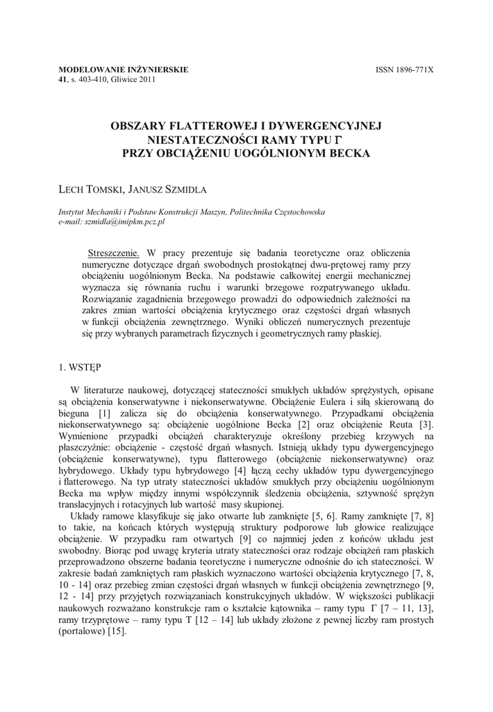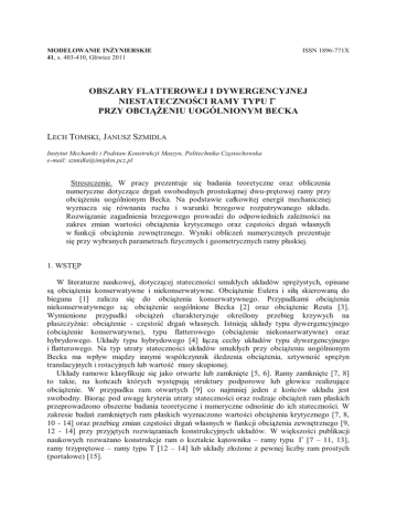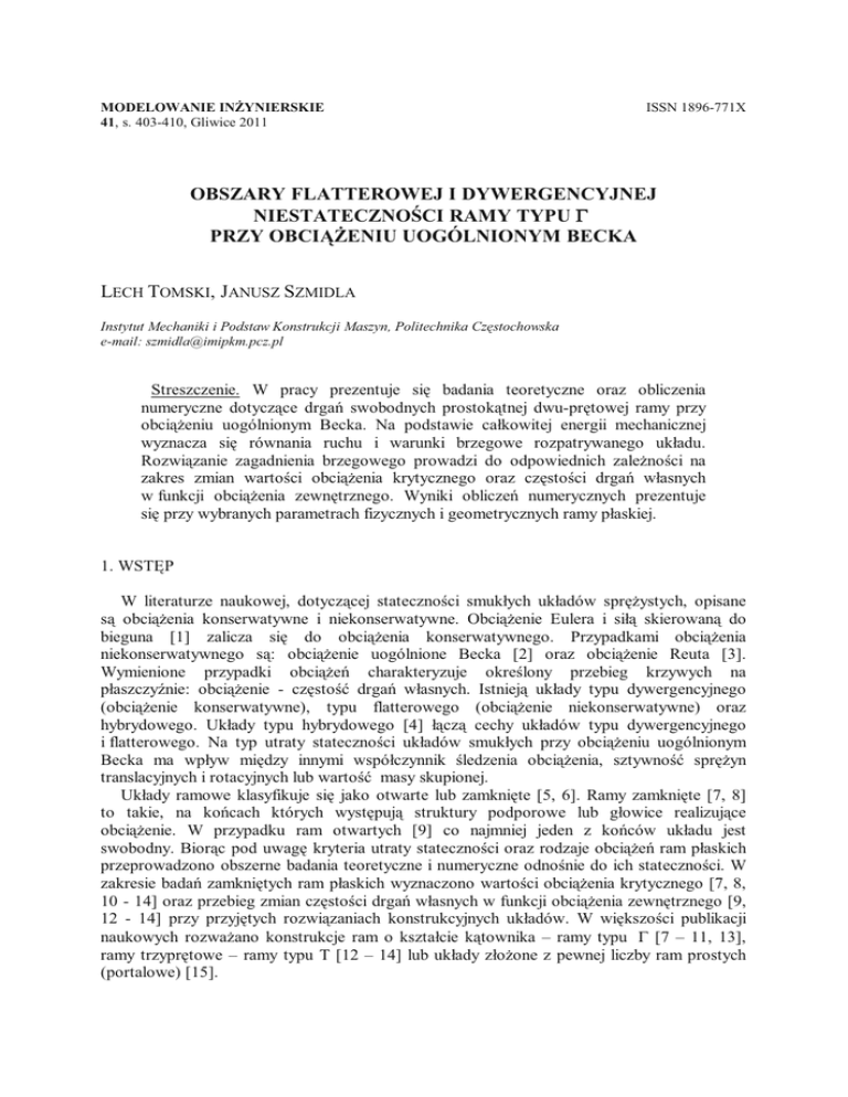 MODELOWANIE INŻYNIERSKIE 41, s. 403-410, Gliwice 2011 ISSN 1896-771X OBSZARY FLATTEROWEJ I DYWERGENCYJNEJ NIESTATECZNOŚCI RAMY TYPU Γ PRZY OBCIĄŻENIU UOGÓLNIONYM BECKA LECH TOMSKI, JANUSZ SZMIDLA Instytut Mechaniki i Podstaw Konstrukcji Maszyn, Politechnika Częstochowska e-mail: [email protected] Streszczenie. W pracy prezentuje się badania teoretyczne oraz obliczenia numeryczne dotyczące drgań swobodnych prostokątnej dwu-prętowej ramy przy obciążeniu uogólnionym Becka. Na podstawie całkowitej energii mechanicznej wyznacza się równania ruchu i warunki brzegowe rozpatrywanego układu. Rozwiązanie zagadnienia brzegowego prowadzi do odpowiednich zależności na zakres zmian wartości obciążenia krytycznego oraz częstości drgań własnych w funkcji obciążenia zewnętrznego. Wyniki obliczeń numerycznych prezentuje się przy wybranych parametrach fizycznych i geometrycznych ramy płaskiej. 1. WSTĘP W literaturze naukowej, dotyczącej stateczności smukłych układów sprężystych, opisane są obciążenia konserwatywne i niekonserwatywne. Obciążenie Eulera i siłą skierowaną do bieguna [1] zalicza się do obciążenia konserwatywnego. Przypadkami obciążenia niekonserwatywnego są: obciążenie uogólnione Becka [2] oraz obciążenie Reuta [3]. Wymienione przypadki obciążeń charakteryzuje określony przebieg krzywych na płaszczyźnie: obciążenie - częstość drgań własnych. Istnieją układy typu dywergencyjnego (obciążenie konserwatywne), typu flatterowego (obciążenie niekonserwatywne) oraz hybrydowego. Układy typu hybrydowego [4] łączą cechy układów typu dywergencyjnego i flatterowego. Na typ utraty stateczności układów smukłych przy obciążeniu uogólnionym Becka ma wpływ między innymi współczynnik śledzenia obciążenia, sztywność sprężyn translacyjnych i rotacyjnych lub wartość masy skupionej. Układy ramowe klasyfikuje się jako otwarte lub zamknięte [5, 6]. Ramy zamknięte [7, 8] to takie, na końcach których występują struktury podporowe lub głowice realizujące obciążenie. W przypadku ram otwartych [9] co najmniej jeden z końców układu jest swobodny. Biorąc pod uwagę kryteria utraty stateczności oraz rodzaje obciążeń ram płaskich przeprowadzono obszerne badania teoretyczne i numeryczne odnośnie do ich stateczności. W zakresie badań zamkniętych ram płaskich wyznaczono wartości obciążenia krytycznego [7, 8, 10 - 14] oraz przebieg zmian częstości drgań własnych w funkcji obciążenia zewnętrznego [9, 12 - 14] przy przyjętych rozwiązaniach konstrukcyjnych układów. W większości publikacji naukowych rozważano konstrukcje ram o kształcie kątownika – ramy typu Γ [7 – 11, 13], ramy trzyprętowe – ramy typu T [12 – 14] lub układy złożone z pewnej liczby ram prostych (portalowe) [15]. 404 L. TOMSKI, J. SZMIDLA W niniejszej pracy rozwiązano zagadnienie stateczności i drgań własnych dwu-prętowej zamkniętej ramy płaskiej typu Γ, poddanej obciążeniu uogólnionemu Becka. Na podstawie zasady Hamiltona, wyznaczono równania ruchu i warunki brzegowe, niezbędne do rozwiązania zagadnienia brzegowego. Uwzględniając przyjęte parametry geometryczne oraz fizyczne układu, w tym współczynnika śledzenia obciążenia zewnętrznego ramy płaskiej, przedstawiono wyniki obliczeń teoretycznych i numerycznych. Podano zakres wartości obciążenia krytycznego oraz przebieg zmian częstości drgań własnych w funkcji obciążenia zewnętrznego. Analizowano wpływ współczynnika asymetrii sztywności na zginanie słupa i rygla ramy oraz współczynnika śledzenia na obszary niestateczności dywergencyjnej i flatterowej układu. 2. MODEL FIZYCZNY, ENERGIA MECHANICZNA UKŁADU Na rys.1 przedstawiono sposób obciążenia oraz sposób zamocowania rozpatrywanego układu typu Γ. Rama składa się dwóch prętów o sztywnościach na zginanie (EJ1), (EJ2) oraz masy przypadającej na jednostkę długości (ρA1), (ρA2). Rygiel ramy o sztywności na zginanie oraz słup ramy o sztywności na zginanie (EJ1) zamocowane są w sposób sztywny. Rys. 1. Model fizyczny ramy płaskiej przy obciążeniu uogólnionym Becka Pręty układu (słup i rygiel) połączono w ten sposób, że kąty ugięcia obu członów ramy są sobie równe. Rygiel ramy ma dodatkowo możliwość przemieszczenia w kierunku wzdłużnym. W przypadku rozważanego obciążenia uogólnionego Becka, słup ramy obciążony jest siłą skupioną P, której kierunek działania przechodzi przez punkt połączenia słupa i rygla. Kierunek działania obciążenia zewnętrznego opisano współczynnikiem śledzenia obciążenia η w odniesieniu do kąta ugięcia końca słupa ramy (η∈〈0,1〉). Energia kinetyczna T, rozważanej ramy płaskiej, jest sumą energii kinetycznej poszczególnych jej prętów : OBSZARY FLATTEROWEJ I DYWERGENCYJNEJ NIESTATECZNOŚCI RAMY TYPU Γ PRZY … 405 2 T = ∑ (ρAi ) l ⎡ ∂Wi (xi , t )⎤ 2 dx i i =1 ∫⎢ 0⎣ 2 ⎥⎦ ∂t (1) i W zapisie energii potencjalnej V uwzględnia się sprężystość zginania poszczególnych prętów układu oraz kierunek działania obciążenia zewnętrznego: (EJ i ) l ⎡ ∂ 2Wi (xi , t )⎤ 2 V = ∑ ∫⎢ ⎢ 0⎣ 2 i =1 2 P l1 ⎡ ∂W1 (x1 , t )⎤ dx1 ⎥ dxi − ∫ ⎢ 2 0 ⎣ ∂x1 ⎥⎦ ⎦⎥ i ∂xi2 2 (2) Biorąc pod uwagę niepotencjalną składową obciążenia określonego współczynnikiem śledzenia η (por. rys.1) wyznacza się dodatkowo zależność opisującą pracę sił niezachowawczych L w rozważanym układzie: L = − Pη 3. SFORMUŁOWANIE BRZEGOWE ∂W1 (x1 , t ) ∂x1 x1 = l1 ZAGADNIENIA, W1 (l1 , t ) (3) RÓWNANIA RUCHU, WARUNKI Zagadnienie brzegowe formułuje się na podstawie kinetycznego kryterium stateczności. Bierze się od uwagę zasadę Hamiltona, która w odniesieniu do układów niekonserwatywnch jest wyrażona wzorem: t2 δ ∫ (T − V + L )dt = 0 (4) t1 Geometryczne warunki brzegowe i warunki ciągłości rozpatrywanej ramy 
