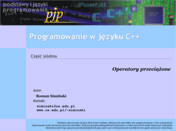 Programowanie w języku C++ Część siódma Operatory przeciążone Autor Roman Simiński Kontakt [email protected] www.us.edu.pl/~siminski Niniejsze opracowanie zawiera skrót treści wykładu, lektura tych materiałów nie zastąpi uważnego w nim uczestnictwa. Opracowanie to jest chronione prawem autorskim. Wykorzystywanie jakiegokolwiek fragmentu w celach innych niż nauka własna jest nielegalne. Dystrybuowanie tego opracowania lub jakiejkolwiek jego części oraz wykorzystywanie zarobkowe bez zgody autora jest zabronione. Podstawy i języki programowania Język C++ Operatory przeciążone Overloading ― przeciążanie, co to takiego? Przeciążanie funkcji Przeciążanie funkcji (ang. function overloading) — tworzenie większej liczby funkcji o takiej samej nazwie. Nazwa funkcji może być zatem użyta wielokrotnie do realizacji różnych czynności. Jest więc „przeciążona” dodatkowymi „obowiązkami”. Kompilator zadba o dobranie właściwej wersji funkcji przeciążonej w zależności od kontekstu jej wywołania. Przykład funkcji przeciążonej int add( int a, int b ) { return a + b; } // 1-sza wersja funkcji przeciążonej add double add( double a, double b ) { return a + b; } // 2-ga wersja funkcji przeciążonej add cout << endl << "Dodawanie int :" << add( 1, 1 ); cout << endl << "Dodawanie double :" << add( 1.0, 1.0 ); Copyright © Roman Simiński Strona : 2 Podstawy i języki programowania Język C++ Operatory przeciążone Overloading ― przeciążanie, co to takiego? Przeciążanie funkcji — rygory Przeciążanie funkcji jest możliwe, jeżeli listy parametrów funkcji przeciążonych różnią sie od siebie: typami parametrów, liczbą parametrów, jednocześnie typami i liczbą parametrów. Funkcje o tych samych nazwach i listach parametrów, różniące się tylko typem rezultatu, nie są przez kompilator rozróżniane i powodują wystąpienie błędu kompilacji. Copyright © Roman Simiński Strona : 3 Podstawy i języki programowania Język C++ Operatory przeciążone Overloading ― przeciążanie, co to takiego? Dlaczego przeciążanie nie uwzględnia rezultatu funkcji? int addAndPrint( int a, int b ) { cout << a + b; return a + b; } void addAndPrint( int a, int b ) { cout << a + b; } int result = addAndPrint( 10, 20 ); // OK addAndPrint( 10, 20 ); Copyright © Roman Simiński Strona : 4 Podstawy i języki programowania Język C++ Operatory przeciążone Overloading ― przeciążanie funkcji, szczegóły implementacyjne Przeciążanie funkcji — delikatne problemy Załóżmy, że dane są następujące funkcje: void printData( long num ) { cout << "Liczba long: " << num << endl; } void printData( float num ) { cout << "Liczba float: " << num << endl; } void printData( double num ) { cout << "Liczba double: " << num << endl; } Te wywołania są poprawne: long ln = 200; float fn = 200; double dn = 200; printData( ln ); printData( fn ); printData( dn ); Copyright © Roman Simiński Strona : 5 Podstawy i języki programowania Język C++ Operatory przeciążone Overloading ― przeciążanie funkcji, szczegóły implementacyjne Przeciążanie funkcji — delikatne problemy To wywołanie jest niepoprawne: printData( 200 ); To poprawne, leczy być może zaskakujące: printData( 3.14 ); Natomiast, gdyby istniały tylko dwie, następujące wersje funkcji printData: void printData( long num ) { cout << "Liczba long: " << num << endl; } void printData( float num ) { cout << "Liczba float: " << num << endl; } printData( 3.14 ); Copyright © Roman Simiński Strona : 6 Podstawy i języki programowania Język C++ Operatory przeciążone Overloading ― przeciążanie funkcji, szczegóły implementacyjne Przeciążanie funkcji — zasady definiowania funkcji 1. Sygnatury i typ rezultatu są jednakowe, zakłada się deklarację tej samej funkcji, różnice w nazwach parametrów nie są znaczące: void printData( long num ); void printData( long number ); 2.Sygnatury są jednakowe, typy rezultatów są różne, kompilator potraktuje drugą deklarację jako niepoprawną redeklarację tej samej funkcji i zgłosi błąd: void printData( long num ); long printData( long num ); Uwaga — przy doborze wersji funkcji przeciążonej typ rezultatu nie jest brany pod uwagę! 3.Sygnatury obu funkcji różnią są typami parametrów lub ich liczbą, mamy dwie wersje funkcji przeciążonej: int printData( int num ); long printData( long num ); Nazwa zdefiniowana przez typedef nie oznacza nowego typu: typedef int Integer; int printData( int num ); Integer printData( Integer num ); Copyright © Roman Simiński Strona : 7 Podstawy i języki programowania Język C++ Operatory przeciążone Overloading ― przeciążanie funkcji, szczegóły implementacyjne Przeciążanie funkcji — rozróżnianie wersji Poszczególne wersje funkcji przeciążonej różni sygnatura — nazwa funkcji i lista parametrów. Określenie, która wersja funkcji przeciążonej ma być wywołana w danym kontekście nazywa się rozróżnianiem wersji lub rozpoznawaniem wywołania (ang. function call resolution). Najważniejszym elementem rozpoznawania wywołania jest dopasowywanie parametrów (ang. argument matching). Polega on na porównaniu parametrów aktualnych wywołania z parametrami formalnymi funkcji. Proces dopasowania parametrów może skończyć się jednym z wariantów: udane dopasowanie, dopasowanie nie jest możliwe, dopasowanie jest niejednoznaczne. Copyright © Roman Simiński Strona : 8 Podstawy i języki programowania Język C++ Operatory przeciążone Overloading ― przeciążanie funkcji, szczegóły implementacyjne Przeciążanie funkcji — rodzaje dopasowania void printData( long num ); void printData( float num ); void printData( double num ); Udane dopasowanie printData( 10L ); printData( 10.5f ); printData( 10.5 ); Dopasowanie nie jest możliwe printData( "10" ); Dopasowanie jest niejednoznaczne printData( 10 ); Copyright © Roman Simiński Strona : 9 Podstawy i języki programowan
