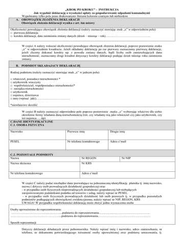 „KROK PO KROKU” - INSTRUKCJA Jak wypełnić deklarację o wysokości opłaty za gospodarowanie odpadami komunalnymi Wypełniamy tylko pola jasne drukowanymi literami kolorem czarnym lub niebieskim A. OBOWIĄZEK ZŁOŻENIA DEKLARACJI Obowiązek złożenia deklaracji wynika z art. 6m ustawy Okoliczności powodujące obowiązek złożenia deklaracji (należy zaznaczyć stawiając znak „x” w odpowiednim polu) □ pierwsza deklaracja □ korekta deklaracji, data zaistnienia zmiany danych (dzień – miesiąc – rok)…………………………………….. W części A należy wskazać okoliczności powodujące obowiązek złożenia deklaracji, poprzez postawienie znaku „x” w odpowiednim kwadracie. Jeżeli składamy deklarację po raz pierwszy zaznaczamy pierwszą deklaracje, jeżeli chcemy dokonać korekty np. z powodu zmiany danych, bądź liczby osób zamieszkujących dana nieruchomość, zaznaczamy drugi kwadrat dotyczący korekty deklaracji podając dzień miesiąc roku zaistnienia zmiany. B. PODMIOT SKŁADAJACY DEKLARACJĘ Rodzaj podmiotu (należy zaznaczyć stawiając znak „x” w jednym polu) □ właściciel, posiadacz nieruchomości * □ użytkownik wieczysty □ współwłaściciel, współposiadacz nieruchomości* □ zarządca nieruchomości □ użytkownik □ najemca, dzierżawca □ inny (wpisać jaki)…………………………… *niewłaściwe skreślić W części B należy zaznaczyć odpowiednie pole poprzez postawienie znaku „x” wybierając właściwe dla siebie określenie formy władania daną nieruchomością (tzn. czy władamy nią jako właściciel czy jako użytkownik, czy też najemca…..itp) C.DANE IDENTYFIKACYJNE C.1. OSOBA FIZYCZNA Nazwisko Pierwsze imię Drugie imię PESEL Nr telefonu kontaktowego Adres e’mail C.2. POZOSTAŁE PODMIOTY Nazwa Nr REGON Nazwa skrócona Nr KRS Nr telefonu kontaktowego Adres e’mail Nr NIP W części C należy podać niezbędne dane pozwalające na jednoznaczną identyfikację płatnika tj: imię nazwisko, nazwę ( dotyczy osób prowadzących działalność gospodarczą) oraz - w przypadku osób fizycznych nieprowadzących działalności gospodarczej lub niebędących zarejestrowanymi podatnikami podatku od towarów i usług, należy wpisać nr PESEL. - w przypadku osób fizycznych prowadzących działalność lub osób prawnych tj. w przypadku pozostałych podmiotów podlegających obowiązkowi ewidencyjnemu, należy wpisać nr NIP, REGON, KRS UWAGA! W przypadku współwłasności deklarację może złożyć jedna wyznaczona osoba Osoby upoważnione do reprezentowania: …………………………………………..podstawa do reprezentowania………………………………………….. …………………………………………..podstawa do reprezentowania…………………………………………… Sposób reprezentacji Dotyczy deklaracji składanych przez pełnomocnika. Należy wpisać imię i nazwisko, adres zamieszkania, nr telefonu, nr dokumentu potwierdzającego tożsamość osoby upoważnionej oraz podstawę umocowania, tj. pełnomocnictwo, umowa spółki, KRS itp. Do deklaracji należy dołączyć dokument potwierdzający pełnomocnictwo. W przypadku pełnomocnictwa ogólnego lub szczególnego, pełnomocnictwo powinno być udzielone na piśmie i złożone z niniejsza deklaracją w formie oryginału lub uwierzytelnionego odpisu z uiszczoną opłata skarbową (17,00 zł). Jako sposób reprezentacji należy wpisać czy pełnomocnicy mogą działać samodzielnie, czy też posiadają pełnomocnictwo łączne. D.ADRES NIERUCHOMOŚCI, KTÓREJ DOTYCZY DEKLARACJA Miejscowość Ulica Nr domu Numer lokalu Kod pocztowy Poczta Numer działki Należy wskazać dokładny adres nieruchomości, z której będą odbierane odpady komunalne. W przypadku nieruchomości niezabudowanej lub budynku w trakcie budowy, należy podać nr ewidencyjny działki. F. OŚWIADCZAM, ŻE : (należy zaznaczyć odpowiedni kwadrat poprzez postawienie znaku „x”) □ odpady z terenu nieruchomości będą zbierane w sposób selektywny □ odpady z terenu nieruchomości będą zbierane w sposób nieselektywny (czyli jako odpady zmieszane) Odpady biodegradowalne: 1.) odpady zielone* z terenu nieruchomości będą / są zagospodarowywane poprzez : □ kompostowanie □ inny (podać jaki)…………………………………………………………………………………. 2) odpady kuchenne* z terenu nieruchomości będą/są zagospodarowywane poprzez: □ kompostowanie □ inny (podać jaki)…………………………………………………………………………………. * przez odpady zielone należy rozumieć: skoszoną trawę, liście, zgrabki z ogrodu itp. * przez odpady kuchenne należy rozumieć: obierki, resztki jedzenia, itp. W części F należy podać czy odpady powstałe na nieruchomości będą gromadzone w sposób selektywny, czy nieselektywny. Od tego uzależniona jest stawka opłaty za odbiór odpadów. W przypadku zadeklarowania selektywnego zbierania odpadów na nieruchomości stawka jest niższa. Opłata za odbiór odpadów po 1 lipca 2013 r. dla nieruchomości zamieszkałych: - 5,50 zł miesięcznie od osoby zamieszkującej daną nieruchomość, jeżeli odpady będą zbierane w sposób selektywny - 11,00 zł miesięcznie od osoby zamieszkującej daną nieruchomość, jeżeli odpady będą zbierane w sposób nieselektywny Opłata za odbiór odpadów po 1 lipca 2013 r. dla nieruchomości niezamieszkałych, czyli nieruchomości, na których prowadzona jest działalność gospodarcza: jeżeli odpady będą zbierane w sposób selektywny - za 1 pojemnik o pojemności 1100 l - stawka 60,00 zł miesięcznie; - za 1 pojemnik o pojemności 120 l* - stawka 10,00 zł miesięcznie. jeżeli odpady będą zbierane w sposób nieselektywny - za 1 pojemnik o pojemności 1100 l - stawka 120,00 zł miesięcznie; - za 1 pojemnik o pojemności 120 l* - stawka 20,00 zł miesięcznie. Uwaga! Worki 