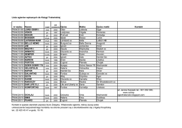 Lista ogierów wpisanych do Księgi Trakeńskiej nr wpisu TRAK/01/05 TRAK/02/06 TRAK/03/06 TRAK/04/08 TRAK/05/08 TRAK/07/08 TRAK/08/08 TRAK/09/08 TRAK/10/08 TRAK/11/09 TRAK/12/09 TRAK/13/09 TRAK/14/09 TRAK/15/10 TRAK/16/10 TRAK/17/10 TRAK/18/10 TRAK/19/10 TRAK/20/10 TRAK/21/10 TRAK/22/10 TRAK/23/10 Nazwa LORD ODER I VISKIS EKKOR BOSSIER LATERAN-IKAR BELLO NEMO JIM WEZYR I ARMATIC SEMPER AZTEC NARION PORTOS DZIEŃ DOBRY TS HELIOPOLIS NAPAR GALANTAS ODYN KASIM RAKOCZY DAR LIFE S.J. KOMFORTAS TRAK/24/10 OCHLAJ TRAK/25/10 EMIS TRAK/26/11 PUARO maść rok urodzenia siwa 2002 gn. 1997 gn. 2002 sk.gn. 2004 sk.gn. 1993 kaszt. 2004 gn. 2005 gn. 2005 kaszt. 2005 k.srok. 2004 gn. 2004 kaszt. 1996 kaszt. 2003 siwa 2004 kara 2003 gn. 2005 kaszt. 1999 gn. 2005 kaszt. 2006 kara 2004 gn. 2004 kaszt. 1997 kaszt. 2002 kaszt. 2003 gn. 2005 Ojciec Oder Losijonas Prohvet Ajbek Lombard xx Burgund xo Ignam Impuls Gluosnis xx Arianin Ignam Arion Cugnot Apogej Heleris Hamlet Go Fordas Ałtaj Gluosnis xx Sixtus Life and Liberty xx Fordas Gniewko Heleris Cugnot Matka Lebioda Virgale Ersti Bossa Ilatta Bella Donna Jutrzenka Wejmutka Anarchia Szimi Asta Nastia Planeta Dobra Nasza TS Hidraulika Nata Guboja xx Odymka Kamelia Rawka Daria Kornelija Orka Ema Planeta Ojciec matki Ogar Homeras Embolija Lwów Lattich HB Aragonit Arbór Skaleń xx Kerman Anonim Hamlet Go Libellus Chojak Machandel Hapun Silver Gerodot xx Agar Wiec Sir Shostakovich xx Sambór Liteksas Machandel Dublinas Chojak Kontakt w spawie stanówki poprzez biuro Związku. Właściciele ogierów, którzy życzą sobie umieszczenie bezpośredniego kontaktu na stronie proszeni są o skontaktowanie się z Agatą Knopińską tel.: 22 423 43 41 w godz. 10-16. Kontakt wł. Janina Karasek tel.: 501 052 006; www.ochlajogiertrakenski.blogspot.com