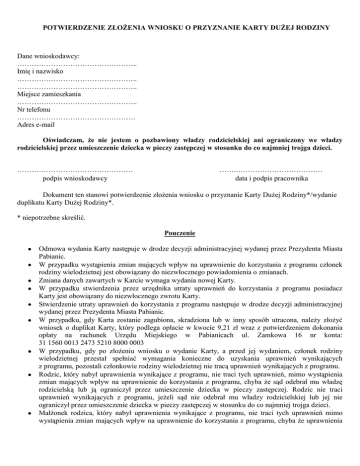 POTWIERDZENIE ZŁOŻENIA WNIOSKU O PRZYZNANIE KARTY DUŻEJ RODZINY Dane wnioskodawcy: ………………………………………….. Imię i nazwisko ………………………………………….. ………………………………………….. Miejsce zamieszkania ………………………………………….. Nr telefonu …………………………………………. Adres e-mail Oświadczam, że nie jestem o pozbawiony władzy rodzicielskiej ani ograniczony we władzy rodzicielskiej przez umieszczenie dziecka w pieczy zastępczej w stosunku do co najmniej trojga dzieci. ………………………………………… podpis wnioskodawcy …….……………………………… data i podpis pracownika Dokument ten stanowi potwierdzenie złożenia wniosku o przyznanie Karty Dużej Rodziny*/wydanie duplikatu Karty Dużej Rodziny*. * niepotrzebne skreślić. Pouczenie Odmowa wydania Karty następuje w drodze decyzji administracyjnej wydanej przez Prezydenta Miasta Pabianic. W przypadku wystąpienia zmian mających wpływ na uprawnienie do korzystania z programu członek rodziny wielodzietnej jest obowiązany do niezwłocznego powiadomienia o zmianach. Zmiana danych zawartych w Karcie wymaga wydania nowej Karty. W przypadku stwierdzenia przez urzędnika utraty uprawnień do korzystania z programu posiadacz Karty jest obowiązany do niezwłocznego zwrotu Karty. Stwierdzenie utraty uprawnień do korzystania z programu następuje w drodze decyzji administracyjnej wydanej przez Prezydenta Miasta Pabianic. W przypadku, gdy Karta zostanie zagubiona, skradziona lub w inny sposób utracona, należy złożyć wniosek o duplikat Karty, który podlega opłacie w kwocie 9,21 zł wraz z potwierdzeniem dokonania opłaty na rachunek Urzędu Miejskiego w Pabianicach ul. Zamkowa 16 nr konta: 31 1560 0013 2473 5210 8000 0003 W przypadku, gdy po złożeniu wniosku o wydanie Karty, a przed jej wydaniem, członek rodziny wielodzietnej przestał spełniać wymagania konieczne do uzyskania uprawnień wynikających z programu, pozostali członkowie rodziny wielodzietnej nie tracą uprawnień wynikających z programu. Rodzic, który nabył uprawnienia wynikające z programu, nie traci tych uprawnień, mimo wystąpienia zmian mających wpływ na uprawnienie do korzystania z programu, chyba że sąd odebrał mu władzę rodzicielską lub ją ograniczył przez umieszczenie dziecka w pieczy zastępczej. Rodzic nie traci uprawnień wynikających z programu, jeżeli sąd nie odebrał mu władzy rodzicielskiej lub jej nie ograniczył przez umieszczenie dziecka w pieczy zastępczej w stosunku do co najmniej trojga dzieci. Małżonek rodzica, który nabył uprawnienia wynikające z programu, nie traci tych uprawnień mimo wystąpienia zmian mających wpływ na uprawnienie do korzystania z programu, chyba że uprawnienia wynikające z programu utracił rodzic lub małżeństwo z rodzicem zostało unieważnione lub rozwiązane przez rozwód. Karta nie podlega wydaniu członkowi rodziny wielodzietnej, który po złożeniu wniosku o wydanie Karty, a przed jej wydaniem, przestał spełniać wymagania konieczne do uzyskania uprawnień wynikających z programu. W przypadku osób, które ukończyły 18 lat Karta jest ważna wraz z dokumentem potwierdzającym pobieranie nauki w szkole lub w szkole wyższej. Wykaz ulg i zwolnień znajduje się na stronie Ministerstwa Pracy i Polityki Społecznej www.mpips.gov.pl ………………………………………… podpis wnioskodawcy …….……………………………… data i podpis pracownika