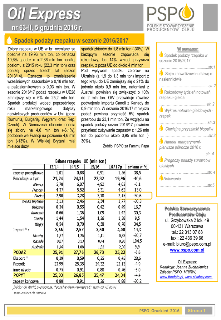 Oil Express nr 63-II, 5 grudnia 2016 r. Spadek podaży rzepaku w sezonie 2016/2017 Zbiory rzepaku w UE w br. oceniane są obecnie na 19,96 mln ton, co oznacza 10,6% spadek o o 2,36 mln ton poniżej poziomu z 2015 roku (22,3 mln ton) oraz poniżej sprzed trzech lat (sezon 2013/14). Oznacza to zmniejszenie wrześniowych szacunków o 0,18 mln ton, a październikowych o 0,03 mln ton. W sezonie 2016/17 podaż rzepaku w UE28 zmniejszy się o 6% do 25,2 mln ton. Spadek produkcji wobec poprzedniego roku marketingowego dotyczy największych producentów w Unii (poza Rumunią, Bułgarią, Węgrami oraz Rep. Czech). W Niemczech obecnie ocenia się zbiory na 4,6 mln ton (-6,1%), podobnie we Francji na poziomie 4,6 mln ton (-13%). W Wielkiej Brytanii miał miejsce duży spadek zbiorów do 1,8 mln ton (-30%). W bieżącym sezonie zapowiada się rekordowy, bo 14% wzrost przywozu rzepaku z poza UE do około 4 mln ton. Pod wpływem spadku zbiorów na Ukrainie (z 1,9 do 1,3 mln ton) import z tego kraju do UE zmniejszy się o 21% do jedynie około 0,9 mln ton, natomiast z Australii powinien się zwiększyć o 10% do 2 mln ton. OW przewiduje również podwojenie importu Canoli z Kanady do 0,9 mln ton. W sezonie 2016/17 mniejsza podaż powinna przynieść 5% spadek przerobu do 23,1 mln ton. Ze względu na spadek podaży sezon 2016/17 powinien przynieść zużywanie zapasów z 1,26 mln ton do poziomu około 0,95 mln ton (30%). Źródło: PSPO za Fammu Fapa W numerze: Spadek podaży rzepaku w sezonie 2016/2017 …………..…………..…...........str.1 Sejm znowelizował ustawę o nasiennictwie ………..………….…................str.2 Rekordowy tydzień notowań rzepaku- giełda ………..……………...............str. 2 Wykres notowań giełdowych rzepak ……………..…………………..str.3 Chwiejna przyszłość biopaliw ………………………………….str.3 Handel margarynamipierwsze półrocze 2016 r. ………………………………..str. 4 Prognozy podaży surowców oleistych …………… ……..…………....str. 4 Notowania ………..……...………….…….str.5 Polskie Stowarzyszenie Producentów Oleju ul. Grzybowska 2 lok. 49 00-131 Warszawa tel.: 22 313 07 88 fax.: 22 436 39 66 e-mail: [email protected] www.pspo.com.pl Oil Express: Redakcja: Joanna Żuchniewicz Zdjęcia: PSPO, MRiRW, www.freefoto.pl, www.pixabay.com, PSPO Grudzień 2016 Strona 1 Oil Express nr 63-II, 5 grudnia 2016 r. Sejm znowelizował ustawę o nasiennictwie Sejm znowelizował ustawę o nasiennictwie. Umożliwia ona wpisywanie do krajowego rejestru odmian gatunków, które nie są objęte przepisami UE, a są tradycyjnie uprawiane w Polsce. Ustawa wdraża przepisy trzech unijnych dyrektyw. Za ustawą głosowało 377 posłów, 35 było przeciwnych, a 15 wstrzymało się od głosu. Poprawki do projektu ustawy zgłosił klub Kukiz'15. Dotyczyły one m.in. nie wpisywania do rejestru odmian roślin organizmów genetycznie modyfikowanych (GMO), a także tego, że materiał siewny odmian genetycznie zmodyfikowanych (GMO) nie może być dopuszczony do obrotu na terytorium Polski. - Co się stało z ugrupowaniem PiS, które latach 2005-2007 wyznaczało w Europie standardy ochrony ziemi i kraju przed GMO- pytał po głosowaniu autor tych poprawek- przewodniczący sejmowej komisji rolnictwa Jarosław Sachajko (Kukuz'15). Przypomniał, że PiS deklarowało, iż będzie za Polską wolną od GMO. -- Głosowaliśmy za odrzuceniem poprawek, bo te poprawki nie załatwiają tematu. Rząd Prawa i Sprawiedliwości robi wszystko, by w Polsce nie było GMO i doprowadzimy do tego pracami Senatu, żeby takie było prawo nie było w Polsce - powiedział poseł PiS Robert Telus. Znowelizowana ustawa o nasiennictwie i o ochronie roślin wdraża postanowienia trzech dyrektyw UE. Nowe przepisy przewidują m.in. możliwość wpisywania do krajowego rejestru odmian gatunków, które nie są objęte przepisami UE, a są tradycyjnie uprawiane w Polsce. Będzie też ułatwione wpisywanie do krajowego rejestru odmian regionalnych i amatorskich oraz zmniejszenie obciążeń administracyjnych i bez opłat. Ustawa ponadto wprowadza zmiany dotyczące etykietowania, plombowania i pakowania materiału rozmnożeniowego roślin sadowniczych, definicji materiału siewnego oraz materiału szkółkarskiego oraz przepisów w zakresie rejestracji dostawców i odmian. Nowe regulacje ograniczają również koszty działania Państwowej Inspekcji Ochrony Roślin i Nasiennictwa (PIORiN). Chodzi o wprowadzenie możliwości dokonywania oceny cech zewnętrznych roślin przez akredytowanych kwalifikatorów. Dzięki nowym przepisom ma się zwiększyć skuteczność działań inspekcji. Nowelizacja przepisów powinna wejść w życie 1 stycznia 2017 r. Teraz ustawa trafi do prac w Senacie. Źródło: PSPO za Farmer.pl Rekordowy tydzień notowań rzepaku - giełda Lutowy kontrakt na rzepak notowany na MATIF w piątek potaniał o 0,3 proc., styczniowa soja na CBOT spadła o 0,2 proc. Kanadyjska canola w kontrakcie styczniowym na WCE podniosła się o 0,3 proc. Miniony tydzień na światowym rynku oleistych zakończył się w mieszanych nastrojach. Liderem rynku (pomimo piątkowej spadkowej korekty) był rzepak notowany na paryskiej giełdzie MATIF. Cztery sesje wzrostowe, w tym dwie zakończone wyznaczeniem nowych szczytów notowań w obecnej fali wzrostowej doprowadziły cenę do poziomów ostatni raz widzianych 30 kwietnia 2014 r. Ostatnie wzrosty notowań zbiegły się z silnym osłabieniem złotówki do euro. Spowodowało to znacznie większy wzrost wyceny rzepaku na MATIF wyrażonej w naszej walucie. Po piątkowej sesji jedna tona kosztowała 1839 zł- najwięcej od końca maja 2013 r. Wzrost notowań na giełdzie w Paryżu przekłada się na ceny rzepaku oferowane w kraju, chociaż średnio nadal są niższe o kilkadziesiąt zł. W piątek kanadyjska canola wyznaczyła nowy szczyt notowań w obecnej fali wzrostowej i jest najdroższ