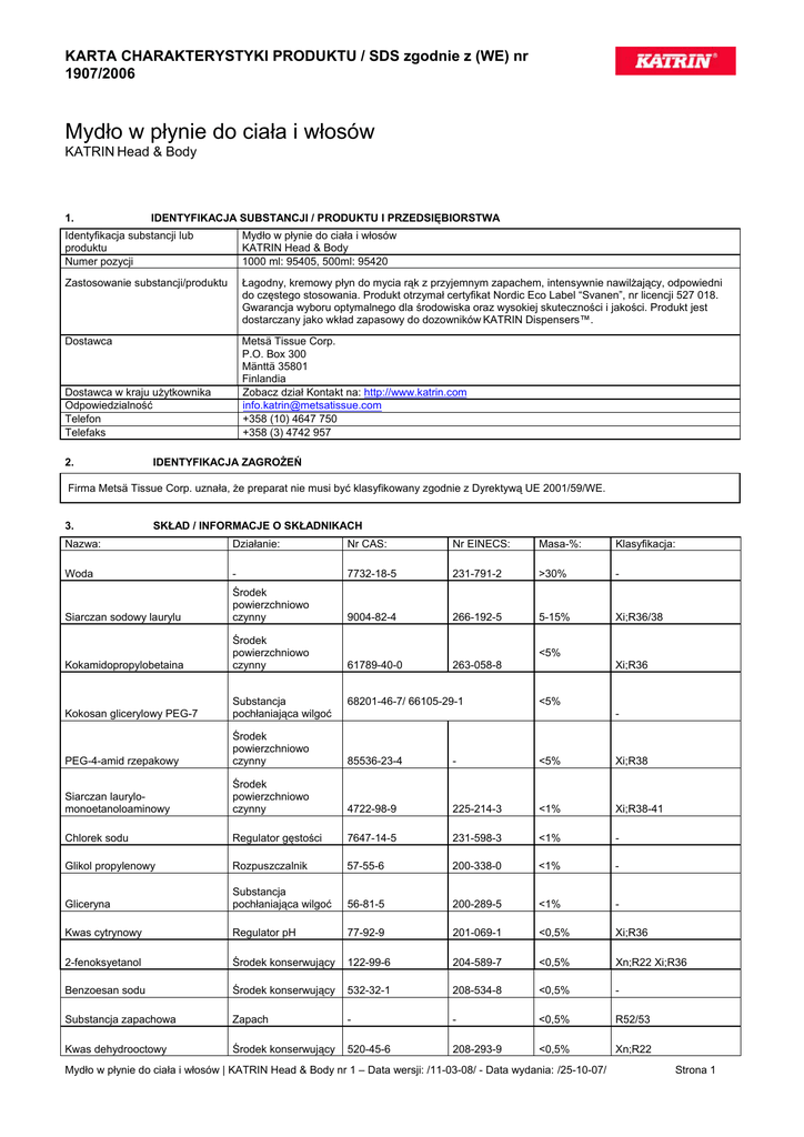 KARTA CHARAKTERYSTYKI PRODUKTU / SDS zgodnie z (WE) nr 1907/2006 Mydło w płynie do ciała i włosów KATRIN Head & Body 1. IDENTYFIKACJA SUBSTANCJI / PRODUKTU I PRZEDSIĘBIORSTWA Identyfikacja substancji lub produktu Numer pozycji Mydło w płynie do ciała i włosów KATRIN Head & Body 1000 ml: 95405, 500ml: 95420 Zastosowanie substancji/produktu Łagodny, kremowy płyn do mycia rąk z przyjemnym zapachem, intensywnie nawilżający, odpowiedni do częstego stosowania. Produkt otrzymał certyfikat Nordic Eco Label “Svanen”, nr licencji 527 018. Gwarancja wyboru optymalnego dla środowiska oraz wysokiej skuteczności i jakości. Produkt jest dostarczany jako wkład zapasowy do dozowników KATRIN Dispensers™. Dostawca Metsä Tissue Corp. P.O. Box 300 Mänttä 35801 Finlandia Zobacz dział Kontakt na: http://www.katrin.com [email protected] +358 (10) 4647 750 +358 (3) 4742 957 Dostawca w kraju użytkownika Odpowiedzialność Telefon Telefaks 2. IDENTYFIKACJA ZAGROŻEŃ Firma Metsä Tissue Corp. uznała, że preparat nie musi być klasyfikowany zgodnie z Dyrektywą UE 2001/59/WE. 3. SKŁAD / INFORMACJE O SKŁADNIKACH Nazwa: Działanie: Nr CAS: Nr EINECS: Masa-%: Klasyfikacja: Woda - 7732-18-5 231-791-2 >30% - Siarczan sodowy laurylu Środek powierzchniowo czynny 9004-82-4 266-192-5 5-15% Xi;R36/38 Kokamidopropylobetaina Środek powierzchniowo czynny 61789-40-0 263-058-8 Kokosan glicerylowy PEG-7 Substancja pochłaniająca wilgoć PEG-4-amid rzepakowy Środek powierzchniowo czynny 85536-23-4 - <5% Xi;R38 Siarczan laurylomonoetanoloaminowy Środek powierzchniowo czynny 4722-98-9 225-214-3 <1% Xi;R38-41 Chlorek sodu Regulator gęstości 7647-14-5 231-598-3 <1% - Glikol propylenowy Rozpuszczalnik 57-55-6 200-338-0 <1% - Gliceryna Substancja pochłaniająca wilgoć 56-81-5 200-289-5 <1% - Kwas cytrynowy Regulator pH 77-92-9 201-069-1 <0,5% Xi;R36 2-fenoksyetanol Środek konserwujący 122-99-6 204-589-7 <0,5% Xn;R22 Xi;R36 Benzoesan sodu Środek konserwujący 532-32-1 208-534-8 <0,5% - Substancja zapachowa Zapach - - <0,5% R52/53 Kwas dehydrooctowy Środek konserwujący 520-45-6 208-293-9 <0,5% Xn;R22 <5% 68201-46-7/ 66105-29-1 Xi;R36 <5% - Mydło w płynie do ciała i włosów | KATRIN Head & Body nr 1 – Data wersji: /11-03-08/ - Data wydania: /25-10-07/ Strona 1 Iminodibursztynian sodowy Środek kompleksujący 144538-83-0 - <0,5% - Oktoksygliceryna Modyfikator 70445-33-9 - <0,5% Xn;R22 Xi;R41 R52/53 CI 42090 Barwnik 2650-18-2 220-168-0 <0,5% - 4. PIERWSZA POMOC Wdychanie Jeżeli produkt jest stosowany zgodnie z zaleceniem, niebezpieczeństwo związane z jego wdychaniem jest niewielkie. Dokładnie przepłukać jamę ustną wodą. Pić dużo wody. W przypadku, gdy dyskomfort nie ustępuje, zasięgnąć porady lekarza i przedstawić niniejszą kartę charakterystyki. Przemyć wodą. Niezwłocznie przepłukać otwarte oczy dużą ilością wody. Gdy podrażnienie nie ustępuje, zasięgnąć porady lekarza. Połknięcie Kontakt ze skórą Kontakt z oczami 5. POSTĘPOWANIE W PRZYPADKU POŻARU Środki ostrożności chroniące przed pożarem. Odpowiednie środki gaśnicze. 6. Zob. punkt 8. Przechowywać w oryginalnym szczelnym pojemniku. Nie dopuścić do zamarznięcia. Zastosowanie – zob. punkt 1. KONTROLA NARAŻENIA I ŚRODKI OCHRONY INDYWIDUALNEJ Kontrola narażenia Wartości graniczne ekspozycji Środki ochrony osobistej Środki kontroli ekspozycji środowiskowej 9. Unikać rozlania. Przewietrzyć obszar, w którym nastąpił wyciek. Unikać przedostania się dużych ilości do kanalizacji - zob. punkt 12. Spłukać dużą ilością wody. Dalsze metody obchodzenia się z wyciekiem - zob. punkt 13. POSTĘPOWANIE Z SUBSTANCJĄ / PRODUKTEM I JEGO / JEJ PRZECHOWYWANIE Sposób postępowania Bezpieczne przechowywanie Specyficzne zastosowanie(a) 8. - POSTĘPOWANIE W PRZYPADKU NIEZAMIERZONEGO UWOLNIENIA DO ŚRODOWISKA Środki ochrony osobistej. Środki ochrony środowiska Metody oczyszczania. 7. Produkt nie jest łatwopalny. Po użyciu przemyć ręce i zanieczyszczone miejsca wodą. W typowych warunkach nie są konieczne. W przypadku powtarzającej się ekspozycji stosować rękawice ochronne wykonane np. z gumy nitrylowej. - WŁAŚCIWOŚCI FIZYKOCHEMICZNE Wygląd Ciecz Kolor Niebieski Zapach Świeży kwiatowy Rozpuszczalność w wodzie Rozpuszczalny pH (stężony) 4,5 +/- 0,1 Lepkość 1500 – 2500 cP Gęstość 1,02 Temperatura zapłonu - Temperatura wrzenia - 10. STABILNOŚĆ I REAKTYWNOŚĆ Stabilność Warunki, których należy unikać Materiały, których należy unikać Niebezpieczne produkty rozkładu 11. Ostra toksyczność Skóra Wdychanie Oczy Połknięcie 12. Stabilny Unikać zamrażania. - INFORMACJE TOKSYKOLOGICZNE Poniższe dane są oparte na informacjach od dostawców i danych z literatury. Nie zaobserwowano podrażnienia. W typowych warunkach stosowania wdychanie jest mało prawdopodobne. Może powodować dyskomfort np. podrażnienie. Może powodować dyskomfort. Mogą wystąpić mdłości, ból i zawroty głowy. INFORMACJE EKOLOGICZNE Produkt zawiera substancje niebezpieczne dla środowiska. Środki powierzchniowo czynne zawarte w produkcie spełniają wymagania testu Mydło w płynie do ciała i włosów | KATRIN Head & Body nr 1 – Data wersji: /11-03-08/ - Data wydania: /25-10-07/ Strona 2 ostatecznej biodegradowalności zgodnie z przepisami WE dotyczącymi surfaktantów w detergentach. 13. POSTĘPOWANIE Z ODPADAMI Informacje ogólne Postępować zgodnie z krajowymi i lokalnymi przepisami. Kod EWC 20 01 30 14. INFORMACJE O TRANSPORCIE Niniejszy produkt nie został sklasyfikowany jako niebezpieczny w transporcie (ADR/RID). 15. INFORMACJE DOTYCZĄCE PRZEPISÓW PRAWNYCH Zawartość - Kody określeń ryzyka (zwroty R) i bezpieczeństwa (zwroty S) Ograniczenia stosowania Firma Metsä Tissue Corp. uznała, że produkt nie musi być klasyfikowany. 16. - INNE INFORMACJE Opakowanie Zwroty R wspomniane w punkcie 2 i 3: Liczba butelek na opakowanie: 500 ml: 12 sztuk 1000 ml 6 sztuk R