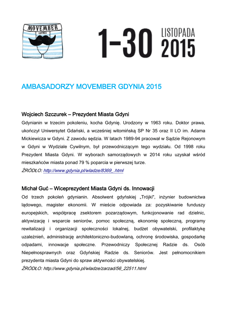 AMBASADORZY MOVEMBER GDYNIA 2015 Wojciech Szczurek – Prezydent Miasta Gdyni Gdynianin w trzecim pokoleniu, kocha Gdynię. Urodzony w 1963 roku. Doktor prawa, ukończył Uniwersytet Gdański, a wcześniej witomińską SP Nr 35 oraz II LO im. Adama Mickiewicza w Gdyni. Z zawodu sędzia. W latach 1989-94 pracował w Sądzie Rejonowym w Gdyni w Wydziale Cywilnym, był przewodniczącym tego wydziału. Od 1998 roku Prezydent Miasta Gdyni. W wyborach samorządowych w 2014 roku uzyskał wśród mieszkańców miasta ponad 79 % poparcia w pierwszej turze. ŹRÓDŁO: http://www.gdynia.pl/wladze/8369_.html Michał Guć – Wiceprezydent Miasta Gdyni ds. Innowacji Od trzech pokoleń gdynianin. Absolwent gdyńskiej „Trójki", inżynier budownictwa lądowego, magister ekonomii. W mieście odpowiada za: pozyskiwanie funduszy europejskich, współpracę zsektorem pozarządowym, funkcjonowanie rad dzielnic, aktywizację i wsparcie seniorów, pomoc społeczną, ekonomię społeczną, programy rewitalizacji i organizacji społeczności lokalnej, budżet obywatelski, profilaktykę uzależnień, administrację architektoniczno-budowlaną, ochronę środowiska, gospodarkę odpadami, innowacje Niepełnosprawnych społeczne. oraz Gdyńskiej Przewodniczy Radzie ds. Społecznej Seniorów. prezydenta miasta Gdyni do spraw aktywności obywatelskiej. ŹRÓDŁO: http://www.gdynia.pl/wladze/zarzad/56_22511.html Radzie Jest ds. Osób pełnomocnikiem Marek Stępa – Wiceprezydent Miasta Gdyni ds. Rozwoju Z zawodu architekt, studiował na Politechnice Gdańskiej, tam też w 1993 roku obronił pracę i uzyskał tytuł doktora nauk technicznych w zakresie architektury i urbanistyki. Ukończył także studia podyplomowe w zakresie pedagogiki w Instytucie Kształcenia Nauczycieli i Badań Oświaty oraz religioznawstwa na Uniwersytecie Gdańskim. Posiada duże doświadczenie zawodowe w zakresie budownictwa. Od 1994 radny Rady Miasta Gdyni, przez 4 lata pełnił funkcję przewodniczącego Komisji Gospodarki Komunalnej. Od 1998 wiceprezydent miasta. Jest odpowiedzialny m.in. za planowanie przestrzenne, inwestycje miejskie, transport publiczny oraz ochronę dziedzictwa. ŹRÓDŁO: http://www.gdynia.pl/wladze/zarzad/56_22514.html Mirek Trymbulak – projektant mody Współautor (wraz z Jolą Słomą) dwóch książek "Nakarmić duszę" i "Ubrać duszę". Prowadzą Atelier w Gdyni gdzie od 1993 roku wspólnie z zespołem fachowców dbają o to by każdy klient niezależnie od płci, wieku, sylwetki i okazji poczuł się wyjątkowo i wyszedł dobrze ubrany. Od 2010 roku zapraszają również do nowego Atelier w Warszawie, na Powiślu. Są autorami książek kucharskich ''nakarmić duszę'' i ''ubrać duszę'', a także pierwszego wegetariańskiego programu kulinarnego ''Atelier Smaku'' obecnego na antenie Kuchnia.Tv od 2008 roku. ŹRÓDŁO: https://www.facebook.com/Jola-S%C5%82oma-Mirek-Trymbulak116217501760967/info/?tab=page_info Drużyna Rugby Club Arka Gdynia Rugby Club Arka Gdynia powstał w 1996 roku. Został założony z inicjatywy byłych zawodników trójmiejskich klubów rugby oraz kibiców piłkarskiej sekcji Arki, funkcjonując najpierw jako sekcja rugby w MZKS Arka Gdynia, a obecnie jako stowarzyszenie kultury fizycznej. W ciągu swojej niespełna dwudziestoletniej historii RC Arka Gdynia stała się sportową wizytówką miasta i jedną z najsilniejszych drużyn w polskim rugby. W krótkim czasie nasza drużyna zdobyła trzy tytuły Mistrza Polski, sześciokrotnie kończyła rozgrywki Ekstraligi Rugby ze srebrnym medalem, a czterokrotnie zdobyła brązowy medal. W 2005 roku rugbiści Arki wygrali klubowy Puchar Europy w Splicie. ŹRÓDŁO: http://www.arkarugby.pl/?page_id=149 Łukasz Skrzycki – Mistrz Polski w Klasie Żeglarskiej 505 Członek zarządu PSK 505. Przez 10 lat żeglował z sukcesami w klasie Cadet. http://sailbook.pl/artykul/2638-piszemy-o-sobie-lukasz-skrzycki Marek Ciszewski – dyr. C.H. Riviera Marek Ciszewski dyrektor Centrum Handlowego Riviera w Gdyni. Jest absolwentem handlu zagranicznego. Współpracę z centrami handlowymi rozpoczął piętnaście lat temu, dołączając do firmy Steen&Strom realizującej wspólnie z TK Development jedne z pierwszych w Polsce centrów handlowych, m.in. CH Targówek i CH Reduta w Warszawie. W projekt Riviera był zaangażowany – z kilkumiesięczną przerwą – od 4 lat, finalizując negocjacje umów najmu z kluczowymi najemcami centrum. Od 2002 roku posiada licencję zarządcy nieruchomości. ŹRÓDŁO: http://retailnet.pl/2013/09/03/76803-nowy-dyrektor-ch-riviera/ Michał Łowkiel – prawnik, W latach 2002-2012 Radny Gdyńskiej Dzielnicy Karwiny Pracownik Kancelarii Adwokackiej Tomasz Kopoczyński. Absolwent III Liceum Ogólnokształcącego w Gdyni. W latach 2002-2012 Radny Gdyńskiej Dzielnicy Karwiny, w roku 2010 Przewodniczący Rady Dzielnicy Karwiny. Maratończyk (dwukrotnie ukończony Gdański Maraton Solidarności, zwycięzca biegu o Puchar Rektora Uniwersytetu Gdańskiego w roku 2000, ukończony Bieg Katorżnika, biegi okolicznościowe). ŹRÓDŁO: http://www.kopoczynski.pl/biuro/michal-lowkiel Piotr Witkowski – aktor Teatru Wybrzeże Absolwent PWSFTviT im. Leona Schillera w Łodzi. W 2010 roku współpracował z teatrem Chorea w Łodzi. Trener wokalny Solo Studio. Od 2012 roku aktor Teatru Wybrzeże. Wystąpił w spektaklach takich jak: „Maria Stuart”, „Przedwiośnie” czy „Faza delta”. ŹRÓDŁO: http://www.teatrwybrzeze.pl/html/zespol/11425/Piotr-Witkowski dr Lech Stachurski – Ordynator Oddziału Urologii Szpitala Miejskiego w Gdyni Jest specjalistą urologii i chirurgii ogólnej. Ukończył Wydział Lekarski Gdańskiej Akademii Medycznej. Pełni funkcję ordynatora Oddziału Urologii Szpitala Miejskiego w Gdyni. ŹRÓDŁO: https://ranking.abczdrowie.pl/d/25362,lech-stachurski Piotr Skrzycki – architekt, urbanista Pochodzi z Mierzei Wiślanej. Z wykształcenia jest architektem i urbanistą. Absolwent University of East London i