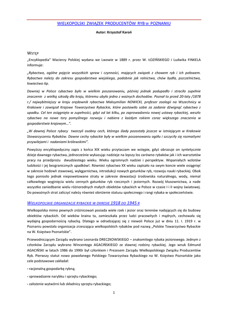 WIELKOPOLSKI ZWIĄZEK PRODUCENTÓW RYB W POZNANIU Autor: Krzysztof Karoo WSTĘP „Encyklopedia” Macierzy Polskiej wydana we Lwowie w 1889 r. przez W. ŁOZIOSKIEGO i Ludwika FINKELA informuje: „Rybactwo, ogólne pojęcie wszystkich spraw i czynności, mających związek z chowem ryb i ich połowem. Rybactwo należy do zakresu gospodarstwa wiejskiego, podobnie jak rolnictwo, chów bydła, pszczelnictwo, łowiectwo itp. Dawniej w Polsce rybactwo było w wielkim poszanowaniu, później jednak podupadło i straciło zupełnie znaczenie z wielką szkodą dla kraju, któremu ubyło jedno z ważnych dochodów. Poznał to przed 20-laty /1878 r./ najwybitniejszy w kraju orędownik rybactwa Maksymilian NOWICKI, profesor zoologii na Wszechnicy w Krakowie i zawiązał Krajowe Towarzystwo Rybackie, które postawiło sobie za zadanie dźwignąd rybactwo z upadku. Cel ten osiągnięto w zupełności, gdyż od lat kilku, po zaprowadzeniu nowej ustawy rybackiej, weszło rybactwo na nowe tory pomyślnego rozwoju i nabiera z każdym rokiem coraz większego znaczenia w gospodarstwie krajowym…”. „W dawnej Polsce rybacy tworzyli osobny cech, którego ślady pozostały jeszcze w istniejącym w Krakowie Stowarzyszeniu Rybaków. Dawne cechy rybackie były w wielkim poszanowaniu ogółu i szczyciły się rozmaitymi przywilejami i nadaniami królewskimi”. Powyższy encyklopedyczny zapis z kooca XIX wieku przytaczam we wstępie, gdyż obrazuje on syntetycznie dzieje dawnego rybactwa, jednocześnie wykazując nadzieje na lepszy los zarówno rybaków jak i ich warsztatów pracy na przedprożu dwudziestego wieku. Wieku ogromnych nadziei i perspektyw. Wspaniałych wzlotów ludzkości i jej bezgranicznych upadków!. Również rybactwo XX wieku zapisało na swym koncie wiele osiągnięd w zakresie hodowli stawowej, wylęgarnictwa, introdukcji nowych gatunków ryb, rozwoju nauki rybackiej. Obok tego poniosło jednak niepowetowane straty w zakresie dewastacji środowiska naturalnego, wody, niemal całkowitego wyginięcia wielu cennych gatunków ryb rzecznych i jeziornych. Rozwój kłusownictwa, a nade wszystko zaniedbanie wielu różnorodnych małych obiektów rybackich w Polsce w czasie I i II wojny światowej. Do poważnych strat zaliczyd należy również obniżenie statusu społecznego i rangi rybaka w społeczeostwie. WIELKOPOLSKIE ORGANIZACJE RYBACKIE W OKRESIE 1918 DO 1945 R Wielkopolska mimo pewnych zróżnicowao posiada wiele rzek i jezior oraz terenów nadających się do budowy obiektów rybackich. Od wieków kraina ta, zamieszkała przez ludzi pracowitych i mądrych, cechowała się wydajną gospodarnością rybacką. Dlatego w odradzającej się z niewoli Polsce już w dniu 11. I. 1919 r. w Poznaniu powstała organizacja zrzeszająca wielkopolskich rybaków pod nazwą „Polskie Towarzystwo Rybackie na W. Księstwo Poznaoskie”. Przewodniczącym Zarządu wybrano Leonarda DRECZKOWSKIEGO – znakomitego rybaka jeziorowego. Jednym z członków Zarządu wybrano Wincentego AGACIOSKIEGO ze sławnej rodziny rybackiej. Jego wnuk Edmund AGACIOSKI w latach 1986 do 1990r był członkiem i Prezesem Zarządu Wielkopolskiego Związku Producentów Ryb. Pierwszy statut nowo powołanego Polskiego Towarzystwa Rybackiego na W. Księstwo Poznaoskie jako cele podstawowe zakładał: - racjonalną gospodarkę rybną; - sprowadzanie narybku i sprzętu rybackiego; - założenie wytwórni lub składnicy sprzętu rybackiego; 1 - a przede wszystkim „ochronę prawną rybołówstwa”. Do chwili powstania w/w „Towarzystwa” rybactwem opiekowało się w Wielkopolsce /Zabór Pruski/ „Niemieckie Towarzystwo Rybackie” w Bydgoszczy, subwencjonowane przez rząd pruski, do którego jednak należeli i polscy rybacy. Dnia 5 kwietnia 1919 roku odbyło się w Poznaniu przy udziale 60 zawodowych rybaków i dzierżawców jezior, Walne Zgromadzenie Towarzystwa, które przyjęło statut i zatwierdziło uchwały. O powadze, z jakim traktowano sprawy zawodowe świadczy m.in. fakt, że Walne Zgromadzenie zwróciło się z prośbą do Sejmu w Warszawie o opiekę nad rybactwem polskim. W Walnym Zgromadzeniu wśród wielu znakomitych gości był dr Fr. Staff ceniony już wówczas wybitny fachowiec rybacki, którego artykuł poświęcony rybactwu odrodzonej Polski otwiera „Przegląd Rybacki” nr 1 z dn. 1 marca 1919 r. Kolejne zebranie „Towarzystwa” w dniu 5. VII. 1919 r. zmieniło jego nazwę na „Polskie Towarzystwo Rybackie w Poznaniu” – sądownie zarejestrowane. Słowo „Polskie zachowano w związku z faktem, że w tym czasie działało jeszcze na terenie Wielkopolski „Niemieckie Towarzystwo Rybackie”. W celu uzupełnienia obrazu podstawowych organizacji zajmujących się rybactwem już w 1919 roku przedstawiam ich wykaz: - „Wydział Rybacki Centralnego Towarzystwa Rolniczego W Warszawie”; - „Związek Producentów Ryb w Warszawie” – postał już w 1916 r.; - „Polskie Towarzystwo Rybackie w Poznaniu” - „Stowarzyszenie Rybaków Krakowskich”; - „Powiatowe Towarzystwo Rybackie w Jaśle” Powyższe wybitnie dokumentuje zasługi naszych przodków, którzy w momencie odzyskania niepodległości dążyli do rozwoju rybactwa, podniesienia go do właściwej rangi. W czasie kolejnych lat do 1939 r. następował intensywny rozwój organizacji rybackich obejmujących z czasem obszar całej Polski i całokształt problemów rybackich. Ich zasługą był wzrost produkcji ryb, doskonalenie fachowe rybaków przez szkolenia i kursy zawodowe, utworzenie szkoły rybackiej w Sierakowie Wlkp., reprezentowanie interesów rybaków na forum Paostwa, handlu krajowego i zagranicznego. Wielkim dziełem było doprowadzenie w 1932 r. do wydania przez Sejm Ustawy Rybackiej, wówczas bardzo postępowej i dającej podstawy do racjonalnej gospodarki rybackiej. We wszystkich tych przedsięwzięciach mieli czołowy udział przedstawiciele Wielkopolski. Wielu z nich na skutek podejmowanych akcji rządowych przesiedliło się na wschod
