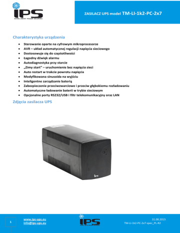 ZASILACZ UPS model TM-LI-1k2-PC-2x7 Charakterystyka urządzenia Sterowanie oparte na cyfrowym mikroprocesorze AVR – układ automatycznej regulacji napięcia sieciowego Dostosowuje się do częstotliwości Łagodny dźwięk alarmu Autodiagnostyka przy starcie „Zimy start” – uruchomienie bez napięcia sieci Auto restart w trakcie powrotu napięcia Modyfikowana sinusoida na wyjściu Inteligentne zarządzanie baterią Zabezpieczenie przeciwzwarciowe i przeciw głębokiemu rozładowaniu Automatyczne ładowanie baterii w trybie sieciowym Opcjonalne porty RS232/USB i filtr telekomunikacyjny oraz LAN Zdjęcia zasilacza UPS 1 www.ips-ups.eu [email protected] 31.08.2015 TM-LI-1k2-PC-2x7-spec_PL-R2 ZASILACZ UPS model 2 www.ips-ups.eu [email protected] TM-LI-1k2-PC-2x7 31.08.2015 TM-LI-1k2-PC-2x7-spec_PL-R2 ZASILACZ UPS model TM-LI-1k2-PC-2x7 Parametry techniczne MODEL Moc znamionowa (pozorna/czynna) TM-LI-1k2-PC-2x7 1200VA/720W WEJŚCIE Napięcie wejściowe Częstotliwość napięcia wejściowego 230VAC ± 25% (opcjonalnie - 35%) 50/60Hz ± 10% (auto selekcja) WYJŚCIE Napięcie wyjściowe Częstotliwość napięcia wyjściowego Kształt napięcia wyjściowego Współczynnik szczytu 230VAC ± 10% 50/60Hz ± 1% (auto selekcja) Tryb sieciowy: czysty sinus, Tryb bateryjny: modyfikowana sinusoida 3:1 Czas przełączenia na UPS Typowo 2-7 ms, maksymalnie 10 ms Liczba gniazd wyjściowych 3szt (CEE 7/3 Schuko) BATERIA Napięcie stałe Konfiguracja Czas ładowania Czas podtrzymania (minimalny) 100%/74%/50% 24V 2x12V/7Ah 6-8 godzin dla 90% pojemności 2 min / 5min / 8min ZABEZPIECZENIA Pełna ochrona Przeciwzwarciowa, przed głębokim rozładowaniem i przeciążeniowa PARAMETRY ŚRODOWISKOWE Wilgotność względna w czasie pracy Poziom hałasu 20~90% RH @ 0~40°C (bez kondensacji) ≤ 45 dB (1m) KOMUNIKACJA USB/RS-232/ (opcja) Wsparcie dla Windows®98/2000/2003/XP/Vista/2008/Windows®7/Windows®8 WYMIARY I WAGA Waga netto/brutto (kg) 3 9.5/10 Wymiary szer./gł./wys. (mm) a/b/c 140x347x170 Wymiary opakowania szer./gł./wys. (mm) 200x410x245 www.ips-ups.eu [email protected] 31.08.2015 TM-LI-1k2-PC-2x7-spec_PL-R2 ZASILACZ UPS model TM-LI-1k2-PC-2x7 Rysunek techniczny: Akcesoria standardowe: - wewnętrzny akumulator 12V/7Ah Akcesoria dodatkowe (opcje): - port USB - port RS-232 - akumulator MW 7.2-12, MWH 9-12, MWL 9-12L - przewód USB - przewód RS-232 -> RS232 - konwerter RS-232 -> USB - oprogramowanie UPSmart 4 www.ips-ups.eu [email protected] 31.08.2015 TM-LI-1k2-PC-2x7-spec_PL-R2