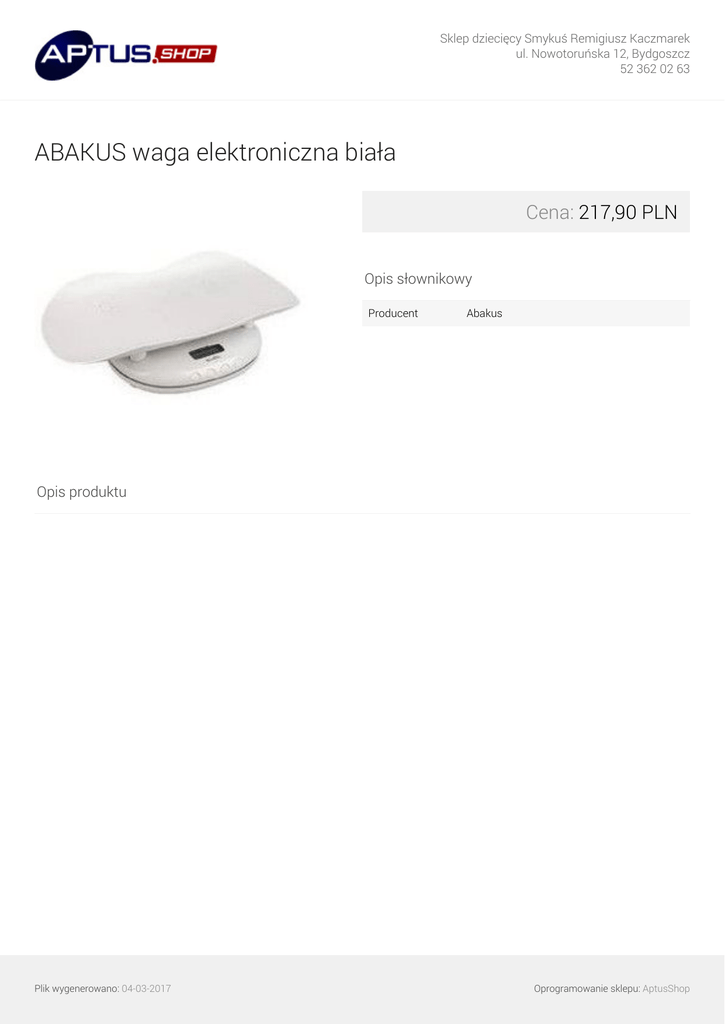 Sklep dziecięcy Smykuś Remigiusz Kaczmarek ul. Nowotoruńska 12, Bydgoszcz 52 362 02 63 ABAKUS waga elektroniczna biała Cena: 217,90 PLN Opis słownikowy Producent Abakus Opis produktu Plik wygenerowano: 04-03-2017 Powered by TCPDF (www.tcpdf.org) Oprogramowanie sklepu: AptusShop