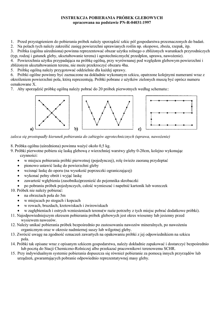INSTRUKCJA POBIERANIA PRÓBEK GLEBOWYCH opracowana na podstawie PN-R-04031:1997 1. Przed przystąpieniem do pobierania próbek należy sporządzić szkic pól gospodarstwa przeznaczonych do badań. 2. Na polach tych należy zakreślić zasięg powierzchni uprawianych roślin np. okopowe, zboża, rzepak, itp. 3. Próbka (ogólna uśredniona) powinna reprezentować obszar użytku rolnego o zbliżonych warunkach przyrodniczych (typ, rodzaj i gatunek gleby, ukształtowanie terenu) i agrotechnicznych( przedplon, uprawa, nawożenie). 4. Powierzchnia użytku przypadająca na próbkę ogólną, przy wyrównanej pod względem glebowym powierzchni i zbliżonym ukształtowaniem terenu, nie może przekroczyć obszaru 4ha. 5. Próbkę ogólną należy przygotować oddzielnie dla każdej uprawy. 6. Próbki ogólne powinny być zaznaczone na dokładnie wykonanym szkicu, opatrzone kolejnymi numerami wraz z określeniem powierzchni pola, którą reprezentują. Próbki pobrane z użytków zielonych muszą być oprócz numeru oznakowane X. 7. Aby sporządzić próbkę ogólną należy pobrać do 20 próbek pierwotnych według schematu:: zaleca się prostopadły kierunek pobierania do zabiegów agrotechnicznych (uprawa, nawożenie) 8. Próbka ogólna (uśredniona) powinna ważyć około 0,5 kg. 9. Próbki pierwotne pobiera się laską glebową z wierzchniej warstwy gleby 0-20cm, kolejno wykonując czynności: w miejscu pobierania próbki pierwotnej (pojedynczej), rolę świeżo zaoraną przydeptać pionowo ustawić laskę do powierzchni gleby wcisnąć laskę do oporu (na wysokość poprzeczki ograniczającej) wykonać pełny obrót i wyjąć laskę zawartość wgłębienia (zasobnika)przenieść do pojemnika skrobaczki po pobraniu próbek pojedynczych, całość wymieszać i napełnić kartonik lub woreczek 10. Próbek nie należy pobierać: na obrzeżach pola do 5m w miejscach po stogach i kopcach w rowach, bruzdach, kretowiskach i żwirowiskach w zagłębieniach i ostrych wzniesieniach terenu(w razie potrzeby z tych miejsc pobrać dodatkowe próbki). 11. Najodpowiedniejszym okresem pobierania próbek glebowych jest okres wiosenny lub jesienny przed wysiewem nawozów. 12. Należy unikać pobierania próbek bezpośrednio po zastosowaniu nawozów mineralnych, po nawożeniu organicznym oraz w okresie nadmiernej suszy lub wilgotnej gleby. 13. Zwrócić uwagę na zgodność oznaczeń zawartych na opakowaniu próbki z jej odpowiednikiem na szkicu pola. 14. Próbki tak opisane wraz z opisanym szkicem gospodarstwa, należy dokładnie zapakować i dostarczyć bezpośrednio lub pocztą do Stacji Chemiczno-Rolniczej albo przekazać pracownikowi terenowemu SCHR. 15. Przy indywidualnym systemie pobierania dopuszcza się również pobieranie za pomocą innych przyrządów lub urządzeń, gwarantujących pobranie odpowiednio reprezentatywnej masy gleby.
