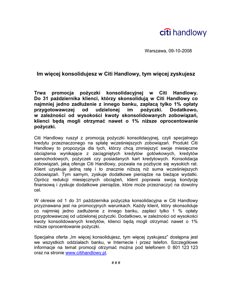 Warszawa, 09-10-2008 Im więcej konsolidujesz w Citi Handlowy, tym więcej zyskujesz Trwa promocja pożyczki konsolidacyjnej w Citi Handlowy. Do 31 października klienci, którzy skonsolidują w Citi Handlowy co najmniej jedno zadłużenie z innego banku, zapłacą tylko 1% opłaty przygotowawczej od udzielonej im pożyczki. Dodatkowo, w zależności od wysokości kwoty skonsolidowanych zobowiązań, klienci będą mogli otrzymać nawet o 1% niższe oprocentowanie pożyczki. Citi Handlowy ruszył z promocją pożyczki konsolidacyjnej, czyli specjalnego kredytu przeznaczonego na spłatę wcześniejszych zobowiązań. Produkt Citi Handlowy to propozycja dla tych, którzy chcą zmniejszyć swoje miesięczne obciążenia wynikające z zaciągniętych kredytów gotówkowych, kredytów samochodowych, pożyczek czy posiadanych kart kredytowych. Konsolidacja zobowiązań, jaką oferuje Citi Handlowy, pozwala na pozbycie się wysokich rat. Klient uzyskuje jedną ratę i to znacznie niższą niż suma wcześniejszych zobowiązań. Tym samym, zyskuje dodatkowe pieniądze na bieżące wydatki. Oprócz redukcji miesięcznych obciążeń, klient poprawia swoją kondycję finansową i zyskuje dodatkowe pieniądze, które może przeznaczyć na dowolny cel. W okresie od 1 do 31 października pożyczka konsolidacyjna w Citi Handlowy przyznawana jest na promocyjnych warunkach. Każdy klient, który skonsoliduje co najmniej jedno zadłużenie z innego banku, zapłaci tylko 1 % opłaty przygotowawczej od udzielonej pożyczki. Dodatkowo, w zależności od wysokości kwoty konsolidowanych kredytów, klienci będą mogli otrzymać nawet o 1% niższe oprocentowanie pożyczki. Specjalna oferta „Im więcej konsolidujesz, tym więcej zyskujesz” dostępna jest we wszystkich oddziałach banku, w Internecie i przez telefon. Szczegółowe informacje na temat promocji otrzymać można pod telefonem 0 801 123 123 oraz na stronie www.citihandlowy.pl. ### Dodatkowych informacji udzielają: Paweł Zegarłowicz, Dyrektor Biura Prasowego, tel. (0-22) 657 72 97 E-mail: [email protected] Dorota Szostek, e-mail: [email protected], tel. (0-22) 22 690 1049 Bank Handlowy w Warszawie S.A. to jedna z największych instytucji finansowych w Polsce, oferująca pod marką Citi Handlowy bogaty i nowoczesny asortyment produktów i usług bankowości korporacyjnej, inwestycyjnej i detalicznej. Bank Handlowy obsługuje 20 tys. klientów korporacyjnych i 800 tys. klientów indywidualnych poprzez nowoczesne kanały dystrybucji oraz sieć ponad 188 oddziałów. W skład grupy kapitałowej Banku wchodzą takie podmioty jak: Dom Maklerski Banku Handlowego i Handlowy Leasing. Przynależność do Citigroup, największej na świecie instytucji finansowej, zapewnia klientom Banku Handlowego dostęp do usług finansowych w ponad 100 krajach. Dodatkowe informacje można uzyskać na stronie internetowej www.citihandlowy.pl. Citi (NYSE:C) to wiodąca globalna firma świadcząca usługi finansowe. Obsługuje około 200 milionów klientów indywidualnych, korporacyjnych, rządowych i instytucjonalnych w ponad 100 krajach. Zapewnia bogaty wachlarz produktów i usług finansowych, jak bankowość komercyjna i inwestycyjna, bankowość detaliczna, kredytowanie, ubezpieczenia, usługi na rynków papierów wartościowych i zarządzanie aktywami. Główne marki pod znakiem handlowym Citigroup to Citibank, CitiFinancial, Primerica, Smith Barney i Banamex. Dodatkowe informacje można uzyskać na stronie internetowej www.citigroup.com.