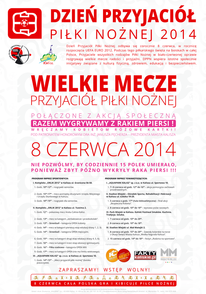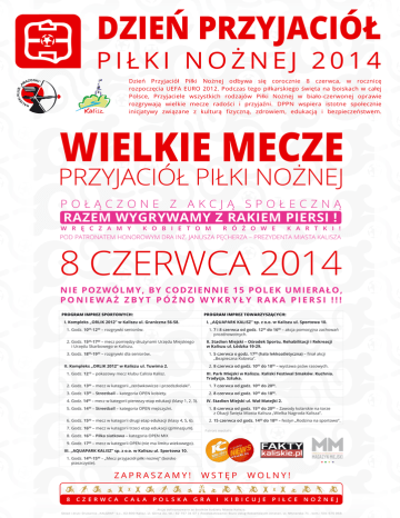 DZIEŃ PRZYJACIÓŁ PIŁKI NOŻNEJ 2014 Dzień Przyjaciół Piłki Nożnej odbywa się corocznie 8 czerwca, w rocznicę rozpoczęcia UEFA EURO 2012. Podczas tego piłkarskiego święta na boiskach w całej Polsce, Przyjaciele wszystkich rodzajów Piłki Nożnej w biało-czerwonej oprawie rozgrywają wielkie mecze radości i przyjaźni. DPPN wspiera istotne społecznie inicjatywy związane z kulturą fizyczną, zdrowiem, edukacją i bezpieczeństwem. WIELKIE MECZE PRZYJACIÓŁ PIŁKI NOŻNEJ POŁĄCZONE Z AKCJĄ SPOŁECZNĄ RAZEM WYGRYWAMY Z RAKIEM PIERSI ! W R Ę C Z A M Y K O B I E T O M R Ó Ż O W E K A R T K I ! POD PATRONATEM HONOROWYM DRA INŻ. JANUSZA PĘCHERZA – PREZYDENTA MIASTA KALISZA 8 CZERWCA 2014 NIE POZWÓLMY, BY CODZIENNIE 15 POLEK UMIERAŁO, PONIEWAŻ ZBYT PÓŹNO WYKRYŁY RAKA PIERSI !!! PROGRAM IMPREZ SPORTOWYCH: PROGRAM IMPREZ TOWARZYSZĄCYCH: I. Kompleks „ORLIK 2012” w Kaliszu ul. Graniczna 56-58. I. „AQUAPARK KALISZ” sp. z o.o. w Kaliszu ul. Sportowa 10. 1. Godz. 1000-1200 – rozgrywki seniorów. 1. 7 i 8 czerwca od godz. 1200 do 1600 – akcja pomocyjna zachowań prozdrowotnych. 2. Godz. 1500-1700 – mecz pomiędzy drużynami Urzędu Miejskiego i Urzędu Skarbowego w Kaliszu. 3. Godz. 1800-1930 – rozgrywki dla seniorów. II. Stadion Miejski – Ośrodek Sportu, Rehabilitacji i Rekreacji w Kaliszu ul. Łódzka 19-29. 1. 5 czerwca o godz. 1700 (hala lekkoatletyczna) – finał akcji „Bezpieczna Kobieta”. II. Kompleks „ORLIK 2012” w Kaliszu ul. Tuwima 2. 2. 8 czerwca od godz. 1000 do 1800 – wystawa psów rasowych. 1. Godz. 1210 – pokazowy mecz klubu Calisia Kalisz. III. Park Miejski w Kaliszu. Kaliski Festiwal Smaków. Kuchnia. Tradycja. Sztuka. 2. Godz. 1300 – mecz w kategorii „zerówkowicze i przedszkolaki”. 1. 7 czerwca od godz. 1000 do 2000. 3. Godz. 1300 – Streetball – kategoria OPEN kobiety. 2. 8 czerwca od godz. 1000 do 1800. 4. Godz. 1400 – mecz w kategorii pierwszy etap edukacji (klasy 1, 2, 3). IV. Stadion Miejski ul. Wał Matejki 2. 5. Godz. 1430 – Streetball – kategoria OPEN mężczyźni. 1. 8 czerwca od godz. 1500 do 2000 – Zawody kolarskie na torze z Okazji Święta Miasta Kalisza „Wielka Nagroda Kalisza”. 6. Godz. 1500 – mecz w kategorii drugi etap edukacji (klasy 4, 5, 6). 2. 15 czerwca od godz. 1400 do 1800 – festyn „Rodzina na sportowo”. 7. Godz. 1600 – mecz w kategorii trzeci etap edukacji (gimnazjum). Patroni medialni: 8. Godz. 1620 – Piłka siatkowa – kategoria OPEN MIX 9. Godz. 1700 – mecz w kategorii OPEN (nie ma limitu wiekowego). III. „AQUAPARK KALISZ” sp. z o.o. w Kaliszu ul. Sportowa 10. 1. Godz. 1400-1500 – „Mecz przyjaciół piłki nożnej” (boisko piaszczyste). ZAPRASZAMY! 8 CZERWCA CAŁA POLSKA WSTĘP GRA I WOLNY! KIBICUJE PIŁCE NOŻNEJ Akcję dofinansowano ze środków budżetu Miasta Kalisza. Skład i druk: Drukarnia „KALGRAF” s.c., 62-800 Kalisz, ul. Górna 2a, tel.: 62 757 31 07 | Rozplakatowanie: Biuro Usług Reklamowych Jonatan, ul. Młynarska 71 , kom.: 501 575 968