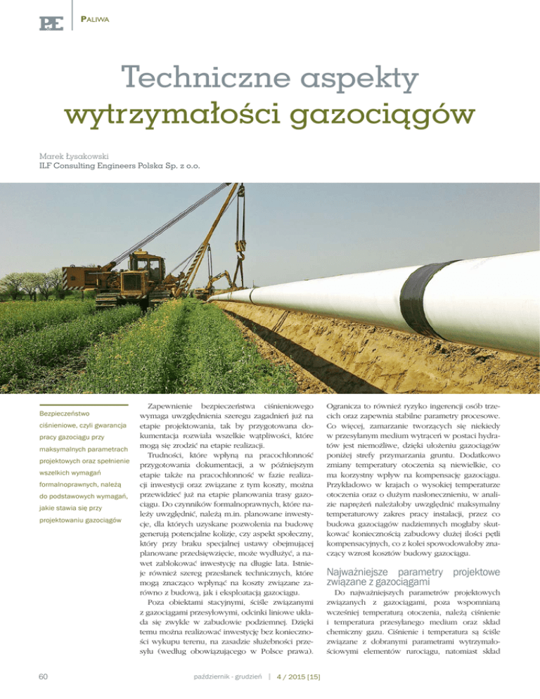 PALIWA Techniczne aspekty wytrzymałości gazociągów Marek Łysakowski ILF Consulting Engineers Polska Sp. z o.o. Bezpieczeństwo ciśnieniowe, czyli gwarancja pracy gazociągu przy maksymalnych parametrach projektowych oraz spełnienie wszelkich wymagań formalnoprawnych, należą do podstawowych wymagań, jakie stawia się przy projektowaniu gazociągów 60 Zapewnienie bezpieczeństwa ciśnieniowego wymaga uwzględnienia szeregu zagadnień już na etapie projektowania, tak by przygotowana dokumentacja rozwiała wszelkie wątpliwości, które mogą się zrodzić na etapie realizacji. Trudności, które wpłyną na pracochłonność przygotowania dokumentacji, a w późniejszym etapie także na pracochłonność w fazie realizacji inwestycji oraz związane z tym koszty, można przewidzieć już na etapie planowania trasy gazociągu. Do czynników formalnoprawnych, które należy uwzględnić, należą m.in. planowane inwestycje, dla których uzyskane pozwolenia na budowę generują potencjalne kolizje, czy aspekt społeczny, który przy braku specjalnej ustawy obejmującej planowane przedsięwzięcie, może wydłużyć, a nawet zablokować inwestycję na długie lata. Istnieje również szereg przesłanek technicznych, które mogą znacząco wpłynąć na koszty związane zarówno z budową, jak i eksploatacją gazociągu. Poza obiektami stacyjnymi, ściśle związanymi z gazociągami przesyłowymi, odcinki liniowe układa się zwykle w zabudowie podziemnej. Dzięki temu można realizować inwestycję bez konieczności wykupu terenu, na zasadzie służebności przesyłu (według obowiązującego w Polsce prawa). październik - grudzień 4 / 2015 [15] Ogranicza to również ryzyko ingerencji osób trzecich oraz zapewnia stabilne parametry procesowe. Co więcej, zamarzanie tworzących się niekiedy w przesyłanym medium wytrąceń w postaci hydratów jest niemożliwe, dzięki ułożeniu gazociągów poniżej strefy przymarzania gruntu. Dodatkowo zmiany temperatury otoczenia są niewielkie, co ma korzystny wpływ na kompensację gazociągu. Przykładowo w krajach o wysokiej temperaturze otoczenia oraz o dużym nasłonecznieniu, w analizie naprężeń należałoby uwzględnić maksymalny temperaturowy zakres pracy instalacji, przez co budowa gazociągów nadziemnych mogłaby skutkować koniecznością zabudowy dużej ilości pętli kompensacyjnych, co z kolei spowodowałoby znaczący wzrost kosztów budowy gazociągu. Najważniejsze parametry projektowe związane z gazociągami Do najważniejszych parametrów projektowych związanych z gazociągami, poza wspomnianą wcześniej temperaturą otoczenia, należą ciśnienie i temperatura przesyłanego medium oraz skład chemiczny gazu. Ciśnienie i temperatura są ściśle związane z dobranymi parametrami wytrzymałościowymi elementów rurociągu, natomiast skład PALIWA Paliwa i Energetyka chemiczny gazu wpływa na aspekty eksploatacyjne i procesowe. Szczególnie ważna jest szybkość zachodzącej korozji i ilość tworzących się hydratów, dlatego na etapie projektu „procesowego” przewiduje się szereg urządzeń, armaturę i inne zabiegi techniczne, umożliwiające zoptymalizowanie parametrów przesyłanego medium oraz dostosowanie do pracy z już istniejącą siecią przesyłową. W tym celu buduje się obiekty gazowe w postaci tłoczni gazu, stacje gazowe czy magazyny gazu. W zależności od potrzeb procesowych oraz eksploatacyjnych, na obiektach gazowych projektuje się układy technologiczne z urządzeniami w postaci filtroseparatorów lub filtrów, śluz nadania i odbioru tłoków inspekcyjnych, układów redukcji lub regulacji ciśnienia, odwadniaczy, elementów armatury zaporowej, upustowej, bezpieczeństwa oraz urządzeń kontrolnych, pu otwartego i w rezultacie powstaje konieczność przekroczeń metodami bezwykopowymi, jak np. przewiert sterowany HDD (jary, kaniony, rzeki o głębokich korytach itp.). Dodatkowo duża różnica wysokości terenu generuje trudności z kontrolą ciśnienia na etapie prób hydraulicznych oraz problemy z usunięciem potencjalnych hydratów, przez co niekiedy konieczna jest budowa dodatkowych obiektów związanych z lokalnymi odwadniaczami. pomiarowych i innych. Zdarza się, że we wstępnej fazie projektowania konieczne jest uwzględnienie kotłowni, nawanialni gazu oraz innych obiektów związanych ściśle lub pośrednio z eksploatacją gazociągów. Jeżeli w niedalekiej przyszłości przewidywane jest wykonanie potencjalnych przyłączy czy rozbudowa sieci przesyłowej, należy zaplanować wyizolowane armaturą odcinki umożliwiające włączenie bez konieczności zatrzymania pracy instalacji gazowej. Przyłącze może zostać także wykonane w technologii hermetycznej, jednak koszty jego realizacji są dużo większe w stosunku do standardowo wykonanego przyłącza. Wymienione aspekty determinują lokalizację gazociągu pod kątem przesyłu gazu – największą bowiem trudnością budowy obiektów gazowych jest uzyskanie prawa własności do terenu. Sam odcinek liniowy, łączący obiekty gazowe, ma pewną ograniczoną dowolność pod względem lokalizacyjnym, jednak przed ostatecznym zawężeniem korytarza przesyłowego (przed decyzją lokalizacyjną) warto rozważyć kilka opcji tras i rozpoznać dla nich potencjalne kolizje nadziemne i podziemne oraz trudności związane z posadowieniem gazociągu i przekroczeniem poszczególnych skrzyżowań w celu optymalizacji trasy. Istotnym czynnikiem jest także ukształtowanie terenu i dostęp do akwenów wodnych z możliwością poboru i zrzutu wody na potrzeby wytrzymałościowych prób hydraulicznych. Przy uwzględnieniu ograniczeń wynikających z naturalnej elastyczności rurociągu, a co za tym idzie z możliwością ugięcia gazociągu, mogą powstać trudności przejścia gazociągu metodą wyko- -budowlanych, związanych m.in. z wymianą gruntów nienośnych (czasami nawet kilkadziesiąt metrów) lub z wykorzystaniem adekwatnych konst