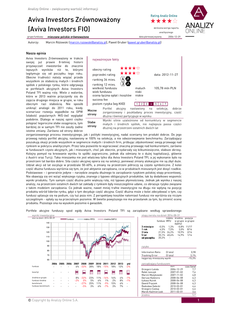 Analizy Online - zwiększamy wartość informacji Aviva Investors Zrównoważony (Aviva Investors FIO) analitycznego mieszane polskie zrównoważone grupa funduszy: Autorzy: skrócona wersja raportu data pierwszej wyceny 2006-12-29 Marcin Różowski ([email protected]), Paweł Gruber ([email protected]) Nasza opinia Aviva Investors Zrównoważony w trakcie najważniejsze fakty swojej już prawie 8-letniej historii przyzwyczaił inwestorów do znacznie obecny rating lepszych wyników niż te, którymi legitymuje się od początku tego roku. poprzedni rating data: 2012-11-27 Obecne trudności należy wiązać przede ranking 36 mies. wszystkim ze słabością małych i średnich ranking 12 mies. spółek z polskiego rynku, które odgrywają wielkość funduszu maluch 105,78 mln PLN w portfelach akcyjnych Aviva Investors wiek funduszu niski Poland TFI ważną rolę. Wiele z walorów, ocena łączna opłat i kosztów niskie które w 2013 walnie przyczyniły się do success fee zajęcia drugiego miejsca w grupie, w roku poziom ryzyka (wg KIID) 1 2 3 4 5 6 7 obecnym razi słabością. Nie sposób uniknąć analogii do 2011 roku, kiedy Portfel akcyjny nastawiony na selekcję, dobrze Mocne scenariusz rozwoju wypadków na GPW zorganizowany i poukładany proces inwestycyjny, część strony (słabość popularnych MiŚ-ów) wyglądał dłużna również partycypuje w wyniku podobnie. Dlatego w naszej opinii ciężko Wyniki silnie uzależnione od koniunktury w segmencie Słabe potępiać tegoroczne słabe osiągnięcia, tym małych i średnich spółek, nie najlepsza passa części strony bardziej że w samym TFI nie zaszły żadne dłużnej na przestrzeni ostatnich dwóch lat istotne zmiany. Zarówno od strony dobrze zorganizowanego procesu inwestycyjnego, jak i polityki inwestycyjnej, nadal oceniamy ten produkt dobrze. Do jego przewag należy portfel akcyjny, nastawiony w 100% na selekcję, a nie odwzorowywanie benchmarku. Zarządzający poszukują okazji przede wszystkim w segmencie małych i średnich firm, próbując zdyskontować swoją przewagę nad rynkiem w pokryciu analitycznym. Przez lata pozwoliło to wypracować znaczną przewagę nad konkurentami, zarówno w funduszach czysto akcyjnych, jak i mieszanych, choć jak obecnie, przydarzały się kilkumiesięczne, słabsze okresy. Kolejny pomysł na kreowanie wyniku to spółki zagraniczne, jednak dla odmiany te o dużej kapitalizacji, głównie z Austrii oraz Turcji. Taka mieszanka nie jest właściwa tylko dla Aviva Investors Poland TFI, a jej wykonanie było na przestrzeni lat bardzo dobre. Siła części akcyjnej opiera się na selekcji, ponieważ zmiany alokacyjne nie są zbyt duże. Udział akcji od lat oscyluje w przedziale 50-60%, a zmiany na przestrzeni półroczy są często symboliczne. Z kolei część dłużna funduszu wyróżnia się tym, że jest aktywnie zarządzana, co w produktach mieszanych jest dosyć rzadkie. Podstawowe – i generalnie jedyne – narzędzie zespołu dłużnego to zarządzanie ryzykiem polskiej stopy procentowej. Nie obawiają się oni wziąć większego ryzyka, znanego z typowo obligacyjnych produktów, tak by dodatkowo wspomóc wyniki produktu. Tym samym część dłużna pełni większą rolę, niż typowo płynnościową. Jednak jak wynika z naszej analizy, na przestrzeni ostatnich dwóch lat zakłady z rynkiem były nieszczególnie udane, co obrazuje ryzyko związane z takim modelem zarządzania. Co jednak ważne, nawet mniej trafne inwestycyjne na długu nie wpłyną na pozycję produktu wśród liderów rynku, gdyż o tym decyduje część akcyjna. Część dłużna może z kolei zdecydować o tym, czy fundusz uplasuje się na podium, czy tuż poza nim. Z perspektywy kosztów natomiast fundusz nie wyróżnia się niczym szczególnym - opłaty są na przeciętnym poziomie. W świetle powyższego nie ma przesłanek za tym, by zmienić ocenę produktu. Pozostaje ona na wysokim poziomie 4 gwiazdek. Portfele akcyjne funduszy spod egidy Aviva Investors Poland TFI są zarządzane według sprawdzonego wyniki inwestycyjne stopy zwrotu na dzień 2014-08-31 stan na dzień: 2014-08-29 fundusz indeks IRFU indeks średnia pozycja fundusz IRFU w grupie w grupie (SAFU) 3 miesiące -0,5% 1,3% -0,8% 11/17 1 rok 4,5% 7,5% 3,0% 8/16 3 lata 21,5% 24,2% 10,9% 2/16 5 lat 35,1% 40,6% 14,9% 1/14 od początku 20,2% - średnia SAFU 140 130 120 110 100 ryzyko 90 80 Information Ratio (3 lata) Tracking Error (3 lata) najgorszy miesięczny wynik 70 60 fundusz 2004 2005 2006 2007 2008 2009 2010 2011 2012 2013 6% -32% 28% 18% -15% 18% 12% kwartyl - - - średnia w grupie fundusz-średnia benchmark fundusz-benchmark - - - 8% -32% -2% 0% -27% -5% © Copyright by Analizy Online S.A. 23% 5% 25% 3% 11% -16% 6% 1% 11% -9% 6% -7% 16% 2% 15% 3% 4% 8% 6% 7% ytd -2% -1% -1% - 0,98 3,1% -15,3% zarządzający funduszem start Grzegorz Latała Rafał Janczyk Marcin Mężykowski Dariusz Kędziora Łukasz Kurek Dawid Frączek Radosław Gałecki Grzegorz Czekaj Marek Kaźmierczak średnio 2006-12-29 2007-01-02 2007-11-02 2008-04-08 2008-04-08 2008-04-08 2010-03-01 2010-03-01 2011-03-01 czas (lata) 7,7 7,6 6,8 6,3 6,3 6,3 4,4 4,4 3,4 5,9 1 Analizy Online - zwiększamy wartość informacji Aviva Investors Zrównoważony (Aviva Investors FIO) grupa funduszy: Autorzy: skrócona wersja raportu analitycznego mieszane polskie zrównoważone data pierwszej wyceny 2006-12-29 Marcin Różowski ([email protected]), Paweł Gruber ([email protected]) i praktykowanego już od kilku lat w tej instytucji schematu. Zarządzający poszukują swojej przewagi nad konkurencją przede wszystkim w sektorze małych i średnich przedsiębiorstw. Pokrycie tego segmentu rynku ma docelowo pozwolić wyłuskać na krajowym parkiecie potencjalne gwiazdy, zanim inni inwestorzy instytucjonalni zaczną się nimi interesować. Najlepszą recenzją takiej polityki inwestycyjnej są bardzo wysokie stopy zwrotu produktów akcyjnych i mieszanych w długim terminie. Trzeba jednak mieć 